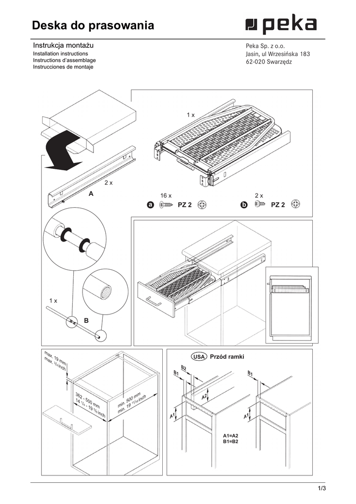 Deska do prasowania Instrukcja montażu Peka Sp. z o.o. Jasin, ul Wrzesińska 183 62-020 Swarzędz Installation instructions Instructions d’assemblage Instrucciones de montaje 1x 2x A 16 x 2x a b PZ 2 PZ 2 1x B ma x ma . 19 x. 3 mm /4 in ch USA Przód ramki B1 36 2 1 4 1 - 500 /4 - mm 19 5 /6 in ch m 0 m ch 50 11/16 in . min. 19 min B2 B1 A2 A1 A1 A1=A2 B1=B2 1/3 Mocowanie szyny prowadzącej Befestigung der Korpusschiene Mounting of cabinet rail Fixation du rail du corps Fijación del carril del cuerpo ≤ 19 mm ≤ 3/4 inch D (mm) E (mm) D (inch) E (inch) 32 mm 117/64 inch ≥ 30 mm ≥ 13/16 inch 1 37 mm 115/32 inch 416 mm 16 3/8 inch 25 32 / 3 3/8 20 86 30 76 1 3/16 40 66 37 64 1 / 2 19/32 50 66 1 31/32 2 19/32 2 3 3 12 x a Wprowadzanie deski do prasowania przez lekkie naciśnięcie rączki. To return ironing board slight push on stop lug Pour rentrer la planche à repasser appuyer légèrement sur le tenon d'arrêt La tabla se introduce, apretando ligeramente sobre la pestaña encastrable 4 A B 5 Uwaga! Zamontować deskę do prasowania centralnie w otworze szuflady. Attention! Mount ironing board in centre of the cabinet opening Attention! Fixer la planche à repasser au centre de l'ouverture du corps Atencion! Montar la tabla de planchar en el centro de la apertura del cuerpo SW 3 Regulacja szerokości Adjustment of width Réglage de la largeur Ajusta de la anchura 2/3 362-500 mm / 141/4-195/8cal 362-500 mm / 141/4-195/8 inch 362-500 mm / 141/4-195/8 inch 362-500 mm / 141/4-195/8 inch Montaż i regulacja panelu Mounting and adjustment of panel Fixation et réglage de la façade Fijación y ajuste del panel D (mm) F (mm) D (inch) F (inch) 102 25 32 4 30 92 3 16 1 / 3 5/8 40 82 1 37/64 3 1/4 50 82 1 31/32 3 1/4 20 AB A D / x F-x D 42 mm 113/20 inch 7 42 /20 mm inc h 5 13 5 y+ 6 y+ 1 y 16 /8 mm in ch B 42 mm 113/20 inch 16 /8 mm in ch Fx F 8 9 4x a 2x b Ostateczna regulacja Fine adjustment Mise au point fine Ajuste fino 10 0 mm Regulacja części dolnej deski do prasowania Lower ironing board for adjustment Pour régler, abaisser la planche à repasser Para hacer el ajuste, rebajar la tabla Dostosować się do 0 mm Adjust to 0 mm Régler à 0 mm Ajustar a 0 mm Pokrowiec na deskę do prasowanie nałożyć po zakończeniu montażu. Nach Einabu muss das Bügeltuch über das Bügelbrett gezogen werden! Pull ironing board cover over ironing board after installation. Après le montage, enfiler la housse sur la planche à repasser. Finalizado el montaje, coloque la funda sobre la tabla de planchar. 3/3