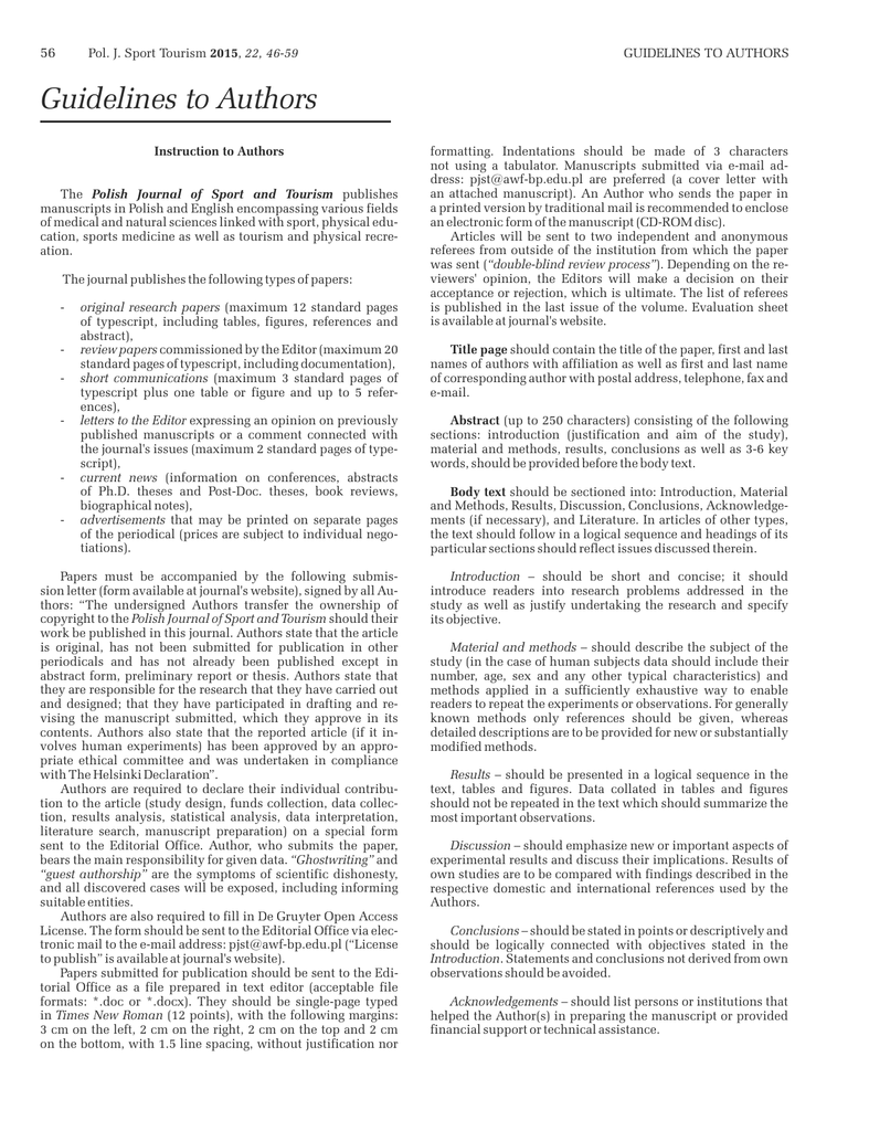 56 Pol. J. Sport Tourism 2015, 22, 46-59 GUIDELINES TO AUTHORS Guidelines to Authors Instruction to Authors The Polish Journal of Sport and Tourism publishes manuscripts in Polish and English encompassing various fields of medical and natural sciences linked with sport, physical education, sports medicine as well as tourism and physical recreation. The journal publishes the following types of papers: - - original research papers (maximum 12 standard pages of typescript, including tables, figures, references and abstract), review papers commissioned by the Editor (maximum 20 standard pages of typescript, including documentation), short communications (maximum 3 standard pages of typescript plus one table or figure and up to 5 references), letters to the Editor expressing an opinion on previously published manuscripts or a comment connected with the journal's issues (maximum 2 standard pages of typescript), current news (information on conferences, abstracts of Ph.D. theses and Post-Doc. theses, book reviews, biographical notes), advertisements that may be printed on separate pages of the periodical (prices are subject to individual negotiations). Papers must be accompanied by the following submission letter (form available at journal's website), signed by all Authors: “The undersigned Authors transfer the ownership of copyright to the Polish Journal of Sport and Tourism should their work be published in this journal. Authors state that the article is original, has not been submitted for publication in other periodicals and has not already been published except in abstract form, preliminary report or thesis. Authors state that they are responsible for the research that they have carried out and designed; that they have participated in drafting and revising the manuscript submitted, which they approve in its contents. Authors also state that the reported article (if it involves human experiments) has been approved by an appropriate ethical committee and was undertaken in compliance with The Helsinki Declaration”. Authors are required to declare their individual contribution to the article (study design, funds collection, data collection, results analysis, statistical analysis, data interpretation, literature search, manuscript preparation) on a special form sent to the Editorial Office. Author, who submits the paper, bears the main responsibility for given data. “Ghostwriting” and “guest authorship” are the symptoms of scientific dishonesty, and all discovered cases will be exposed, including informing suitable entities. Authors are also required to fill in De Gruyter Open Access License. The form should be sent to the Editorial Office via electronic mail to the e-mail address: [email protected] (“License to publish” is available at journal's website). Papers submitted for publication should be sent to the Editorial Office as a file prepared in text editor (acceptable file formats: *.doc or *.docx). They should be single-page typed in Times New Roman (12 points), with the following margins: 3 cm on the left, 2 cm on the right, 2 cm on the top and 2 cm on the bottom, with 1.5 line spacing, without justification nor formatting. Indentations should be made of 3 characters not using a tabulator. Manuscripts submitted via e-mail address: [email protected] are preferred (a cover letter with an attached manuscript). An Author who sends the paper in a printed version by traditional mail is recommended to enclose an electronic form of the manuscript (CD-ROM disc). Articles will be sent to two independent and anonymous referees from outside of the institution from which the paper was sent (“double-blind review process”). Depending on the reviewers' opinion, the Editors will make a decision on their acceptance or rejection, which is ultimate. The list of referees is published in the last issue of the volume. Evaluation sheet is available at journal's website. Title page should contain the title of the paper, first and last names of authors with affiliation as well as first and last name of corresponding author with postal address, telephone, fax and e-mail. Abstract (up to 250 characters) consisting of the following sections: introduction (justification and aim of the study), material and methods, results, conclusions as well as 3-6 key words, should be provided before the body text. Body text should be sectioned into: Introduction, Material and Methods, Results, Discussion, Conclusions, Acknowledgements (if necessary), and Literature. In articles of other types, the text should follow in a logical sequence and headings of its particular sections should reflect issues discussed therein. Introduction – should be short and concise; it should introduce readers into research problems addressed in the study as well as justify undertaking the research and specify its objective. Material and methods – should describe the subject of the study (in the case of human subjects data should include their number, age, sex and any other typical characteristics) and methods applied in a sufficiently exhaustive way to enable readers to repeat the experiments or observations. For generally known methods only references should be given, whereas detailed descriptions are to be provided for new or substantially modified methods. Results – should be presented in a logical sequence in the text, tables and figures. Data collated in tables and figures should not be repeated in the text which should summarize the most important observations. Discussion – should emphasize new or important aspects of experimental results and discuss their implications. Results of own studies are to be compared with findings described in the respective domestic and international references used by the Authors. Conclusions – should be stated in points or descriptively and should be logically connected with objectives stated in the Introduction. Statements and conclusions not derived from own observations should be avoi