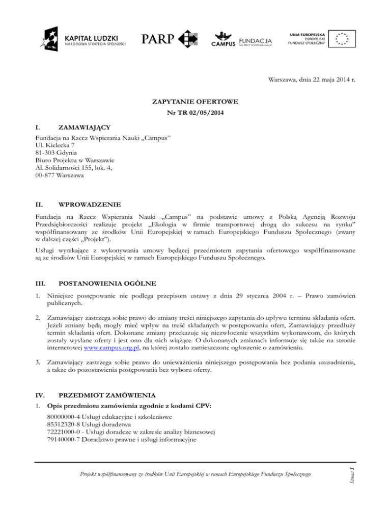 Warszawa, dnia 22 maja 2014 r. ZAPYTANIE OFERTOWE Nr TR 02/05/2014 I. ZAMAWIAJĄCY Fundacja na Rzecz Wspierania Nauki „Campus” Ul. Kielecka 7 81-303 Gdynia Biuro Projektu w Warszawie Al. Solidarności 155, lok. 4, 00-877 Warszawa II. WPROWADZENIE Fundacja na Rzecz Wspierania Nauki „Campus” na podstawie umowy z Polską Agencją Rozwoju Przedsiębiorczości realizuje projekt ,,Ekologia w firmie transportowej drogą do sukcesu na rynku” współfinansowany ze środków Unii Europejskiej w ramach Europejskiego Funduszu Społecznego (zwany w dalszej części „Projekt”). Usługi wynikające z wykonywania umowy będącej przedmiotem zapytania ofertowego współfinansowane są ze środków Unii Europejskiej w ramach Europejskiego Funduszu Społecznego. III. POSTANOWIENIA OGÓLNE 1. Niniejsze postępowanie nie podlega przepisom ustawy z dnia 29 stycznia 2004 r. – Prawo zamówień publicznych. 2. Zamawiający zastrzega sobie prawo do zmiany treści niniejszego zapytania do upływu terminu składania ofert. Jeżeli zmiany będą mogły mieć wpływ na treść składanych w postępowaniu ofert, Zamawiający przedłuży termin składania ofert. Dokonane zmiany przekazuje się niezwłocznie wszystkim wykonawcom, do których zostały wysłane oferty i jest ono dla nich wiążące. O dokonanych zmianach informuje się także na stronie internetowej www.campus.org.pl, na której zostało zamieszczone ogłoszenie o zamówieniu. 3. Zamawiający zastrzega sobie prawo do unieważnienia niniejszego postępowania bez podania uzasadnienia, a także do pozostawienia postępowania bez wyboru oferty. IV. PRZEDMIOT ZAMÓWIENIA 1. Opis przedmiotu zamówienia zgodnie z kodami CPV: Projekt współfinansowany ze środków Unii Europejskiej w ramach Europejskiego Funduszu Społecznego Strona 1 80000000-4 Usługi edukacyjne i szkoleniowe 85312320-8 Usługi doradztwa 72221000-0 - Usługi doradcze w zakresie analizy biznesowej 79140000-7 Doradztwo prawne i usługi informacyjne Opis przedmiotu zamówienia: Przedmiotem zamówienia są usługi związane z realizacją doradztwa dla przedsiębiorstw: A. DORADZTWA W ZAKRESIE AUDYTU EKOLOGICZNEGO poprzedzającego wszystkie działania w projekcie i zakończone sporządzeniem raportu, na bazie którego zostanie stworzony program szkoleń dla kadry zarządzającej oraz indywidualne programy doradztwa środowiskowego dla pracowników każdej z firm. Wynikiem doradztwa będzie analiza potrzeb przedsiębiorstwa, która ma na celu wskazanie w każdym przedsiębiorstwie objętym wsparciem obszarów, w których należy przeprowadzić działania proekologiczne, w tym także określenie luk kompetencyjnych i tematyki szkoleń niezbędnych do przeprowadzenia tych działań. AUDYT EKOLOGICZNY określi także zakres działań doradczych niezbędnych przedsiębiorstwu (Wykonawca przedstawi pisemną rekomendację co do działań jakie klient powinien podjąć, aby osiągnąć wyznaczony przez siebie cel). Wspomniane niezbędne przedsiębiorstwu działania doradcze w całości bądź w części zostaną zrealizowane w ramach projektu (w ramach części B doradztwa). B. DORADZTWA ŚRODOWISKOWEGO, obejmującego: zarządzanie środowiskowe w firmie transportowej, marketing i wizerunek marki, efektywność paliwową / efektywność transportową. Rezultatem doradztwa dla każdego z przedsiębiorstw będzie program lub plan wdrażania konkretnych działań proekologicznych zawierający: a. opis zidentyfikowanych obszarów, dla których należy przeprowadzać takie działania oraz b. wymierne wskaźniki ekonomiczne, jakie posłużą ocenie skuteczności takiego programu lub planu po jego zakończeniu c. lub aktualizacja takiego dokumentu w ww. zakresie, jeśli taki dokument już istnieje Średnio dla każdej firmy przewidziano łącznie 40 godzin doradztwa (20 godzin doradztwa w zakresie audytu ekologicznego oraz 20 godzin doradztwa w zakresie środowiskowym). Planuje się objąć wsparciem 38 przedsiębiorstw. Maksymalna liczba godzin doradczych wynosi 1520. Liczba faktycznie zrealizowanych godzin uzależniona będzie od zapotrzebowania przedsiębiorstwa. Doradztwo będzie realizowane od momentu podpisania umowy z Wykonawcą do 30 czerwca 2015. Doradztwo będzie realizowane: w siedzibie przedsiębiorcy (na terenie całej Polski) lub we wskazanych lokalizacjach na terenie Warszawy (Zamawiający zapewni odpowiedni lokal na realizację doradztwa). Decyzję o miejscu realizacji doradztwa podejmuje przedsiębiorca. Wykonawcy będą informowani o miejscu i czasie realizacji usługi doradczej z minimum 7 dniowym wyprzedzeniem. W przypadku odwołania usługi przez przedsiębiorcę na co najmniej dzień przed realizacją usługi doradcy, Wykonawcy nie przysługuje wynagrodzenie. W przypadku realizacji doradztwa w siedzibie przedsiębiorcy, Zamawiający pokryje koszty dojazdu doradców (maksymalnie do kwoty wynikającej z wniosku o dofinansowanie projektu). Wykonawca ponosi wszystkie koszty związane z ewentualnym noclegiem oraz wyżywieniem doradcy. 2. Szczegółowy zakres zamówienia: Minimalny zakres doradztwa: Audyt ekologiczny Zarządzanie środowiskowe w przedsiębiorstwie. Opłaty za korzystanie ze środowiska wynikające z ustawy z 27 kwietnia 2001 r. Prawo ochrony środowiska. Polityka środowiskowa firmy transportowej - uwzględniająca wymagania ochrony środowiska. Budowanie ekologicznej marki firm z branży TSL. Projekt współfinansowany ze środków Unii Europejskiej w ramach Europejskiego Funduszu Społecznego Strona 2 a) b) c) d) e) f) g) h) i) j) k) l) m) n) o) p) q) r) s) t) Ekoinnowacja. Korzyści ekonomiczne wynikające z wdrożenia systemu zarządzania środowiskowego. Efektywność paliwowa. Efektywność transportowa. Zastosowanie technologii przyjaznych środowisku. Prawo transportowe. Identyfikacja zobowiązań prawnych z zakresu ochrony środowiska w przedsiębiorstwach z branży TSL (Transport Spedycja Logistyka). Klasyfikacja, magazynowanie i zasady zagospodarowania o