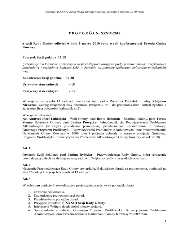 Protokół z XXXIV Sesji Rady Gminy Kowiesy w dniu 5 marca 2010 roku P R O T O K Ó Ł Nr XXXIV/2010 z sesji Rady Gminy odbytej w dniu 5 marca 2010 roku w sali konferencyjnej Urzędu Gminy Kowiesy Początek Sesji godzina 13.15 (przesunięcie o kwadrans rozpoczęcia Sesji nastąpiło z uwagi na podpisywanie umowy z wykonawcą przebudowy i rozbudowy budynku OSP w Jeruzalu na potrzeby społeczno- kulturalne mieszkańców wsi) Zakończenie Sesji godzina 14.30 Ustawowy stan radnych - 15 Faktyczny stan radnych - 13 W sesji uczestniczyło 13 radnych /nieobecni byli: radna Zuzanna Dudziak i radny Zbigniew Niewczas/ według załączonej listy obecności (załącznik nr 1 do protokołu) oraz sołtysi zgodnie z załączoną listą obecności (załącznik nr 2). W sesji udział wzięli: pan Andrzej Józef Luboiński – Wójt Gminy, pani Beata Heleniak – Skarbnik Gminy, pani Teresa Słoma- Sekretarz Gminy, pani Janina Powązka- Pełnomocnik ds. Rozwiązywania Problemów Alkoholowych (w części posiedzenia poświeconej przedstawieniu sprawozdania z realizacji Gminnego Programu Profilaktyki i Rozwiązywania Problemów Alkoholowych oraz Przeciwdziałania Narkomanii Gminy Kowiesy w 2009 roku i podjęcia uchwały w sprawie przyjęcia Gminnego Programu Profilaktyki i Rozwiązywania Problemów Alkoholowych Gminy Kowiesy na rok 2010). Ad. 1 Otwarcia Sesji dokonała pani Janina Rybicka – Przewodnicząca Rady Gminy, która serdecznie powitała przybyłych na dzisiejszą sesję radnych, Wójta, sołtysów i wszystkich obecnych. Ad. 2 Następnie Przewodnicząca Rady Gminy stwierdziła, iż dzisiejsze obrady są prawomocne, ponieważ na stan 15 radnych w sesji bierze udział 13 radnych. Ad. 3 W kolejnym punkcie Przewodnicząca posiedzenia przedstawiła porządek obrad: 1. 2. 3. 4. 5. 6. Otwarcie posiedzenia. Stwierdzenie prawomocności obrad. Przedstawienie porządku obrad. Przyjęcie protokołu z XXXIII Sesji Rady Gminy. Informacja Wójta o działalności między sesjami. Sprawozdanie z realizacji Gminnego Programu Profilaktyki i Rozwiązywania Problemów Alkoholowych oraz Przeciwdziałania Narkomanii Gminy Kowiesy w 2009 roku. 1 Protokół z XXXIV Sesji Rady Gminy Kowiesy w dniu 5 marca 2010 roku 7. Podjęcie uchwały w sprawie przyjęcia Gminnego Programu Profilaktyki i Rozwiązywania Problemów Alkoholowych Gminy Kowiesy na rok 2010. 8. Podjęcie uchwały w sprawie wyrażenia zgody na wyodrębnienie w budżecie gminy środków stanowiących fundusz sołecki. 9. Podjęcie uchwały w sprawie trybu udzielania i rozliczania dotacji dla niepublicznych szkół, przedszkoli oraz innych form wychowania przedszkolnego prowadzonych na terenie Gminy Kowiesy przez osoby prawne i fizyczne, a także trybu i zakresu kontroli prawidłowości ich wykorzystania. 10. Podjęcie uchwały w sprawie zmian budżetu i w budżecie gminy Kowiesy na 2010 rok. 11. Interpelacje i zapytania radnych. 12. Wolne wnioski i informacje. 13. Zamknięcie obrad. Z wnioskiem o zmianę porządku obrad wystąpił Wójt Gminy- Andrzej Józef Luboiński, który wnioskował o rozszerzenie porządku obrad o 2 punkty i wprowadzenie po punkcie 10: - punktu 11- podjęcie uchwały w sprawie nabycia nieruchomości - punktu 12- podjęcie uchwały w sprawie wyrażenia zgody na wydzierżawienie nieruchomości stanowiącej własność gminy dotychczasowemu dzierżawcy. Wniosek o rozszerzenie porządku obrad został poddany pod głosowanie. Za zmianą porządku obrad głosowało 13 radnych, nikt od głosu się nie wstrzymał, nikt nie głosował przeciw. Wniosek został przyjęty 13 głosami. Po zmianie porządek obrad przedstawia się następująco: 1. Otwarcie posiedzenia. 2. Stwierdzenie prawomocności obrad. 3. Przedstawienie porządku obrad. 4. Przyjęcie protokołu z XXXIII Sesji Rady Gminy. 5. Informacja Wójta o działalności między sesjami. 6. Sprawozdanie z realizacji Gminnego Programu Profilaktyki i Rozwiązywania Problemów Alkoholowych oraz Przeciwdziałania Narkomanii Gminy Kowiesy w 2009 roku. 7. Podjęcie uchwały w sprawie przyjęcia Gminnego Programu Profilaktyki i Rozwiązywania Problemów Alkoholowych Gminy Kowiesy na rok 2010. 8. Podjęcie uchwały w sprawie wyrażenia zgody na wyodrębnienie w budżecie gminy środków stanowiących fundusz sołecki. 9. Podjęcie uchwały w sprawie trybu udzielania i rozliczania dotacji dla niepublicznych szkół, przedszkoli oraz innych form wychowania przedszkolnego prowadzonych na terenie Gminy Kowiesy przez osoby prawne i fizyczne, a także trybu i zakresu kontroli prawidłowości ich wykorzystania. 10. Podjęcie uchwały w sprawie zmian budżetu i w budżecie gminy Kowiesy na 2010 rok. 11. Podjęcie uchwały w sprawie nabycia nieruchomości. 12. Podjęcie uchwały w sprawie wyrażenia zgody na wydzierżawienie nieruchomości stanowiącej własność gminy dotychczasowemu dzierżawcy. 13. Interpelacje i zapytania radnych. 14. Wolne wnioski i informacje. 15. Zamknięcie obrad. 2 Protokół z XXXIV Sesji Rady Gminy Kowiesy w dniu 5 marca 2010 roku Ad. 4 W następnym punkcie przystąpiono do przyjęcia protokołu z XXXIII Sesji Rady Gminy z dnia 26 stycznia 2010 r. Z uwagi na fakt, iż protokół był przesłany w materiałach treści protokołu nie odczytywano. Przy braku uwag do protokołu przystąpiono do jego przyjęcia w drodze głosowania. W głosowaniu jawnym za przyjęciem protokołu głosowało 13 radnych, nikt od głosu się nie wstrzymał, nikt nie głosował przeciw. Protokół został przyjęty 13 głosami. Ad. 5 Kolejny punkt to informacja Wójta o działalności między sesjami. Pani Przewodnicząca oddała głos Wójtowi Gminy, który przedstawił informację jak niżej: I. Z zakresu zadań inwestycyjnych: 1. Zakończono procedurę przetargową na wyłonienie wykonawcy przebudowy i rozbudowy budynku OSP w Jeruzalu na potrzeby społeczno- kulturalne mieszkańców wsi. W dniu dzisiejszym została podpisana umowa z wykonawcą.. 2. Gmina Kowiesy uzyskała zezwolenie na realizację inwestyc