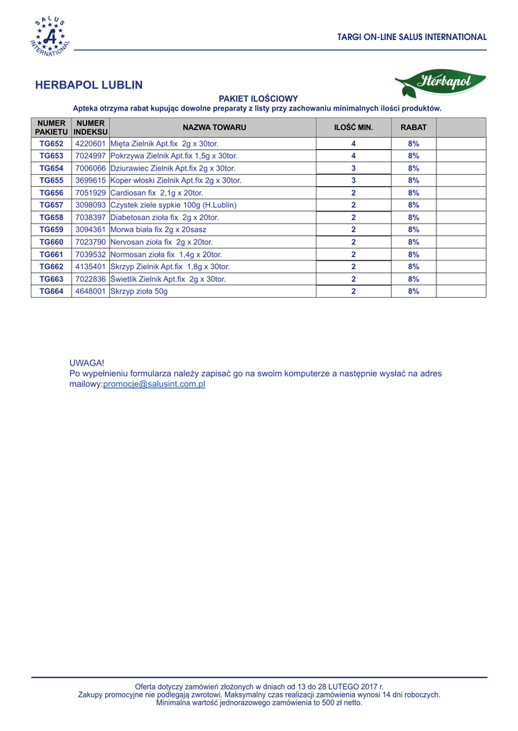TARGI ON-LINE SALUS INTERNATIONAL HERBAPOL LUBLIN PAKIET ILOŚCIOWY Apteka otrzyma rabat kupując dowolne preparaty z listy przy zachowaniu minimalnych ilości produktów. NUMER NUMER NAZWA TOWARU PAKIETU INDEKSU TG652 4220601 Mięta Zielnik Apt.fix 2g x 30tor. ILOŚĆ MIN. RABAT 4 8% TG653 7024997 Pokrzywa Zielnik Apt.fix 1,5g x 30tor. 4 8% TG654 7006066 Dziurawiec Zielnik Apt.fix 2g x 30tor. 3 8% TG655 3699615 Koper włoski Zielnik Apt.fix 2g x 30tor. 3 8% TG656 7051929 Cardiosan fix 2,1g x 20tor. 2 8% TG657 3098093 Czystek ziele sypkie 100g (H.Lublin) 2 8% TG658 7038397 Diabetosan zioła fix 2g x 20tor. 2 8% TG659 3094361 Morwa biała fix 2g x 20sasz 2 8% TG660 7023790 Nervosan zioła fix 2g x 20tor. 2 8% TG661 7039532 Normosan zioła fix 1,4g x 20tor. 2 8% TG662 4135401 Skrzyp Zielnik Apt.fix 1,8g x 30tor. 2 8% TG663 7022836 Świetlik Zielnik Apt.fix 2g x 30tor. 2 8% TG664 4648001 Skrzyp zioła 50g 2 8% UWAGA! Po wypełnieniu formularza należy zapisać go na swoim komputerze a następnie wysłać na adres mailowy:[email protected] Oferta dotyczy zamówień złożonych w dniach od 13 do 28 LUTEGO 2017 r. Zakupy promocyjne nie podlegają zwrotowi. Maksymalny czas realizacji zamówienia wynosi 14 dni roboczych. Minimalna wartość jednorazowego zamówienia to 500 zł netto.