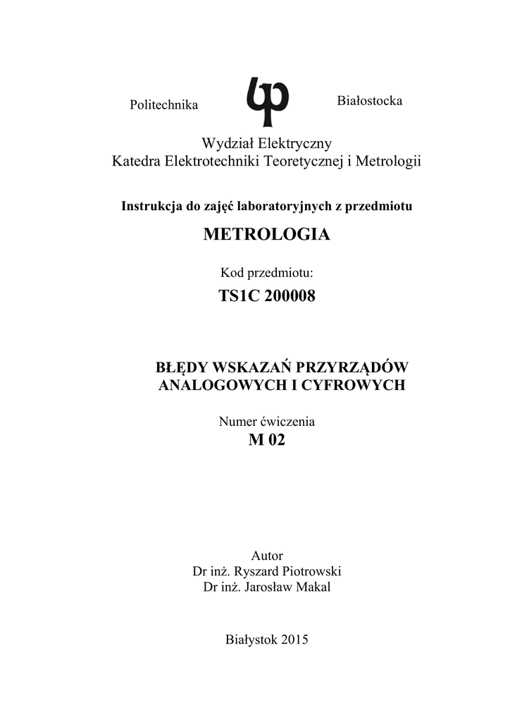 Białostocka Politechnika Wydział Elektryczny Katedra Elektrotechniki Teoretycznej i Metrologii Instrukcja do zajęć laboratoryjnych z przedmiotu METROLOGIA Kod przedmiotu: TS1C 200008 BŁĘDY WSKAZAŃ PRZYRZĄDÓW ANALOGOWYCH I CYFROWYCH Numer ćwiczenia M 02 Autor Dr inż. Ryszard Piotrowski Dr inż. Jarosław Makal Białystok 2015 Ćwicz. M 02 Błędy wskazań przyrządów analogowych i cyfrowych 2 Celem tego ćwiczenia jest nauczenie studentów prawidłowego sposobu obliczania błędów pomiarów bezpośrednich wykonywanych zarówno przy pomocy przyrządów wskazówkowych jak i cyfrowych. 1. Wprowadzenie kreślanie błędów wskazań przyrządów analogowych (wskazówkowych) i cyfrowych różni się w zasadniczy sposób. Podstawą obliczania błędu pomiaru wykonanego przyrządem wskazówkowym jest w zasadzie jedna liczba – klasa dokładności. Częstym zjawiskiem - nie tylko u początkujących metrologów, jest bezkrytyczne przyjmowanie za błąd pomiaru klasy dokładności przyrządu bez względu na wskazywaną przezeń wartość. Ta ostatnia, jak wykażemy, ma ogromny wpływ na względny błąd pomiaru dokonanego miernikiem wskazówkowym. O W przypadku przyrządów cyfrowych błędy wykonywanych nimi pomiarów oblicza się w odmienny sposób. Przede wszystkim nie występuje tu pojęcie klasy dokładności, a informacje dotyczące dokładności podawane przez producentów, są dość obszernym zbiorem różnorakich liczb. Dzieje się tak dlatego, że produkowane przyrządy cyfrowe skupiają w sobie wiele różnych funkcji pomiarowych – stąd ich nazwa – multimetry. Przeciętny multimetr pozwala m.in. na pomiar napięć i prądów (stałych i zmiennych) oraz rezystancji. Bardziej złożone przyrządy tego rodzaju mierzą dodatkowo indukcyjność, pojemność elektryczną, częstotliwość, temperaturę, itp., ale sposób obliczania dokładności pomiaru jest podobny dla wszystkich mierzonych wielkości. 2. Błędy pomiarów wykonywanych przyrządami wskazówkowymi Błąd, jakim obarczony jest wynik jednokrotnego pomiaru bezpośredniego dokonanego przyrządem wskazówkowym, zawiera kilka składników: 1. Błąd podstawowy wskazań 2. Błąd dodatkowy wskazań 3. Błąd odczytu 3 Ćwicz. M 02 Błędy wskazań przyrządów analogowych i cyfrowych 2.1. Błąd podstawowy Błąd podstawowy wskazań przyrządu wynika z niedokładności wykonania jego elementów składowych w procesie wytwórczym. Niedokładności te mają charakter przypadkowy, stąd błędy wskazań noszą ten sam charakter. Mają one różne wartości dla poszczególnych punktów podziałki i dla różnych egzemplarzy przyrządów danej serii. Określenie tych indywidualnych błędów byłoby zbyt kosztowne, dlatego wytwórca określa dla całej serii wyprodukowanych przyrządów największy możliwy błąd wskazań, którego z wysokim prawdopodobieństwem (mówi się także – poziomem ufności, wynosi on p = 0,9973) nie przekroczy błąd wskazań żadnego egzemplarza w żadnym punkcie podziałki. Ten największy błąd bezwzględny oznaczymy max 3 . Jest to tak zwany błąd trzysigmowy wskazań. Wytwórca odnosi następnie ten błąd do zakresu pomiarowego przyrządu Zp, otrzymując względny maksymalny błąd wskazań max : max max Zp (1) 100 % Na koniec nadaje całej serii wyprodukowanych przyrządów wspólną klasę dokładności k wybierając spośród ośmiu znormalizowanych wartości: 0,05% 0,1% 0,2% 0,5% 1% 1,5% 2,5% 5%, n a j m n i e j s z ą, która spełnia nierówność: k max Użytkownik natomiast, nie znając szczegółów procesu określania klasy dokładności (nie znając rzeczywistej wartości błędu max ), posługuje się „znormalizowaną” jego wartością, czyli klasą dokładności (2): k max Zp (2) 100 % Klasa dokładności dana zależnością (2) jest tylko pewnym wskaźnikiem dokładności przyrządu wskazówkowego. Jest to błąd wskazań, z którym określona jest wartość wielkości mierzonej w szczególnym przypadku, gdy wskazówka przyrządu odchyla się do końca zakresu pomiarowego. Dla danego zakresu pomiarowego błąd wskazań przyjmuje stałą wartość (3) równą max max Obliczając względny błąd wskazywanej przez przyrząd) ZP k 100 % wskazań (względem (3) wartości mierzonej W Ćwicz. M 02 Błędy wskazań przyrządów analogowych i cyfrowych w max W 100 % 4 (4) i podstawiając w wyrażeniu (4) w miejsce max wyrażenie (3), otrzymamy po przekształceniach zależność względnego błędu wskazań przyrządu wskazówkowego od wskazania przyrządu: w k Zp W (5) gdzie: w - względny błąd wskazań przyrządu k - klasa dokładności przyrządu Zp - jego zakres pomiarowy W - wskazanie przyrządu w chwili pomiaru (0 W Zp) Z wyrażenia (5) widać, że przy zmniejszaniu się wskazania W do zera, błąd w dąży do nieskończoności. Wynika stąd ważne zalecenie, by pomiary przeprowadzać przy możliwie jak największym odchyleniu wskazówki przyrządu, co osiąga się przez wybór odpowiedniego zakresu pomiarowego przyrządu jak najbardziej zbliżonego do wartości wielkości mierzonej. 2.2. Błąd dodatkowy Błąd ten związany jest z przekroczeniem podczas pomiaru znamionowych warunków pracy przyrządu. Określone mogą one być przez następujące parametry. 1. Temperaturę otoczenia (np. +100 C +300 C) 2. Wilgotność powietrza (np. do 85%) 3. Natężenie obcych pól magnetycznych (np. do 5 Oe) 4. Częstotliwość znamionową (np. 50 Hz) lub przedział dopuszczalnych częstotliwości (np. 20-50-400 Hz) 5. Współczynnik zawartości harmonicznych, charakteryzujący stopień odkształcenia od sinusoidy krzywej napięcia lub prądu (np. h 5%) 6. Sposób położenia przyrządu podczas pracy (np. pionowe albo poziome, albo pod określonym kątem, np. 300) Powyższe oraz inne warunki podane są bezpośrednio na przyrządzie, bądź w dołączonej metryce. Błąd ten można pominąć, jeśli przyrząd jest eksploatowany w warunkach znamionowych. UWAGA: Błąd dodatkowy 