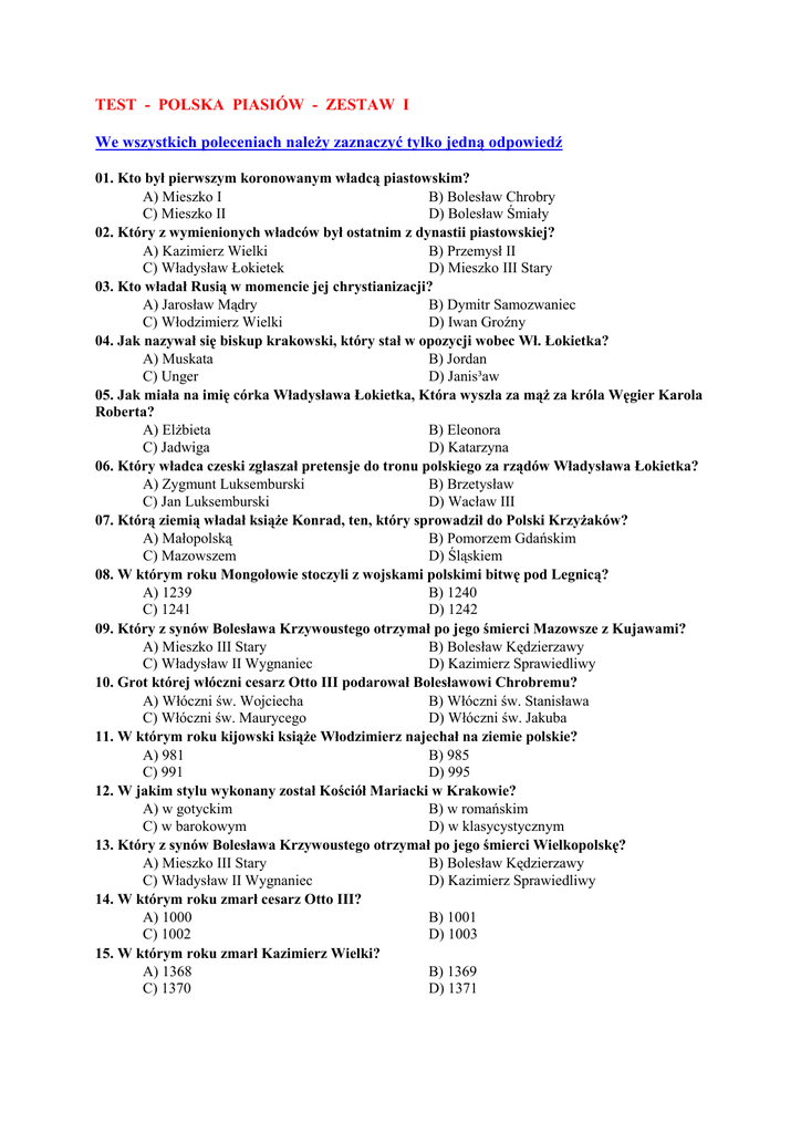 TEST - POLSKA PIASIÓW - ZESTAW I We wszystkich poleceniach naleŜy zaznaczyć tylko jedną odpowiedź 01. Kto był pierwszym koronowanym władcą piastowskim? A) Mieszko I B) Bolesław Chrobry C) Mieszko II D) Bolesław Śmiały 02. Który z wymienionych władców był ostatnim z dynastii piastowskiej? A) Kazimierz Wielki B) Przemysł II C) Władysław Łokietek D) Mieszko III Stary 03. Kto władał Rusią w momencie jej chrystianizacji? A) Jarosław Mądry B) Dymitr Samozwaniec C) Włodzimierz Wielki D) Iwan Groźny 04. Jak nazywał się biskup krakowski, który stał w opozycji wobec Wł. Łokietka? A) Muskata B) Jordan C) Unger D) Janis³aw 05. Jak miała na imię córka Władysława Łokietka, Która wyszła za mąŜ za króla Węgier Karola Roberta? A) ElŜbieta B) Eleonora C) Jadwiga D) Katarzyna 06. Który władca czeski zgłaszał pretensje do tronu polskiego za rządów Władysława Łokietka? A) Zygmunt Luksemburski B) Brzetysław C) Jan Luksemburski D) Wacław III 07. Którą ziemią władał ksiąŜe Konrad, ten, który sprowadził do Polski KrzyŜaków? A) Małopolską B) Pomorzem Gdańskim C) Mazowszem D) Śląskiem 08. W którym roku Mongołowie stoczyli z wojskami polskimi bitwę pod Legnicą? A) 1239 B) 1240 C) 1241 D) 1242 09. Który z synów Bolesława Krzywoustego otrzymał po jego śmierci Mazowsze z Kujawami? A) Mieszko III Stary B) Bolesław Kędzierzawy C) Władysław II Wygnaniec D) Kazimierz Sprawiedliwy 10. Grot której włóczni cesarz Otto III podarował Bolesławowi Chrobremu? A) Włóczni św. Wojciecha B) Włóczni św. Stanisława C) Włóczni św. Maurycego D) Włóczni św. Jakuba 11. W którym roku kijowski ksiąŜe Włodzimierz najechał na ziemie polskie? A) 981 B) 985 C) 991 D) 995 12. W jakim stylu wykonany został Kościół Mariacki w Krakowie? A) w gotyckim B) w romańskim C) w barokowym D) w klasycystycznym 13. Który z synów Bolesława Krzywoustego otrzymał po jego śmierci Wielkopolskę? A) Mieszko III Stary B) Bolesław Kędzierzawy C) Władysław II Wygnaniec D) Kazimierz Sprawiedliwy 14. W którym roku zmarł cesarz Otto III? A) 1000 B) 1001 C) 1002 D) 1003 15. W którym roku zmarł Kazimierz Wielki? A) 1368 B) 1369 C) 1370 D) 1371 16. Z której dynastii pochodził Przemysł II? A) Piastów B) Przemyślidów C) Andegawenów D) Luksemburgów 17. Który polski ksiąŜe zginął w bitwie z Tatarami pod Legnicą? A) Henryk Brodaty B) Henryk PoboŜny C) Henryk IV Probus D) Henryk Sandomierski 18. W którym roku KrzyŜacy zostali sprowadzeni do Polski? A) 1222 B) 1224 C) 1226 D) 1228 19. Który z synów Bolesława Krzywoustego był najstarszy? A) Kazimierz Sprawiedliwy B) Władysław II C) Bolesław Kędzierzawy D) Mieszko III Stary 20. W którym roku Bolesław Krzywousty zakończył podbój Pomorza Gdańskiego? A) 1115 B) 1117 C) 1119 D) 1122 21. Kto sprawował władzę w Polsce w czasach Władysława Hermana? A) Siemowit B) Sieciech C) Siemomysł D) Leszek 22. Jak nazywało się zgromadzenie dorosłych męŜczyzn, które rządziło plemionami? A) Opole B) Rada Mędrców C) Wiec D) Rada Starców 23. W którym roku Bolesław Śmiały został koronowany na króla Polski? A) 1071 B) 1073 C) 1076 D) 1079 24. W którym roku miał miejsce zjazd władców Czech i Węgier w Wyszechradzie? A) 1333 B) 1337 C) 1335 D) 1339 25. Który cesarz niemiecki zorganizował w 1109 roku wyprawę na Polskę? A) Fryderyk Barbarossa B) Henryk IV C) Konrad II D) Henryk V 26. W którym roku zakończył Ŝycie i panowanie Władysław Herman? A) 1101 B) 1102 C) 1103 D) 1104 27. W którym roku Mieszko I przyjął chrzest? A) 965 B) 967 C) 966 D) 968 28. Jak miał na imię arcybiskup, który koronował Przemysła II na króla Polski? A) Kajetan B) Wojciech C) Radzym D) Jakub 29. Który z biskupów został przez Bolesława Śmiałego skazany na śmierć A) Stanisław ze Szczebrzeszyna B) Stanisław z Pacanowa C) Stanisław ze Szczepanowa D) Stanisław z Gniezna 30. Kto był pierwszm polskim biskupem? A) Unger B) Wojciech C) Jakub D) Jordan 31. Jak nazywał się arcybiskup, który koronował Przemysła II na króla Polski? A) Prosiak B) Świnka C) Świnia D) Wieprz 32. Jak miał na imię arcybiskup, który koronował Władysława Łokietka na króla Polski? A) Stanisław B) Janisław C) Jordan D) Wojciech