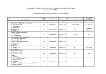 Dokumentacja przebiegu i efektów kontroli oraz wystąpienia, stanowiska, wnioski i opinie okres: styczeń - maj 2014 r. 1. Informacja o kontrolach przeprowadzonych przez Wydział Inspekcji Lp. 1 1 2 3 4 5 6 7 Nazwa podmiotu 2 T.B. FRUIT POLSKA Sp. z o.o. S. K.-A. ul. Sandomierska 109 27-620 Dwikozy "ZŁOMHUT" Sp. z o.o. Przyborów 100 27-420 Bodzechów Zakład Gospodarki Komunalnej ul. Kościelna 21 26-130 Suchedniów oczyszczalnia ścieków w Michniowie PGE Górnictwo i Energetyka Konwencjonalna S.A. Oddział Elektrociepłownia Kielce ul. Hubalczyków 30 25-668 Kielce DS Smith S.A. ul. Malików 150 25-339 Kielce Ferma Drobiu Lasków Gospodarstwo Rolne Marcin i Renata Głowa Lasków 28-300 Jędrzejów "EKOM" Maciejczyk Sp. J. ul. Paderewskiego 18 25-004 Kielce Zakład Produkcji Paliw Alternatywnych, Przeładunku i Segregacji Odpadów w m. Wola Murowana, gm. Sitkówka-Nowiny Numer kontroli 3 4 5 6 Stwierdzone nieprawidłowości 7 303 kompleksowa grudzień 2013 P, Z, Wns, M ś, w, p, o, opł 347 interwencyjna grudzień 2013 P, Z o, demontaż pojazdów 357 kompleksowa grudzień 2013 P, Z, Ws oś 359 kompleksowa grudzień 2013 P 367 problemowa grudzień 2013 P, Z p, LZO, opł 369 problemowa grudzień 2013 P, Z h, p 370 kompleksowa grudzień 2013 P p Rodzaj kontroli Termin kontroli Dokumenty dotyczące kontroli 8 9 10 11 12 13 14 15 16 21 Wojskowy Szpital Uzdrowiskowo-Rehabilitacyjny ul. Rzewuskiego 8 28-100 Busko-Zdrój Gmina Solec-Zdrój ul. 1-go Maja 10 28-131 Solec-Zdrój oczyszczalnia ścieków komunalnych i pokąpielowych w m. Wełnin Przedsiębiorstwo Produkcyjno-Handlowo-Usługowe "WTÓRPOL" Leszek Wojteczek ul. Żurawia 1 26-110 Skarżysko-Kamienna Gmina Raków ul. Ogrodowa 1 26-035 Raków oczyszczalnia ścieków w Chańczy Zakłady Urządzeń Kotłowych "STĄPORKÓW" S.A. ul. Górnicza 3 26-220 Stąporków Zakład Produkcji Paliwa Biomasowo-Węglowego Przedsiębiorstwo Produkcyjno-Usługowe "IRONEL" Sp. z o.o. ul. Leśna 56a 26-200 Końskie Zakład Usług Komunalnych w Daleszycach Sp. z o.o. ul. Ługi 1; 26-021 Daleszyce oczyszczalnia ścieków w Daleszycach Zakład Ślusarski Ryszard Prawnuk ul. Gruchawka 21 25-648 Kielce Zakład Gospodarki Komunalnej ul. Godlewskiego 11 29-105 Krasocin oczyszczalnia ścieków w Skorkowie 1 kompleksowa styczeń 2014 P, Z ś 2 problemowa luty 2014 P 3 interwencyjna styczeń 2014 P, Z p, o 4 problemowa styczeń 2014 P, Z, M ś 5 odbiór inwestycji styczeń 2014 P 6 kompleksowa styczeń 2014 P, Z p, o 7 problemowa styczeń 2014 P, Z ś 8 interwencyjna styczeń 2014 P 9 problemowa styczeń 2014 P ś 17 18 19 20 21 22 23 24 25 Superhobby Market Budowlany Sp. z o.o. Market OBI 020 ul. Zagnańska 67 25-558 Kielce "Air Products" Sp. z o.o. ul. Pory 59; 02-757 Warszawa Zakład w Ostrowcu Świętokrzyskim ul. Samsonowicza 2 27-400 Ostrowiec Świętokrzyski Spółdzielcza Agrofirma Szczekociny ul. Parkowa 1; 42-445 Szczekociny Ferma Bydła w Moskorzewie 29-130 Moskorzew Animex Foods Sp. z o.o. S.K.-A. Oddział w Starachowicach ul. Krańcowa 4 27-200 Starachowice PPHU "MARCO" Monika Borkowska ul. Pułaskiego 40; 42-230 Koniecpol Punkt skupu złomu we Włoszczowie, ul. Targowa 2 "EKOPLON" S.A. Grabki Duże 82 28-225 Szydłów PRAKTIKER POLSKA Sp. z o.o. Sklep 361 Kielce ul. Radomska 8 25-323 Kielce "PETROFER-POLSKA" Sp. z o.o. ul. Składowa 1 Nowiny 26-052 Sitkówka Zakład Masarski Grzegorz Toporek ul. Starowiejska 170 Kostomłoty Drugie 26-085 Miedziana Góra 10 problemowa styczeń 2014 P 11 kompleksowa styczeń 2014 P 12 interwencyjna luty 2014 P, Z w, nawozy naturalne 13 kompleksowa styczeń 2014 P, Z o, ś 14 problemowa styczeń 2014 P, Z o 15 odbiór inwestycji luty 2014 P 16 problemowa styczeń 2014 P 17 kompleksowa luty 2014 P 18 interwencyjna styczeń 2014 P, Z, Wns NR ś, p, o 26 27 28 29 30 31 32 33 34 Cegielnia Rytwiany Bartosz Głowacki ul. Klasztorna 23 28-236 Rytwiany PKP CARGO S.A. ul. Grójecka 17; 02-021 Warszawa Wschodni Zakład Spółki ul. Rataja 15; 20-270 Lublin działalność: ul. Piękna 27 26-110 Skarżysko-Kamienna Firma Handlowo-Usługowa "MARCEL" Marcin Grzegorski Sosnówka 30 26-006 Nowa Słupia "SKARBUD" Sp. J. Maria Gorgiel, Bogdan Gorgiel ul. Obuwnicza 10 i 10A 26-110 Skarżysko-Kamienna stacja paliw Okręgowa Spółdzielnia Mleczarska ul. Zielona 11 26-200 Końskie NSK Bearings Polska S.A. ul. Jagiellońska 109 25-734 Kielce Przedsiębiorstwo Handlowo-Usługowe Jerzy Przeniosło Dziekanowice 22A 28-440 Działoszyce Zakład Usług Komunalnych w Sędziszowie ul. Dworcowa 19 28-340 Sędziszów oczyszczalnia ścieków Wodociągi Gminne w Sobkowie Pl. Wolności 16 28-305 Sobków oczyszczalnia ścieków w Sobkowie ś, h, p 19 kompleksowa luty 2014 P, Z 20 problemowa luty 2014 P 21 problemowa luty 2014 P, Z, Wnrz, M o, recykling pojazdów 22 odbiór inwestycji luty 2014 P p 23 problemowa luty 2014 P 24 problemowa luty 2014 P, Z p, o 25 interwencyjna luty 2014 P, Z, Wns o, sprzęt elektryczny i elektroniczny, recykling pojazdów 26 problemowa luty 2014 P, Z, Wns o, ś 27 interwencyjna luty 2014 P, Z ś 35 MAXAM POLSKA Sp. z o.o. Duninów 3; 59-140 Chocianów Skład Materiałów Wybuchowych Rykoszyn 26-065 Piekoszów TECHPRO Krzysztof Łebek ul. Krakowska 290 25-801 Kielce Przedsiębiorstwo Produkcji Betonów "SIBET" S.A. ul. Chorzowska 22 25-852 Kielce CERAMIKA GRES S.A. ul. Ceramiczna 1 26-200 Końskie Zakład Produkcyjny w Kopaninach "Wodociągi Pińczowskie" Sp. z o.o. ul. Batalionów Chłopskich 160 28-400 Pińczów oczyszczalnia ścieków w Pińczowie "METAL-HANDEL" Sp. J. Jacek Galas i Piotr Galas ul. Wjazdowa 33 26-200 Końskie 28 problemowa luty 2014 P 29 problemowa luty 2014 P 30 problemowa luty 2014 P, Z 31 problemowa luty 2014 P 32 problemowa luty 2014 P 33 problemowa luty 2014 P 41 REMONDIS MEDISON Sp. z o.o. ul. Puszkina 41; 42-530 Dąbrowa Górnicza Pomieszczenie magazynowe w Starachowicach ul. Krańcowa 4 27-200 Starachowice 35 problemowa luty 2014 P 42 Miejskie Przedsiębiorstwo Gospodarki Komunalnej Sp. z o.o. ul. Ła