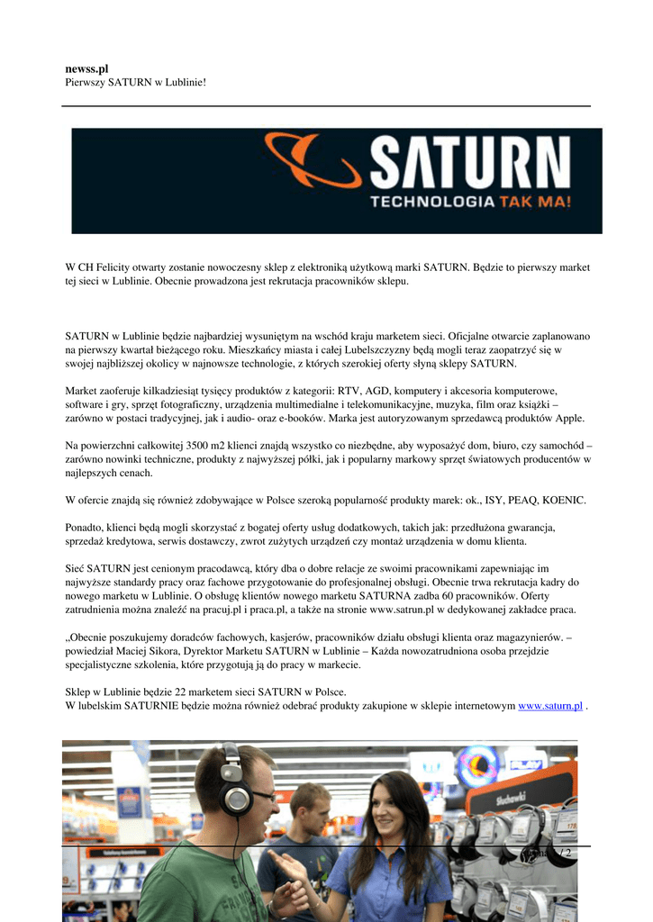 newss.pl Pierwszy SATURN w Lublinie! W CH Felicity otwarty zostanie nowoczesny sklep z elektroniką użytkową marki SATURN. Będzie to pierwszy market tej sieci w Lublinie. Obecnie prowadzona jest rekrutacja pracowników sklepu. SATURN w Lublinie będzie najbardziej wysuniętym na wschód kraju marketem sieci. Oficjalne otwarcie zaplanowano na pierwszy kwartał bieżącego roku. Mieszkańcy miasta i całej Lubelszczyzny będą mogli teraz zaopatrzyć się w swojej najbliższej okolicy w najnowsze technologie, z których szerokiej oferty słyną sklepy SATURN. Market zaoferuje kilkadziesiąt tysięcy produktów z kategorii: RTV, AGD, komputery i akcesoria komputerowe, software i gry, sprzęt fotograficzny, urządzenia multimedialne i telekomunikacyjne, muzyka, film oraz książki – zarówno w postaci tradycyjnej, jak i audio- oraz e-booków. Marka jest autoryzowanym sprzedawcą produktów Apple. Na powierzchni całkowitej 3500 m2 klienci znajdą wszystko co niezbędne, aby wyposażyć dom, biuro, czy samochód – zarówno nowinki techniczne, produkty z najwyższej półki, jak i popularny markowy sprzęt światowych producentów w najlepszych cenach. W ofercie znajdą się również zdobywające w Polsce szeroką popularność produkty marek: ok., ISY, PEAQ, KOENIC. Ponadto, klienci będą mogli skorzystać z bogatej oferty usług dodatkowych, takich jak: przedłużona gwarancja, sprzedaż kredytowa, serwis dostawczy, zwrot zużytych urządzeń czy montaż urządzenia w domu klienta. Sieć SATURN jest cenionym pracodawcą, który dba o dobre relacje ze swoimi pracownikami zapewniając im najwyższe standardy pracy oraz fachowe przygotowanie do profesjonalnej obsługi. Obecnie trwa rekrutacja kadry do nowego marketu w Lublinie. O obsługę klientów nowego marketu SATURNA zadba 60 pracowników. Oferty zatrudnienia można znaleźć na pracuj.pl i praca.pl, a także na stronie www.satrun.pl w dedykowanej zakładce praca. „Obecnie poszukujemy doradców fachowych, kasjerów, pracowników działu obsługi klienta oraz magazynierów. – powiedział Maciej Sikora, Dyrektor Marketu SATURN w Lublinie – Każda nowozatrudniona osoba przejdzie specjalistyczne szkolenia, które przygotują ją do pracy w markecie. Sklep w Lublinie będzie 22 marketem sieci SATURN w Polsce. W lubelskim SATURNIE będzie można również odebrać produkty zakupione w sklepie internetowym www.saturn.pl . strona 1 / 2 newss.pl Pierwszy SATURN w Lublinie! SATURN to ceniona marka sklepów z elektroniką użytkową, należąca do holdingu Media-Saturn. W Polsce pierwsze sklepy powstały w 2004 roku. Obecnie SATURN dysponuje ponad 220 marketami w 6 krajach, z czego w Polsce zlokalizowanych jest 21 oraz pierwszy sklep z technologiami mobilnymi Saturn Connect. Markety SATURN oferują najpełniejszy na rynku asortyment w zakresie sprzętu multimedialnego, teleinformatycznego, fotograficznego, telewizorów, urządzeń audio-wideo, biurowych, AGD i pełną gamę akcesoriów, a także książki, programy i gry komputerowe oraz filmy i muzykę. www.saturn.pl facebook.com/SaturnPolska youtube.com/user/saturnpolskacom Saturn Więcej informacji z firmy MEDIA SATURN ( press box ) strona 2 / 2
