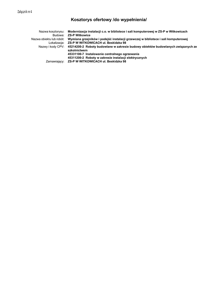 Kosztorys ofertowy /do wypełnienia/ Nazwa kosztorysu: Budowa: Nazwa obiektu lub robót: Lokalizacja: Nazwy i kody CPV: Zamawiający: Modernizacja instalacji c.o. w bibliotece i sali komputerowej w ZS-P w Witkowicach ZS-P Witkowice Wymiana grzejników i podejść instalacji grzewczej w bibliotece i sali komputerowej ZS-P W WITKOWICACH ul. Beskidzka 98 45214200-2 Roboty budowlane w zakresie budowy obiektów budowlanych związanych ze szkolnictwem 45331100-7 Instalowanie centralnego ogrzewania 45311200-2 Roboty w zakresie instalacji elektrycznych ZS-P W WITKOWICACH ul. Beskidzka 98 Modernizacja instalacji c.o. w bibliotece i sali komputerowej w ZS-P w Witkowicach Kosztorys ofertowy /do wypełnienia/ <-NR-> <-PODST-> <-OPIS-> <-JEDN-> Nr Podstawa ceny Opis robót jednostkowej Kosztorys Modernizacja instalacji c.o. w bibliotece i sali komputerowej w ZS-P <-ILOSC-> Jm <-CENA-> <-WARTOSC-> Ilość Cena jedn. Wartość w Witkowicach 1 Element 1 KNNR 8/423/5 2 3 4 5 6 7 8 9 10 11 12 13 2 Wymiana grzejników i podejść instalacji grzewczej w bibliotece i sali komputerowej Demontaż grzejnika z rur stalowych, żebrowany 2- 3-rzędowy G-2, G-3, długości 0,5-2,0˙m KNNR 8/423/6 Demontaż grzejnika z rur stalowych, żebrowany 2- 3-rzędowy G-2, G-3, długości 2,5-5,0˙m KNNR 4/418/10 Grzejniki stalowe, 3-płytowe, wysokość 300˙mm, długość 2600˙mm. 33 300x2600 KNNR 4/418/10 Grzejniki stalowe, 3-płytowe, wysokość 300˙mm, długość 3000˙mm. 33 300x3000 KNNR 8/419/3 Wymiana rur przyłącznych do grzejnika stalowego płytowego z rur stalowych, połączenia spawane, Fi˙15˙mm KNNR 4/403/1 Rurociągi stalowe o połączeniach spawanych na ścianach w budynkach, Dn˙15˙mm (do podłączenia grzejników przeciwległego) KNNR 8/415/1 Wymiana odgałęzienia z rur stalowych o połączeniach spawanych, Fi˙15˙mm (1) KNNR 8/407/4 Wymiana zaworu termostatycznego, Fi˙10-15˙mm, zawór grzejnikowy termostatyczny (2) prosty mosiężny z głowicą F 15mm KNNR 8/407/1 Wymiana zaworu grzejnikowego, Fi˙15˙mm, zawór grzejnikowy powrotny (1) KNNR 8/407/7 Wymiana odpowietrznika automatycznego, Fi˙10-15˙mm, zawór odpowietrzający (2) automatyczny do instalacji c.o. mosiężny JFA-4711 15 mm KNNR 4/406/1 Próby szczelności instalacji centralnego ogrzewania, rura stalowa (1) KNR Malowanie farbą do gruntowania, rury co, średnica 21˙mm, 1-krotne 401/1212/27 KNNR 4/436/1 Próby instalacji centralnego ogrzewania (na gorąco), z dokonaniem regulacji Element Przesuniecie kolidującech gniazd sieci komputerowej i 230V. 14 KNNR 9/402/6 15 KNNR 5/303/1 16 KNNR 5/308/1 analogia 17 Kalkulacja indywidualna 18 KNNR 5/110/1 (1) 19 KNNR 5/209/1 20 Kalkulacja indywidualna 21 Kalkulacja indywidualna 22 KNNR 9/402/1 Demontaż gniazd komputerowych i 230V Puszki z tworzywa sztucznego, puszka 75x75, natynkowa Gniazda instalacyjne wtyczkowe ze stykiem ochronnym, nt, 2-biegunowe 10A 2,5˙mm2 końcowe podwójne - gniazda z demontażu Gniazda sieci komputerowe końcowe z wykonaniem pomiarów - gniazda z demontażu szt 3 szt szt szt 3 3 3 kpl 12 m 20 szt 12 szt 6 szt 6 szt 4 szt 6 m urządze 20 6 szt szt 20 20 szt 9 szt 11 m 12 m 9 m 6 kpl 11 szt 2 szt 1 szt 10 Listwy elektroinstalacyjne z PVC (naścienne), klejone, na kleju szybkoschnącym Przewody kabelkowe układane w gotowych korytkach, bez mocowania, przekrój YDY 3x2,5 mm2do 7,5˙mm2 Kabel U/UPT kat 5e montowane w korytkach Montaż łączówek RJ45 M/Ż Przeniesienie gniazda instalacyjne wtykowe podwójnego podtynkowego na odlegóść około 1 m - gniazdo z demontażu 23 KNNR 5/1304/1 Badania i pomiary instalacji uziemiającej, piorunochronnej i skuteczności zerowania, uziemienie ochronne lub robocze, pomiar pierwszy 24 KNNR 5/1304/2 Badania i pomiary instalacji uziemiającej, piorunochronnej i skuteczności zerowania, uziemienie ochronne lub robocze, pomiar każdy następny Tabela elementów scalonych Nr Nazwa Modernizacja instalacji c.o. w bibliotece i sali komputerowej w ZS-P w Witkowicach 1 2 Wymiana grzejników i podejść instalacji grzewczej w bibliotece i sali komputerowej Przesuniecie kolidującech gniazd sieci komputerowej i 230V. Suma elementów kosztorysu Razem Modernizacja instalacji c.o. w bibliotece i sali komputerowej w ZS-P w Witkowicach netto Wartość z narzutami
