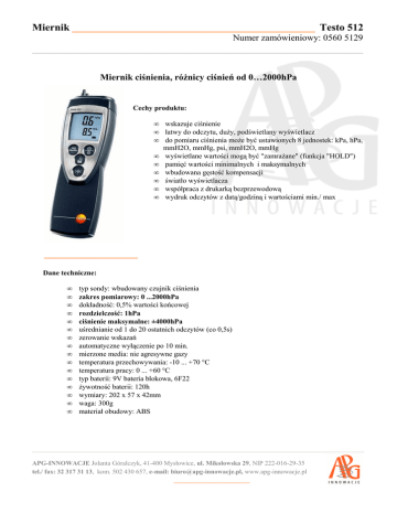 Miernik ____________________________________________________ Testo 512 Numer zamówieniowy: 0560 5129 ______________________________________________________________ Miernik ciśnienia, różnicy ciśnień od 0…2000hPa Cechy produktu: • • • • • • • • • wskazuje ciśnienie łatwy do odczytu, duży, podświetlany wyświetlacz do pomiaru ciśnienia może być ustawionych 8 jednostek: kPa, hPa, mmH2O, mmHg, psi, mmH2O, mmHg wyświetlane wartości mogą być "zamrażane" (funkcja "HOLD") pamięć wartości minimalnych i maksymalnych wbudowana gęstość kompensacji światło wyświetlacza współpraca z drukarką bezprzewodową wydruk odczytów z datą/godziną i wartościami min./ max ____________________ Dane techniczne: • • • • • • • • • • • • • • • • typ sondy: wbudowany czujnik ciśnienia zakres pomiarowy: 0 ...2000hPa dokładność: 0,5% wartości końcowej rozdzielczość: 1hPa ciśnienie maksymalne: ±4000hPa uśrednianie od 1 do 20 ostatnich odczytów (co 0,5s) zerowanie wskazań automatyczne wyłączenie po 10 min. mierzone media: nie agresywne gazy temperatura przechowywania: -10 ... +70 °C temperatura pracy: 0 ... +60 °C typ baterii: 9V bateria blokowa, 6F22 żywotność baterii: 120h wymiary: 202 x 57 x 42mm waga: 300g materiał obudowy: ABS ___________________________________________________________________________________ APG-INNOWACJE Jolanta Góralczyk, 41-400 Mysłowice, ul. Mikołowska 29, NIP 222-016-29-35 tel./ fax: 32 317 31 13, kom. 502 430 657, e-mail: [email protected], www.apg-innowacje.pl ___________________ Miernik ____________________________________________________ Testo 512 Numer zamówieniowy: 0560 5129 ______________________________________________________________ Informacje ogólne: • • • • • • • • • gwarancja 24 miesięczna (bez baterii) serwis gwarancyjny i pogwarancyjny certyfikat kalibracyjny drukarka z bezprzewodowym interfejsem podczerwieni, 1 rolka papieru termicznego i 4 baterie AA (wydruk w miejscu pomiaru) (opcja) walizka transportowa na przyrząd pomiarowy i sondę (405 x 170 x 85mm) (opcja) futerał na miernik i sondy (opcja) futerał TopSafe, chroni przed uderzeniami i zabrudzeniami (opcja) 9 V akumulator do miernika (zamiast baterii) (opcja) ładowarka do 9V akumulatora (opcja) ___________________________________________________________________________________ APG-INNOWACJE Jolanta Góralczyk, 41-400 Mysłowice, ul. Mikołowska 29, NIP 222-016-29-35 tel./ fax: 32 317 31 13, kom. 502 430 657, e-mail: [email protected], www.apg-innowacje.pl ___________________