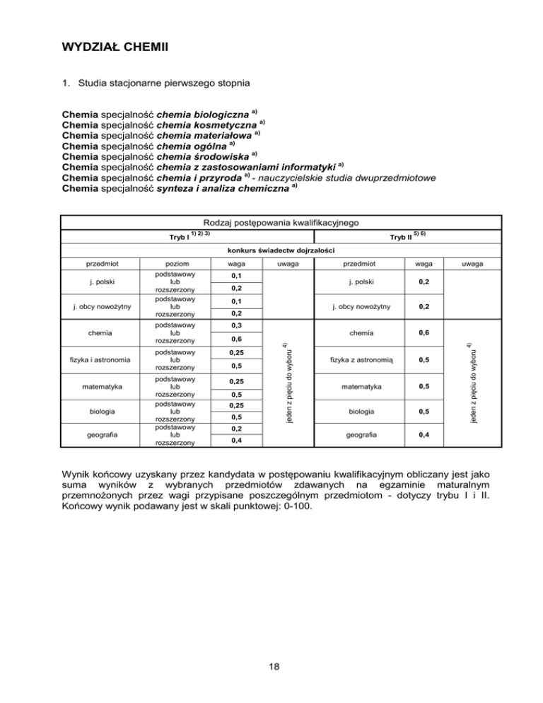 WYDZIAŁ CHEMII 1. Studia stacjonarne pierwszego stopnia Chemia specjalność chemia biologiczna a) Chemia specjalność chemia kosmetyczna a) Chemia specjalność chemia materiałowa a) Chemia specjalność chemia ogólna a) Chemia specjalność chemia środowiska a) Chemia specjalność chemia z zastosowaniami informatyki a) Chemia specjalność chemia i przyroda a) - nauczycielskie studia dwuprzedmiotowe Chemia specjalność synteza i analiza chemiczna a) Rodzaj postępowania kwalifikacyjnego Tryb I 1) 2) 3) Tryb II 5) 6) konkurs świadectw dojrzałości fizyka i astronomia matematyka biologia geografia podstawowy lub rozszerzony 0,3 podstawowy lub rozszerzony 0,25 podstawowy lub rozszerzony podstawowy lub rozszerzony podstawowy lub rozszerzony 0,25 przedmiot waga j. polski 0,2 j. obcy nowoŜytny 0,2 chemia 0,6 fizyka z astronomią 0,5 matematyka 0,5 biologia 0,5 geografia 0,4 uwaga 0,2 0,1 0,2 0,6 0,5 0,5 0,25 0,5 0,2 0,4 4) chemia 0,1 uwaga jeden z pięciu do wyboru j. obcy nowoŜytny waga 4) j. polski poziom podstawowy lub rozszerzony podstawowy lub rozszerzony jeden z pięciu do wyboru przedmiot Wynik końcowy uzyskany przez kandydata w postępowaniu kwalifikacyjnym obliczany jest jako suma wyników z wybranych przedmiotów zdawanych na egzaminie maturalnym przemnoŜonych przez wagi przypisane poszczególnym przedmiotom - dotyczy trybu I i II. Końcowy wynik podawany jest w skali punktowej: 0-100. 18 2. Studia stacjonarne drugiego stopnia Chemia specjalność chemia biologiczna c) Chemia specjalność chemia kosmetyczna c) Chemia specjalność chemia materiałowa c) Chemia specjalność chemia ogólna c) Chemia specjalność chemia środowiska c) Chemia specjalność chemia z zastosowaniami informatyki c) dla absolwentów studiów wyŜszych Przyjęcie na studia odbywa się na podstawie średniej ocen uzyskanych w trakcie studiów oraz rozmowy kwalifikacyjnej z zakresu studiów pierwszego stopnia na kierunku chemia. elementy postępowania kwalifikacyjnego maks. pkt. waga średnia ocen uzyskanych w trakcie studiów pierwszego stopnia 5,00 5 rozmowa kwalifikacyjna 5,00 5 3. Studia niestacjonarne drugiego stopnia Chemia c) g) dla absolwentów studiów wyŜszych Rozmowa kwalifikacyjna z zakresu studiów pierwszego stopnia na kierunku chemia, za którą moŜna uzyskać maksymalnie 25 punktów. Objaśnienie stosowanych przypisów: 1) 2) 6) Suma wyników egzaminu maturalnego zdawanego w części pisemnej. Uwzględniany jest tylko jeden poziom. W przypadku, gdy kandydat posiada z danego przedmiotu wyniki z egzaminu maturalnego na poziomie podstawowym i rozszerzonym uwzględniany jest wynik z poziomu korzystniejszego dla kandydata. Sposób przeliczania wyników matury międzynarodowej (IB) na punkty „nowej matury” podany jest w § 20 ust. 1 Części ogólnej Uchwały. JeŜeli kandydat zdawał więcej niŜ jeden z wymienionych przedmiotów, to brany pod uwagę jest najlepszy z wyników. JeŜeli kandydat posiada dwie oceny z egzaminu dojrzałości z wymaganego przedmiotu (egzamin pisemny i ustny), to wybierany jest najlepszy wynik. Sposób przeliczania ocen z egzaminu dojrzałości na punkty podany jest w § 21 Części ogólnej Uchwały. a) b) c) d) e) f) g) Studia pierwszego stopnia (3-letnie) prowadzące do uzyskania tytułu zawodowego licencjata. Studia pierwszego stopnia (3,5-letnie) prowadzące do uzyskania tytułu zawodowego inŜyniera. Studia drugiego stopnia (2-letnie) prowadzące do uzyskania tytułu zawodowego magistra. Studia drugiego stopnia (2-letnie) prowadzące do uzyskania tytułu zawodowego magistra sztuki. Jednolite studia magisterskie (5-letnie) prowadzące do uzyskania tytułu zawodowego magistra. Studia niestacjonarne - zajęcia odbywają się w ciągu tygodnia. Studia niestacjonarne - zajęcia odbywają się od piątku do niedzieli. 3) 4) 5) 19