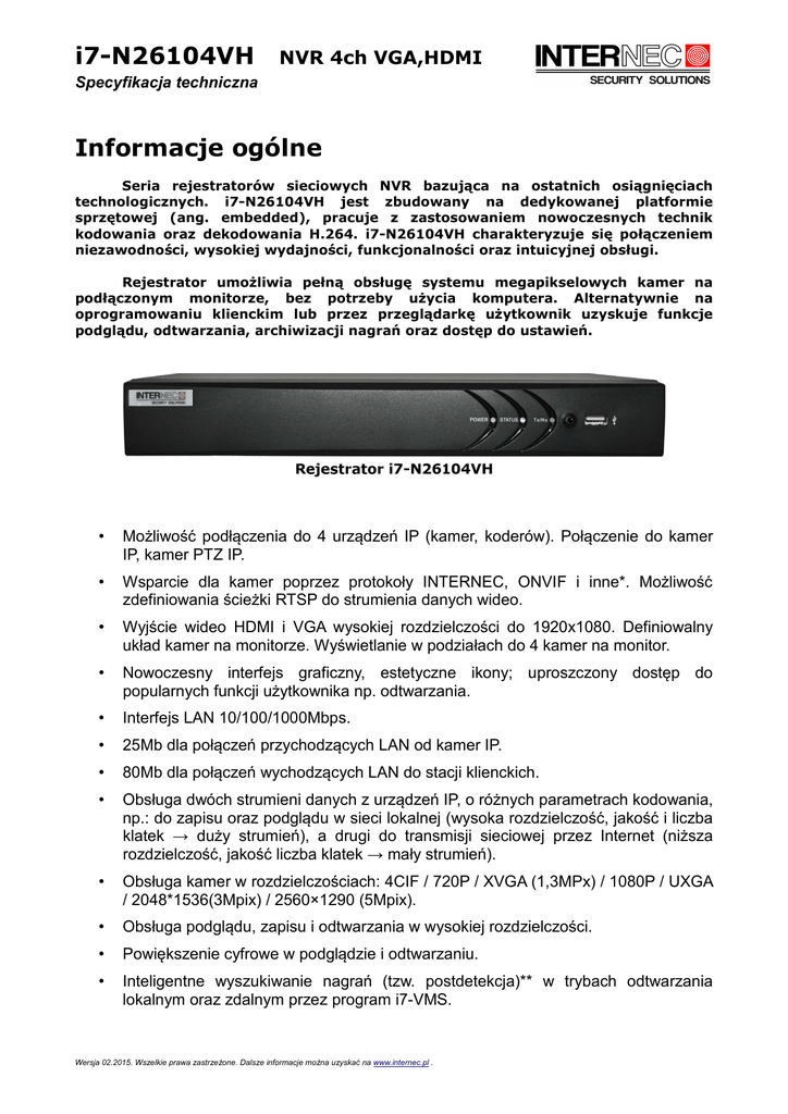 i7-N26104VH NVR 4ch VGA,HDMI Specyfikacja techniczna Informacje ogólne Seria rejestratorów sieciowych NVR bazująca na ostatnich osiągnięciach technologicznych. i7-N26104VH jest zbudowany na dedykowanej platformie sprzętowej (ang. embedded), pracuje z zastosowaniem nowoczesnych technik kodowania oraz dekodowania H.264. i7-N26104VH charakteryzuje się połączeniem niezawodności, wysokiej wydajności, funkcjonalności oraz intuicyjnej obsługi. Rejestrator umożliwia pełną obsługę systemu megapikselowych kamer na podłączonym monitorze, bez potrzeby użycia komputera. Alternatywnie na oprogramowaniu klienckim lub przez przeglądarkę użytkownik uzyskuje funkcje podglądu, odtwarzania, archiwizacji nagrań oraz dostęp do ustawień. • Możliwość podłączenia do 4 urządzeń IP (kamer, koderów). Połączenie do kamer IP, kamer PTZ IP. • Wsparcie dla kamer poprzez protokoły INTERNEC, ONVIF i inne*. Możliwość zdefiniowania ścieżki RTSP do strumienia danych wideo. • Wyjście wideo HDMI i VGA wysokiej rozdzielczości do 1920x1080. Definiowalny układ kamer na monitorze. Wyświetlanie w podziałach do 4 kamer na monitor. • Nowoczesny interfejs graficzny, estetyczne ikony; uproszczony dostęp do popularnych funkcji użytkownika np. odtwarzania. • Interfejs LAN 10/100/1000Mbps. • 25Mb dla połączeń przychodzących LAN od kamer IP. • 80Mb dla połączeń wychodzących LAN do stacji klienckich. • Obsługa dwóch strumieni danych z urządzeń IP, o różnych parametrach kodowania, np.: do zapisu oraz podglądu w sieci lokalnej (wysoka rozdzielczość, jakość i liczba klatek → duży strumień), a drugi do transmisji sieciowej przez Internet (niższa rozdzielczość, jakość liczba klatek → mały strumień). • Obsługa kamer w rozdzielczościach: 4CIF / 720P / XVGA (1,3MPx) / 1080P / UXGA / 2048*1536(3Mpix) / 2560×1290 (5Mpix). • Obsługa podglądu, zapisu i odtwarzania w wysokiej rozdzielczości. • Powiększenie cyfrowe w podglądzie i odtwarzaniu. • Inteligentne wyszukiwanie nagrań (tzw. postdetekcja)** w trybach odtwarzania lokalnym oraz zdalnym przez program i7-VMS. Wersja 02.2015. Wszelkie prawa zastrzeżone. Dalsze informacje można uzyskać na www.internec.pl . i7-N26104VH NVR 4ch VGA,HDMI Specyfikacja techniczna • Odtwarzanie – różne tryby: szybki dostęp do ostatnich minut nagrania pozostawiając tryb na żywo dla pozostałych kanałów. Przejście bezpośrednio z podglądu do odtwarzania wybranego kanału. Zaawansowane wyszukiwanie według czasu, zdarzeń, znaczników itd. • Odtwarzanie - funkcje: jedno i wielokamerowe, w przód, wstecz, zwolnione, przyspieszone - duża prędkość przeglądania nagrań (aż do x8). Dodawanie własnych znaczników na nagraniu tzw. tagów ułatwia późniejszy powrót do nagrania. Szybki backup nagrań na USB z poziomu odtwarzania. • Wsparcie dla myszy w sterowaniu PTZ, w tym tryb 3D ** - zaznaczając fragment obrazu kamera PTZ wykonuje zbliżenie optyczne fragmentu. • Tryb nagrywania ciągły bądź aktywowany zdarzeniem, określony harmonogramem, oddzielnie definiowalny dla każdego kanału. • Obsługiwane zdarzenia z urządzeń IP **: detekcja ruchu, alarmy inteligentne, alarmy z wejść alarmowych. • Parametry: rozdzielczość, ilość klatek, przepływność bitowa oraz jakość obrazu oddzielnie definiowalne dla każdej kamery • Definiowanie oddzielnych parametrów dla zapisu ciągłego oraz dla zapisu alarmowego **. • Konto administratora z pełnym dostępem. Możliwość tworzenia kont użytkowników o oddzielnie definiowalnych uprawnieniach dla pracy lokalnej oraz do dostępu zdalnego. Definiowanie uprawnień na poziomie kanału. • Obudowa mini, miejsce na 1 dysk SATA. • Obsługa S.M.A.R.T., standby i pre-alokacji dla HDD, obsługa dysku SATA o pojemności do 4TB. Możliwość określenia przydziału dysku dla poszczególnych kamer, ustalenia limitów pojemności dla zapisu danego kanału. • Szeroki zakres diagnostyki z poziomu menu, informacje o zajętości sieci dla połączeń przychodzących oraz wychodzących. • Własny serwer DDNS ułatwia konfigurację połączenia zdalnego w lokalizacjach o zmiennym IP (np. przez Neostradę itp.) • Protokoły TCP/IP: IPv6, PPPoE, DHCP, DNS, DDNS, NTP, SADP, SMTP, SNMP, UpnP™. • Możliwość obsługi rejestratorów przez sieć TCP/IP, w pakiecie zaawansowane oprogramowanie typu CMS: i7-VMS PL bez limitu stanowisk. • Możliwość obsługi rejestratorów przez sieć TCP/IP przez przeglądarki: Firefox, IE, Opera, Chrome i inne. • Oprogramowanie na urządzenia mobilne i7-MVS PL. * Inne obsługiwane protokoły/producentów prosimy konsultować z działem technicznym. ** Funkcje dostępne dla urządzeń IP podłączonych po protokole INTERNEC Wersja 02.2015. Wszelkie prawa zastrzeżone. Dalsze informacje można uzyskać na www.internec.pl . i7-N26104VH NVR 4ch VGA,HDMI Specyfikacja techniczna Informacje podstawowe • • • • • • • Do 4 urządzeń sieciowych IP (kamer, koderów). Możliwość podłączenia kamer IP, kamer PTZ IP, koderów wideo IP. Obsługiwane protokoły: INTERNEC, ONVIF, RTSP i inne*. Możliwość zapisu strumienia wideo, lub wideo + audio, definiowalna oddzielnie dla każdego kanału. Każdy kanał obsługuje dwu-strumieniowość. Niezależna konfiguracja dla każdego kanału, w tym rozdzielczość, liczba klatek na sekundę, przepływność bitowa, jakość obrazu. Definiowalne ustawienia parametrów wyświetlania na monitorach Praca na monitorach lokalnych • • • • • • • • • • Wyjścia HDMI oraz VGA działają w trybie klonowania. Rozdzielczość do1920x1080px. Dostępne funkcje: podgląd na żywo, odtwarzanie, archiwizacja, konfiguracja. Obsługiwane przełączanie grup obrazów na żywo w trybie ręcznym i automatycznym z definiowalnym czasem sekwencji. Szybki dostęp do menu ustawień z trybu na żywo. Wybrane kanały mogą zostać wyłączone z podglądu na żywo – u