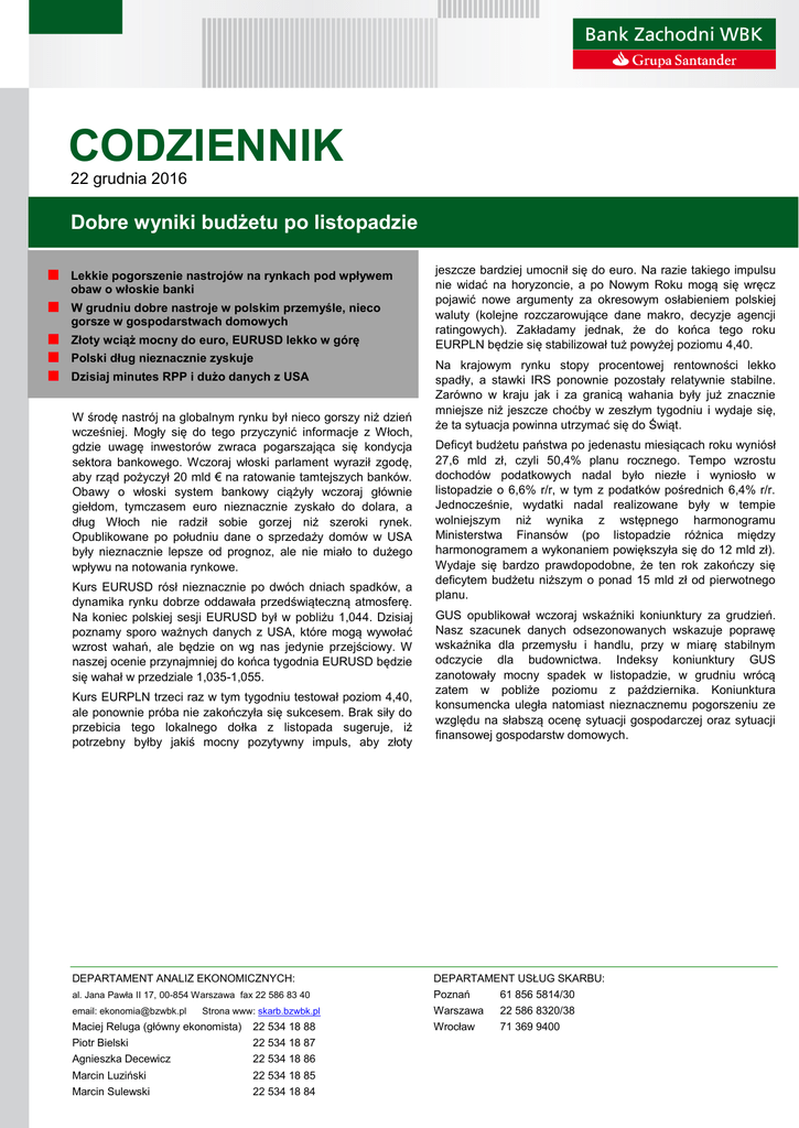 CODZIENNIK 22 grudnia 2016 Dobre wyniki budżetu po listopadzie Lekkie pogorszenie nastrojów na rynkach pod wpływem obaw o włoskie banki W grudniu dobre nastroje w polskim przemyśle, nieco gorsze w gospodarstwach domowych Złoty wciąż mocny do euro, EURUSD lekko w górę Polski dług nieznacznie zyskuje Dzisiaj minutes RPP i dużo danych z USA W środę nastrój na globalnym rynku był nieco gorszy niż dzień wcześniej. Mogły się do tego przyczynić informacje z Włoch, gdzie uwagę inwestorów zwraca pogarszająca się kondycja sektora bankowego. Wczoraj włoski parlament wyraził zgodę, aby rząd pożyczył 20 mld € na ratowanie tamtejszych banków. Obawy o włoski system bankowy ciążyły wczoraj głównie giełdom, tymczasem euro nieznacznie zyskało do dolara, a dług Włoch nie radził sobie gorzej niż szeroki rynek. Opublikowane po południu dane o sprzedaży domów w USA były nieznacznie lepsze od prognoz, ale nie miało to dużego wpływu na notowania rynkowe. Kurs EURUSD rósł nieznacznie po dwóch dniach spadków, a dynamika rynku dobrze oddawała przedświąteczną atmosferę. Na koniec polskiej sesji EURUSD był w pobliżu 1,044. Dzisiaj poznamy sporo ważnych danych z USA, które mogą wywołać wzrost wahań, ale będzie on wg nas jedynie przejściowy. W naszej ocenie przynajmniej do końca tygodnia EURUSD będzie się wahał w przedziale 1,035-1,055. Kurs EURPLN trzeci raz w tym tygodniu testował poziom 4,40, ale ponownie próba nie zakończyła się sukcesem. Brak siły do przebicia tego lokalnego dołka z listopada sugeruje, iż potrzebny byłby jakiś mocny pozytywny impuls, aby złoty jeszcze bardziej umocnił się do euro. Na razie takiego impulsu nie widać na horyzoncie, a po Nowym Roku mogą się wręcz pojawić nowe argumenty za okresowym osłabieniem polskiej waluty (kolejne rozczarowujące dane makro, decyzje agencji ratingowych). Zakładamy jednak, że do końca tego roku EURPLN będzie się stabilizował tuż powyżej poziomu 4,40. Na krajowym rynku stopy procentowej rentowności lekko spadły, a stawki IRS ponownie pozostały relatywnie stabilne. Zarówno w kraju jak i za granicą wahania były już znacznie mniejsze niż jeszcze choćby w zeszłym tygodniu i wydaje się, że ta sytuacja powinna utrzymać się do Świąt. Deficyt budżetu państwa po jedenastu miesiącach roku wyniósł 27,6 mld zł, czyli 50,4% planu rocznego. Tempo wzrostu dochodów podatkowych nadal było niezłe i wyniosło w listopadzie o 6,6% r/r, w tym z podatków pośrednich 6,4% r/r. Jednocześnie, wydatki nadal realizowane były w tempie wolniejszym niż wynika z wstępnego harmonogramu Ministerstwa Finansów (po listopadzie różnica między harmonogramem a wykonaniem powiększyła się do 12 mld zł). Wydaje się bardzo prawdopodobne, że ten rok zakończy się deficytem budżetu niższym o ponad 15 mld zł od pierwotnego planu. GUS opublikował wczoraj wskaźniki koniunktury za grudzień. Nasz szacunek danych odsezonowanych wskazuje poprawę wskaźnika dla przemysłu i handlu, przy w miarę stabilnym odczycie dla budownictwa. Indeksy koniunktury GUS zanotowały mocny spadek w listopadzie, w grudniu wrócą zatem w pobliże poziomu z października. Koniunktura konsumencka uległa natomiast nieznacznemu pogorszeniu ze względu na słabszą ocenę sytuacji gospodarczej oraz sytuacji finansowej gospodarstw domowych. DEPARTAMENT ANALIZ EKONOMICZNYCH: DEPARTAMENT USŁUG SKARBU: al. Jana Pawła II 17, 00-854 Warszawa fax 22 586 83 40 Poznań Warszawa 61 856 5814/30 22 586 8320/38 Wrocław 71 369 9400 email: [email protected] Strona www: skarb.bzwbk.pl Maciej Reluga (główny ekonomista) Piotr Bielski Agnieszka Decewicz 22 534 18 88 22 534 18 87 22 534 18 86 Marcin Luziński Marcin Sulewski 22 534 18 85 22 534 18 84 Rynek walutowy Dzisiejsze otwarcie EURPLN 4.4130 CZKPLN USDPLN 4.2260 HUFPLN* EURUSD 1.0443 RUBPLN CHFPLN 4.1204 NOKPLN GBPPLN 5.2260 DKKPLN USDCNY 6.9467 SEKPLN Kurs złotego 0.1633 1.4226 0.0695 0.4872 0.5936 0.4585 *za 100HUF Poprzednia sesja na rynku FX min max otwarcie EURPLN 4.405 4.432 4.418 USDPLN 4.230 4.269 4.230 EURUSD 1.035 1.045 1.044 21/12/2016 zamkn. fixing 4.412 4.418 4.244 4.2484 1.040 - Rynek stopy procentowej 21/12/2016 Obligacje na rynku międzybankowym Obligacja Zmiana Ostatnia Średnia % Papier (termin) (pb) aukcja rent. PS0418 (2L) 1.95 -2 15.12.2016 OK0419 2.14 PS0421 (5L) 2.69 -4 17.11.2016 PS0422 3.017 DS0726 (10L) 3.42 -2 3.11.2016 DS0727 3.289 Termin 1L 2L 3L 4L 5L 8L 10L Rentowności obligacji skabowych Stawki IRS na rynku międzybankowym** PL US EZ Zmiana Zmiana Zmiana % % % (pb) (pb) (pb) 1.76 0 1.20 0 -0.20 0 1.91 -1 1.49 -1 -0.15 0 2.05 -2 1.72 -2 -0.09 0 2.20 -2 1.91 -2 0.00 0 2.34 -3 2.05 -2 0.11 -1 2.69 -3 2.33 -2 0.48 -1 2.87 -2 2.44 -2 0.70 -2 Stawki WIBOR Termin % O/N T/N SW 2W 1M 3M 6M 9M 1Y Termin 1x4 3x6 6x9 9x12 3x9 6x12 1.49 1.51 1.60 1.63 1.66 1.73 1.81 1.83 1.85 Zmiana (pb) -10 -9 0 0 0 0 0 0 0 3-miesięczne stawki rynku pieniężnego Stawki FRA (na rynku międzybankowym)** Zmiana % (pb) 1.74 0 1.74 0 1.76 0 1.78 0 1.82 0 1.84 0 Spread 10-letnich obligacji do Bunda Kraj Polska Francja Węgry Hiszpania Włochy Portugalia Irlandia Niemcy Miary ryzyka fiskalnego CDS 5Y USD Wartość Zmiana (pb) 71 -1 37 0 116 1 78 0 153 0 273 0 62 0 22 0 Spread 10L* Wartość Zmiana (pb) 3.18 -2 0.45 0 2.92 1 1.14 2 1.59 2 3.52 1 0.54 -1 - *spread 10-letnich o bligacji skarbo wych do 10-letnich B undó w **Inf ormacje odnoszą się do stawek kupna na ry nku między bankowy m na koniec dnia Źró dł o : B lo o mberg Kalendarz wydarzeń i publikacji PROGNOZA CZAS W-WA KRAJ 11:00 EZ HICP XI % r/r 0,6 14:00 PL Płace w sektorze przedsiębiorstw XI % r/r 3,9 14:00 PL Zatrudnienie w sektorze przedsiębiorstw XI % r/r 3,0 3,0 3,1 3,1 14:30 US Rozpoczęte budowy domów XI tys. 1230 - 1090 1340 14:30 US Pozwolenia na budowę domów XI tys. 1240 - 1201 1260 10:00 GE Indeks Ifo XII pkt - - 111,0 110,4 14:00 PL Produkcja przemysłowa XII % r/