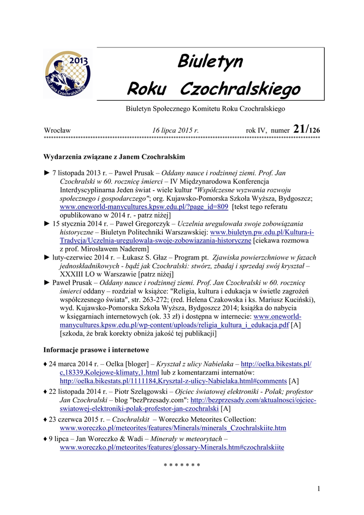 Biuletyn Roku Czochralskiego Biuletyn Społecznego Komitetu Roku Czochralskiego Wrocław 16 lipca 2015 r. rok IV, numer 21/126 ***************************************************************************************************************** Wydarzenia związane z Janem Czochralskim ► 7 listopada 2013 r. – Paweł Prusak – Oddany nauce i rodzinnej ziemi. Prof. Jan Czochralski w 60. rocznicę śmierci – IV Międzynarodowa Konferencja Interdyscyplinarna Jeden świat - wiele kultur "Współczesne wyzwania rozwoju społecznego i gospodarczego"; org. Kujawsko-Pomorska Szkoła Wyższa, Bydgoszcz; www.oneworld-manycultures.kpsw.edu.pl/?page_id=809 [tekst tego referatu opublikowano w 2014 r. - patrz niżej] ► 15 stycznia 2014 r. – Paweł Gregorczyk – Uczelnia uregulowała swoje zobowiązania historyczne – Biuletyn Politechniki Warszawskiej: www.biuletyn.pw.edu.pl/Kultura-iTradycja/Uczelnia-uregulowala-swoje-zobowiazania-historyczne [ciekawa rozmowa z prof. Mirosławem Naderem] ► luty-czerwiec 2014 r. – Łukasz S. Głaz – Program pt. Zjawiska powierzchniowe w fazach jednoskładnikowych - bądź jak Czochralski: stwórz, zbadaj i sprzedaj swój kryształ – XXXIII LO w Warszawie [patrz niżej] ► Paweł Prusak – Oddany nauce i rodzinnej ziemi. Prof. Jan Czochralski w 60. rocznicę śmierci oddany – rozdział w książce: "Religia, kultura i edukacja w świetle zagrożeń współczesnego świata", str. 263-272; (red. Helena Czakowska i ks. Mariusz Kuciński), wyd. Kujawsko-Pomorska Szkoła Wyższa, Bydgoszcz 2014; książka do nabycia w księgarniach internetowych (ok. 33 zł) i dostępna w internecie: www.oneworldmanycultures.kpsw.edu.pl/wp-content/uploads/religia_kultura_i_edukacja.pdf [A] [szkoda, że brak korekty obniża jakość tej publikacji] Informacje prasowe i internetowe ♦ 24 marca 2014 r. – Oelka [bloger] – Kryształ z ulicy Nabielaka – http://oelka.bikestats.pl/ c,18339,Kolejowe-klimaty,1.html lub z komentarzami internatów: http://oelka.bikestats.pl/1111184,Krysztal-z-ulicy-Nabielaka.html#comments [A] ♦ 22 listopada 2014 r. – Piotr Szelągowski – Ojciec światowej elektroniki - Polak; profestor Jan Czochralski – blog "bezPrzesady.com": http://bezprzesady.com/aktualnosci/ojciecswiatowej-elektroniki-polak-profestor-jan-czochralski [A] ♦ 23 czerwca 2015 r. – Czochralskit – Woreczko Meteorites Collection: www.woreczko.pl/meteorites/features/Minerals/minerals_Czochralskiite.htm ♦ 9 lipca – Jan Woreczko & Wadi – Minerały w meteorytach – www.woreczko.pl/meteorites/features/glossary-Minerals.htm#czochralskiite ******* 1 "Biuletyn Roku Czochralskiego" w internecie Z prawdziwą przyjemnością informujemy, że kolejne numery "Biuletynu..." są zamieszczane na stronie Klastra Przemysłowego Centralnego Okręgu Przemysłowego: www.copklaster.pl/cop/publikacje/periodyki/biuletyn_spolecznego_komitetu_roku_czochrals kiego,217,1,0.html. Dziękujemy! Równocześnie przypominamy, że komplet numerów można zobaczyć (i przeczytać!) także pod adresem: www.janczochralski.com/biuletyn/ . ***** Unia dla Czochralskiego Zjawiska powierzchniowe w fazach jednoskładnikowych - bądź jak Czochralski: stwórz, zbadaj i sprzedaj swój kryształ. Na taki projekt XXXIII Liceum Ogólnokształcące Dwujęzyczne im. Mikołaja Kopernika w Warszawie (ul. Bema 76) uzyskało finansowanie z funduszy unijnych w ramach IX edycji "Warszawskiej Inicjatywy Edukacyjnej" (http://edukacja.warszawa.pl/sites/ edukacja/files/warszawskie-inicjatywy-edukacyjne/5446/ attachments/lista_projektow_dofinansowanych_w_ramach_ix_edycji_wie.pdf). W pierwszej połowie 2014 r. odbyła się seria działań mających na celu zapoznanie uczniów z krystalografią (od strony teoretycznej i praktycznej) oraz pokazanie biznesowego wykorzystania zdobytej wiedzy. Partnerami projektu był Uniwersytet Warszawski i firmy handlowe. Podstawowym zadaniem było otrzymanie ciekłych kryształów. W tym kontekście dziwić może wykorzystanie Czochralskiego, który nie miał nic wspólnego z ciekłymi kryształami. Ale we wniosku napisano: "Podczas realizacji projektu zostanie prześledzona droga naukowa Jana Czochralskiego jako lidera syntezy ciekłych kryształów (...)". To chyba przykład... biznesowego podejścia do tematu ;-) ****** Niestrudzony pan Roman Tadych znalazł w internecie kolejne materiały o prof. Janie Czochralskim. Tym razem są to artykuły z gazety "Głos Krajny. Orędownik powiatowy" z 1935 r. (o ropie naftowej w Kcyni) i z 1936 r. (o procesie Czochralski-Broniewski). Zachęcamy innych do podobnych poszukiwań. Akcja skanowania starych dokumentów i udostępnianie ich w ramach bibliotek cyfrowych sprawia, że ciągle coś nowego można odnaleźć. ****** Sprostowanie W poprzednim numerze podana została informacja o ukazaniu się książki "Wielcy Polacy z Królestwa...". Autor rozdziału o Janie Czochralskim, prof. Józef Szudy, nadesłał sprostowanie tytułu - powinien on brzmieć: Jan Czochralski (1885-1953) z Kcyni na Pałukach. Książki nie mamy, więc w pierwotnej informacji podany został tytuł zamieszczony w spisie treści na stronie internetowej. Przepraszamy. *********** Paweł Tomaszewski INTiBS PAN 2