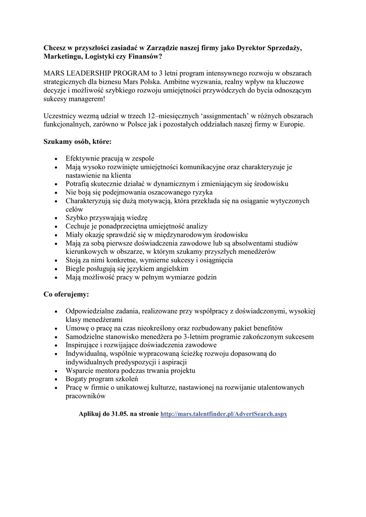 Chcesz w przyszłości zasiadać w Zarządzie naszej firmy jako Dyrektor Sprzedaży, Marketingu, Logistyki czy Finansów? MARS LEADERSHIP PROGRAM to 3 letni program intensywnego rozwoju w obszarach strategicznych dla biznesu Mars Polska. Ambitne wyzwania, realny wpływ na kluczowe decyzje i możliwość szybkiego rozwoju umiejętności przywódczych do bycia odnoszącym sukcesy managerem! Uczestnicy wezmą udział w trzech 12–miesięcznych ‘assignmentach’ w różnych obszarach funkcjonalnych, zarówno w Polsce jak i pozostałych oddziałach naszej firmy w Europie. Szukamy osób, które: Efektywnie pracują w zespole Mają wysoko rozwinięte umiejętności komunikacyjne oraz charakteryzuje je nastawienie na klienta Potrafią skutecznie działać w dynamicznym i zmieniającym się środowisku Nie boją się podejmowania oszacowanego ryzyka Charakteryzują się dużą motywacją, która przekłada się na osiąganie wytyczonych celów Szybko przyswajają wiedzę Cechuje je ponadprzeciętna umiejętność analizy Miały okazję sprawdzić się w międzynarodowym środowisku Mają za sobą pierwsze doświadczenia zawodowe lub są absolwentami studiów kierunkowych w obszarze, w którym szukamy przyszłych menedżerów Stoją za nimi konkretne, wymierne sukcesy i osiągnięcia Biegle posługują się językiem angielskim Mają możliwość pracy w pełnym wymiarze godzin Co oferujemy: Odpowiedzialne zadania, realizowane przy współpracy z doświadczonymi, wysokiej klasy menedżerami Umowę o pracę na czas nieokreślony oraz rozbudowany pakiet benefitów Samodzielne stanowisko menedżera po 3-letnim programie zakończonym sukcesem Inspirujące i rozwijające doświadczenia zawodowe Indywidualną, wspólnie wypracowaną ścieżkę rozwoju dopasowaną do indywidualnych predyspozycji i aspiracji Wsparcie mentora podczas trwania projektu Bogaty program szkoleń Pracę w firmie o unikatowej kulturze, nastawionej na rozwijanie utalentowanych pracowników Aplikuj do 31.05. na stronie http://mars.talentfinder.pl/AdvertSearch.aspx