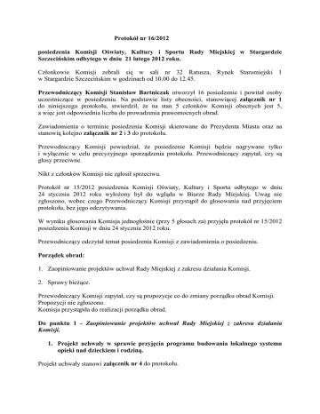 Protokół nr 16/2012 posiedzenia Komisji Oświaty, Kultury i Sportu Rady Miejskiej w Stargardzie Szczecińskim odbytego w dniu 21 lutego 2012 roku. Członkowie Komisji zebrali się w sali nr 32 Ratusza, Rynek Staromiejski 1 w Stargardzie Szczecińskim w godzinach od 10.00 do 12.45. Przewodniczący Komisji Stanisław Bartniczak otworzył 16 posiedzenie i powitał osoby uczestniczące w posiedzeniu. Na podstawie listy obecności, stanowiącej załącznik nr 1 do niniejszego protokołu, stwierdził, że na stan 5 członków Komisji obecnych jest 5, a więc jest odpowiednia liczba do prowadzenia prawomocnych obrad. Zawiadomienia o terminie posiedzenia Komisji skierowane do Prezydenta Miasta oraz aa stanowią kolejno załącznik nr 2 i 3 do protokołu. Przewodniczący Komisji powiedział, że posiedzenie Komisji będzie nagrywane tylko i wyłącznie w celu precyzyjnego sporządzenia protokołu. Przewodniczący zapytał, czy są głosy przeciwne. Nikt z członków Komisji nie zgłosił sprzeciwu. Protokół nr 15/2012 posiedzenia Komisji Oświaty, Kultury i Sportu odbytego w dniu 24 stycznia 2012 roku wyłożony był do wglądu w Biurze Rady Miejskiej. Uwag nie zgłoszono, wobec czego Przewodniczący Komisji przystąpił do głosowania nad przyjęciem protokołu, bez jego odczytywania. W wyniku głosowania Komisja jednogłośnie (przy 5 głosach za) przyjęła protokół nr 15/2012 posiedzenia Komisji w dniu 24 stycznia 2012 roku. Przewodniczący odczytał temat posiedzenia Komisji z zawiadomienia o posiedzeniu. Porządek obrad: 1. Zaopiniowanie projektów uchwał Rady Miejskiej z zakresu działania Komisji. 2. Sprawy bieżące. Przewodniczący Komisji zapytał, czy są propozycje co do zmiany porządku obrad Komisji. Propozycji nie zgłoszono. Komisja przystąpiła do realizacji porządku obrad. Do punktu 1 - Zaopiniowanie projektów uchwał Rady Miejskiej z zakresu działania Komisji. 1. Projekt uchwały w sprawie przyjęcia programu budowania lokalnego systemu opieki nad dzieckiem i rodziną. Projekt uchwały stanowi załącznik nr 4 do protokołu. Zastępca Prezydenta Miasta Rafał Zając dokonał wprowadzenia do projektu uchwały. Pytań nie zgłoszono, wobec czego Przewodniczący Komisji Stanisław Bartniczak poddał projekt uchwały pod głosowanie. Komisja jednogłośnie (przy 5 głosach za) pozytywnie zaopiniowała projekt uchwały w sprawie przyjęcia programu budowania lokalnego systemu opieki nad dzieckiem i rodziną. 2. Projekt w sprawie wyrażenia zgody na zawarcie kolejnej umowy z Panem Ryszardem Wolskim. Projekt uchwały stanowi załącznik nr 5 do protokołu. Zastępca Prezydenta Miasta Rafał Zając dokonał wprowadzenia do projektu uchwały. Pytań nie zgłoszono, wobec czego Przewodniczący Komisji Stanisław Bartniczak poddał projekt uchwały pod głosowanie. Komisja jednogłośnie (przy 5 głosach za) pozytywnie zaopiniowała projekt uchwały w sprawie wyrażenia zgody na zawarcie kolejnej umowy z Panem Ryszardem Wolskim. 3. Sprawozdanie z wysokości średnich wynagrodzeń nauczycieli na poszczególnych stopniach awansu zawodowego w szkołach prowadzonych przez jednostkę samorządu terytorialnego. Sprawozdanie stanowi załącznik nr 6 do protokołu. Pytań nie zgłoszono, wobec czego Przewodniczący Komisji Stanisław Bartniczak poddał sprawozdanie pod głosowanie. Komisja jednogłośnie (przy 5 głosach za) pozytywnie zaopiniowała sprawozdanie z wysokości średnich wynagrodzeń nauczycieli na poszczególnych stopniach awansu zawodowego w szkołach prowadzonych przez jednostkę samorządu terytorialnego. Do punktu 2 – Sprawy bieżące. Przewodniczący Komisji Stanisław Bartniczak powiedział, że na wniosek Ministerstwa Administracji i Cyfryzacji Rada Miejska wyrazi opinię dotyczącą zmiany nazwy: 1) gminy Stargard Szczeciński z siedzibą władz w Stargardzie Szczecińskim na gminę Stargard z siedzibą władz w Stargardzie, 2) siedziby powiatu stargardzkiego ze Stargardu Szczecińskiego na Stargard. Przewodniczący kontynuując powiedział, że Prezydent Miasta poinformował, że szacunkowe koszty związane z ewentualną zmianą nazwy Gminy-Miasto Stargard Szczeciński z siedzibą w Stargardzie Szczecińskim na Gminę-Miasto Stargard z siedzibą w Stargardzie wynoszą około 500 zł i związane są jedynie z koniecznością dostosowania pieczęci urzędowych. 2 Podstawowe koszty wiążą się ze zmianą główną, tj. zmianą nazwy miejscowości Stargard Szczeciński na Stargard. Przewodniczący zapytał, czy są wnioski bądź uwagi. Nie zgłoszono wniosków ani uwag, wobec czego Przewodniczący przystąpił do głosowania. Komisja jednogłośnie (przy 5 głosach za) wyraziła pozytywną opinię dotyczącą zmiany nazwy gminy Stargard Szczeciński z siedzibą władz w Stargardzie Szczecińskim na gminę Stargard z siedzibą władz w Stargardzie. Komisja jednogłośnie (przy 5 głosach za) wyraziła pozytywną opinię dotyczącą zmiany nazwy siedziby powiatu stargardzkiego ze Stargardu Szczecińskiego na Stargard. Wniosek Ministerstwa Administracji i Cyfryzacji oraz informacja Prezydenta Miasta dotycząca ww. sprawy stanowią załącznik nr 7 do protokołu. Komisja przyjęła do wiadomości: - odpis wyroku wraz z uzasadnieniem Wojewódzkiego Sądu Administracyjnego w Szczecinie, w sprawie Sygn. akt II SA/Sz 1266/11 ze skargi Wojewody Zachodniopomorskiego na uchwałę Rady Miejskiej w Stargardzie Szczecińskim z dnia 31 maja 2011 r. Nr VII/90/2011 w przedmiocie ustalenia czasu bezpłatnego nauczania, wychowania i opieki oraz określenia wysokości opłat za świadczenia przekraczające bezpłatne zajęcia, stwierdził nieważność zaskarżonej uchwały, stanowi załącznik nr 8 do protokołu; - sprawozdanie z kontroli przeprowadzonej w dniu 25 stycznia 2012 roku w Urzędzie Miejskim w Stargardzie Szczecińskim przez Komisję Rewizyjną Rady Miejskiej w Stargardzie Szczecińskim w zakresie prawidłowości wykonywania przez organ wykonawczy postanowień uchwa