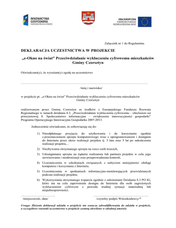 Załącznik nr 1 do Regulaminu DEKLARACJA UCZESTNICTWA W PROJEKCIE „e-Okno na świat” Przeciwdziałanie wykluczeniu cyfrowemu mieszkańców Gminy Czorsztyn Oświadczam(y), Ŝe wyraŜam(y) zgodę na uczestnictwo ……………………………………………………………………………………………………… /imię i nazwisko/ w projekcie pt. „e-Okno na świat” Przeciwdziałanie wykluczeniu cyfrowemu mieszkańców Gminy Czorsztyn realizowanym przez Gminę Czorsztyn ze środków z Europejskiego Funduszu Rozwoju Regionalnego w ramach działania 8.3. „Przeciwdziałanie wykluczeniu cyfrowemu – eInclusion osi priorytetowej 8. Społeczeństwo informacyjne – zwiększenie innowacyjności gospodarki” Programu Operacyjnego Innowacyjna Gospodarka 2007-2013. Jednocześnie oświadczam, Ŝe zobowiązuję się do: 1) Nieodpłatnego przyjęcia do uŜytkowania i do korzystania zgodnie z przeznaczeniem sprzętu komputerowego wraz z oprogramowaniem i dostępem do Internetu przez okres realizacji projektu tj. 3 lata oraz 5 lat po zakończeniu realizacji projektu, , 2) Niezbywania otrzymanego sprzętu na rzecz osób trzecich, 3) Udostępniania sprzętu na Ŝądanie realizatora lub partnera projektu w celu jego serwisowania i modernizacji oraz przeprowadzenia kontroli, 4) Uczestniczenia w szkoleniach związanych z nabyciem umiejętności obsługi komputera i korzystania z Internetu. 5) Uczestniczenia w spotkaniach informacyjno-monitorujących przewidzianych podczas realizacji projektu. 6) Wykorzystania otrzymanego wsparcia zgodnie z załoŜeniami Działania 8.3 PO IG, które ma na celu zapewnienie dostępu do Internetu dla osób zagroŜonych wykluczeniem cyfrowym z powodu trudnej sytuacji materialnej lub niepełnosprawności. ………………………….. /miejscowość, data/ …………………………………………… /czytelny podpis Wnioskodawcy/* Uwaga: ZłoŜenie deklaracji udziału w projekcie nie oznacza zakwalifikowania do udziału w projekcie, a szczegółowe warunki uczestnictwa w projekcie zostaną określone w odrębnej umowie. Załącznik nr 2 do Regulaminu FORMULARZ ZGŁOSZENIOWY DO PROJEKTU „e-Okno na świat” Przeciwdziałanie wykluczeniu cyfrowemu mieszkańców Gminy Czorsztyn 1. DANE SKŁADAJĄCEGO WNIOSEK Imię i nazwisko Data urodzenia Miejsce PESEL Wiek Płeć K M Rodzaj, seria i nr dokumentu toŜsamości Adres zameldowania Rodzaj zameldowania stałe czasowe Ulica Nr domu Nr lokalu Miejscowość Kod pocztowy Poczta Adres zamieszkania1 Ulica Nr domu Nr lokalu Miejscowość Kod pocztowy Poczta Dane kontaktowe Tel. stacjonarny Adres email Tel. komórkowy Krótkie uzasadnienie udziału w projekcie 2. DANE DZIECKA ZGŁASZANEGO DO PROJEKTU Imię i nazwisko Data urodzenia Miejsce PESEL Wiek Płeć Rodzaj szkoły do której uczęszcza K M Siedziba szkoły, do której uczęszcza uczeń podstawowa ponadgimnazjalna gimnazjum Adres zameldowania Rodzaj zameldowania stałe czasowe Ulica Nr domu Nr lokalu Miejscowość Kod pocztowy Poczta Adres zamieszkania1 Ulica Nr domu Nr lokalu Miejscowość Kod pocztowy Poczta Oświadczenie o niepełnosprawności2 Stopień niepełnosprawności ZNACZNY LEKKI UMIARKOWANY WAZNE DO …………………………… BEZTERMINOWE Orzeczenie o niepełnosprawności Rodzaj niepełnosprawności WAśNE DO……………………………. BEZTERMINOWE schorzenie narządu ruchu upośledzenie umysłowe schorzenie narządu wzroku inne (proszę wpisać jakie) …………………………………………….. schorzenie narządu słuchu Oświadczenia: 1 Świadomy(a) odpowiedzialności karnej przewidzianej w art. 233 ustawy z dnia 6 czerwca 1997 r. Kodeks karny /Dz. U. Nr 88, poz. 553 z poźn. zm./ oświadczam, Ŝe wszystkie dane zawarte w Formularzu Zgłoszeniowym są zgodne z prawdą. 2 Oświadczam, Ŝe w moim gospodarstwie domowym nie ma komputera i nie ma dostępu do Internetu. 3 Oświadczam, iŜ ………………………………………………………………………….. /Imię i nazwisko dziecka/ otrzymuje/nie otrzymuje3 stypendium socjalne. 4 Oświadczam, iŜ moje gospodarstwo domowe jest/nie jest3 uprawnione do korzystania z systemu świadczeń rodzinnych lub pomocy społecznej. 5 Oświadczam, iŜ zapoznałem(am) się z Regulaminem rekrutacji i uczestnictwa w projekcie „e-Okno na świat” Przeciwdziałanie wykluczeniu cyfrowemu mieszkańców Gminy Czorsztyn, akceptuję jego postanowienia i zobowiązuje się do jego przestrzegania. 6 Oświadczam, Ŝe zostałem(am) poinformowany(a), Ŝe niniejszy Projekt jest współfinansowany ze środków Unii Europejskiej z Europejskiego Funduszu Rozwoju Regionalnego w ramach Programu Operacyjnego Innowacyjna Gospodarka. 7 Zobowiązuję się do przedłoŜenia wszelkich informacji, dokumentów oraz oświadczeń niezbędnych do prawidłowej realizacji projektu. 8. Przyjmuję do wiadomości, Ŝe złoŜenie Deklaracji Uczestnictwa oraz Formularza Zgłoszeniowego nie jest jednoznaczne z przyjęciem mnie do Projektu. 9. Przyjmuję do wiadomości, Ŝe decyzja Komisji Rekrutacyjnej jest ostateczna i nie słuŜy od niej odwołanie. 10. Zgodnie z ustawą z dnia 29 sierpnia 1997 r. o ochronie danych osobowych (Dz. U. z 2002 r. Nr 101 poz. 926 z późn. zm.) wyraŜam zgodę na przetwarzanie moich danych osobowych dla potrzeb procesu rekrutacji, realizacji, ewaluacji, monitoringu i sprawozdawczości projektu „e-Okno na świat” Przeciwdziałanie wykluczeniu cyfrowemu mieszkańców Gminy Czorsztyn w ramach Programu Operacyjnego Innowacyjna Gospodarka. Zostałem(am) poinformowany(na) o prawie dostępu do przetwarzanych przez realizatorów projektu moich danych osobowych wraz z prawem do Ŝądania ich zmian, uzupełnienia lub usunięcia. …………………………………………….. /miejscowość, data/ …………………………………………………………………… /czytelny podpis Wnioskodawcy/* 1 wypełnić tylko w przypadku gdy jest inny niŜ adres zameldowan