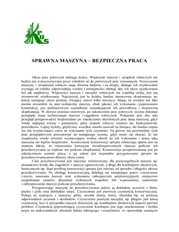 SPRAWNA MASZYNA – BEZPIECZNA PRACA Okres prac polowych dobiega końca. Większość maszyn i urządzeń rolniczych nie będzie już wykorzystywana przez rolników aż do pierwszych prac wiosennych. Nowoczesne maszyny i urządzenia rolnicze mają złożoną budowę i są drogie, dlatego ich użytkowanie wymaga od rolnika odpowiedniej wiedzy i umiejętności obsługi aby ich okres użytkowania był jak najdłuższy. Większości maszyn i narzędzi rolniczych ma wspólną cechę, jest nią sezonowość użytkowania. Najczęściej jest to krótka, bardzo intensywna eksploatacja, po której następuje okres postoju, trwający nawet kilka miesięcy. Mając na uwadze ten fakt można stwierdzić że stan techniczny maszyn, obok jakości ich wykonania i poprawności konstrukcji, jest podstawowym czynnikiem warunkującym ich prawidłową i bezpieczną eksploatację. W okresie jesienno-zimowym, po zakończeniu prac polowych, można dokonać przeglądu stanu technicznego maszyn i ciągników rolniczych. Wskazane jest, aby taki przegląd przeprowadzić bezpośrednio po zakończeniu określonych prac daną maszyną, gdyż wtedy najlepiej wiemy i pamiętamy, jakie zespoły robocze ostatnio nie funkcjonowały prawidłowo. Lepiej byłoby, gdybyśmy wszelkie usterki usuwali na bieżąco, ale bardzo często nie ma wystarczająco czasu na wykonanie tych czynności. Na pewno nie powinniśmy tych prac przeglądowych pozostawiać do następnego sezonu, gdyż może się okazać, że nie znajdziemy wtedy również wystarczająco wolnej chwili na ich wykonanie i praca taką maszyną nie będzie bezpieczna. Konieczność konserwacji sprzętu rolniczego oparta jest na znanym fakcie, że zniszczenia korozyjne niezabezpieczonych maszyn podczas ich przechowywania są większe niż podczas eksploatacji. Konserwacja przeprowadzana jest po zakończonym sezonie pracy, a jej celem jest racjonalne przygotowanie sprzętu do przechowywania przez dłuższy okres czasu. Czas przechowywania jest znacznie zróżnicowany dla poszczególnych maszyn np. stosunkowo krótki dla ciągników i maszyn uprawowych, a długi dla kombajnów zbożowych, buraczanych itp. Stąd przebieg konserwacji sprzętu jest zależny od sposobu i długości okresu przechowywania. Na obsługę konserwacyjną składają się następujące prace: czyszczenie i mycie, usuwanie korozji oraz wykonanie zabezpieczeń antykorozyjnych, miejscowe uzupełnianie smarów, demontaż wybranych zespołów lub wyposażenia, ustawienie i zabezpieczenie maszyn podczas przechowywania. Przygotowując maszynę do przechowywania należy ją dokładnie oczyścić z błota, piasku i pyłu oraz dokładnie umyć. Czyszczenie jest pierwszą czynnością konserwacyjną. Polega na usunięciu z maszyny gleby, resztek słomy, trawy, obornika itp. za pomocą odpowiednich szczotek i skrobaków. Czyszczenie prostych narzędzi, np. pługów jest łatwą czynnością, lecz w przypadku maszyn złożonych, np. kombajnów zbożowych stanowi pewien problem. Czynnością poprzedzającą czyszczenie kombajnu jest jego uruchomienie i krótka praca na maksymalnych obrotach bębna młócącego i wentylatora, co spowoduje usunięcie znacznej części zanieczyszczeń. Skuteczne oczyszczenie wnętrza kombajnu wymaga demontażu sit podsiewacza i klepiska, zeskrobania zbitych i przyklejonych zanieczyszczeń oraz usunięciu lżejszych zanieczyszczeń sprężonym powietrzem. W przypadku rozsiewaczy nawozów mineralnych zaleca się czyszczenie na polu bezpośrednio po zabiegu z uwagi na agresywne działanie użytych chemikaliów i możliwość zatruć inwentarza. Umyć i oczyścić należy wszystkie podzespoły, zwracając szczególną uwagę na te, które w czasie pracy ulęgają silnemu zanieczyszczeniu, np. zespoły robocze maszyn uprawowych, do nawożenia, chemicznej ochrony roślin, przenośniki w maszynach do zbioru okopowych. Maszyny stosowane do zbioru materiałów słomiastych (prasy, przyczepy zbierające, itp.), kombajny do zbioru zbóż lub zielonkowe powinny być gruntownie oczyszczone z pozostałości roślinnych (zielonka, siano, słoma, plewy, pył, itp.), gdyż materiał taki wchłania wilgoć, co sprzyja procesom korozyjnym. Ponadto istnieje niebezpieczeństwo żerowania różnych gryzoni, które mogą spowodować uszkodzenia elementów lub części instalacji elektrycznej, hydraulicznej i pneumatycznej, a także elementów uszczelniających (uszczelniaczy gumowych, fartuchów lub elastycznych osłon). Aby uzyskać dobry efekt mycia, należy w pierwszej kolejności usunąć większe partie zanieczyszczeń, a następnie użyć wody. Unikać mycia pod ciśnieniem w temperaturze otoczeni poniżej 10oC i kierowania strumienia wody bezpośrednio na urządzenia elektryczne, węzły łożyskowe, uszczelki, przekładnie, korki wlewu oleju i zbiornika paliwa, układ wydechowy silnika, filtry powietrza silnika i kabiny. Przy użyciu myjni wysokociśnieniowej utrzymywać odległość co najmniej 30 cm między dyszą a mytą powierzchnią i kierować strumień wody (bez używania chemikaliów) pod kątem co najmuje 25 o (nie kierować strumienia prostopadle), pod ciśnieniem nie przekraczającym 60 bar i o temperaturze nie większej niż 60oC. Właściwą praktyką jest oczyszczenie użytej wody przez zgromadzenie jej w odpowiednich zbiornikach i pozostawienie na określony czas w celu rozdziału zanieczyszczeń, w szczególności odzyskanie oleju oraz kontrolowane usunięcie pozostałości. Do mycia zastosować można roztwory alkaliczne (wodorotlenek sodu) lub środki emulgujące (roztwory wodne). Podczas mycia wygodnie jest ustawić maszynę na pochyłości, otworzyć wszystkie pokrywy przeglądowe, a po oczyszczeniu i umyciu pozostawić ją w miejscu przewiewnym w celu osuszenia. Kolejną, ważną czynnością po myciu maszyny jest nasmarowanie maszyny według schematu zamieszczonego w instrukcji maszyny. W celu zabezpieczenia na okres zimowy łożysk (zarówno tocznych jak i ślizgowych) oraz przek