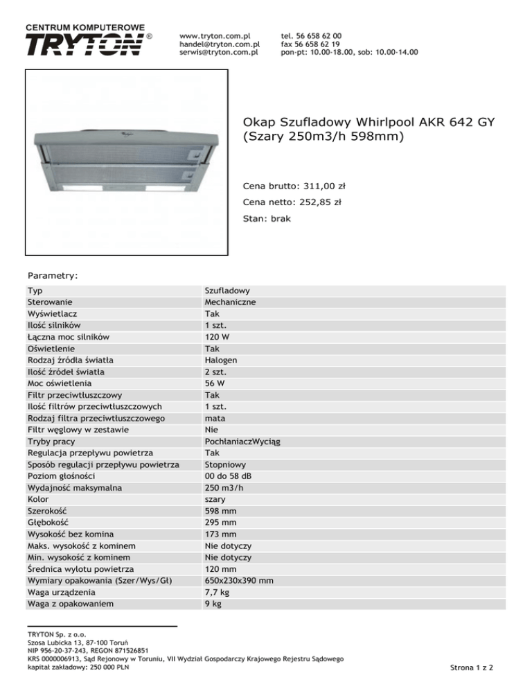 www.tryton.com.pl [email protected] [email protected] tel. 56 658 62 00 fax 56 658 62 19 pon-pt: 10.00-18.00, sob: 10.00-14.00 Okap Szufladowy Whirlpool AKR 642 GY (Szary 250m3/h 598mm) Cena brutto: 311,00 zł Cena netto: 252,85 zł Stan: brak Parametry: Typ Sterowanie Wyświetlacz Ilość silników Łączna moc silników Oświetlenie Rodzaj źródła światła Ilość źródeł światła Moc oświetlenia Filtr przeciwtłuszczowy Ilość filtrów przeciwtłuszczowych Rodzaj filtra przeciwtłuszczowego Filtr węglowy w zestawie Tryby pracy Regulacja przepływu powietrza Sposób regulacji przepływu powietrza Poziom głośności Wydajność maksymalna Kolor Szerokość Głębokość Wysokość bez komina Maks. wysokość z kominem Min. wysokość z kominem Średnica wylotu powietrza Wymiary opakowania (Szer/Wys/Gł) Waga urządzenia Waga z opakowaniem Szufladowy Mechaniczne Tak 1 szt. 120 W Tak Halogen 2 szt. 56 W Tak 1 szt. mata Nie PochłaniaczWyciąg Tak Stopniowy 00 do 58 dB 250 m3/h szary 598 mm 295 mm 173 mm Nie dotyczy Nie dotyczy 120 mm 650x230x390 mm 7,7 kg 9 kg TRYTON Sp. z o.o. Szosa Lubicka 13, 87-100 Toruń NIP 956-20-37-243, REGON 871526851 KRS 0000006913, Sąd Rejonowy w Toruniu, VII Wydział Gospodarczy Krajowego Rejestru Sądowego kapitał zakładowy: 250 000 PLN Strona 1 z 2 www.tryton.com.pl [email protected] [email protected] Moc przyłączeniowa Min. napięcie zasilania Maks. napięcie zasilania Strona www produktu tel. 56 658 62 00 fax 56 658 62 19 pon-pt: 10.00-18.00, sob: 10.00-14.00 200 W 220 V 240 V http://www.whirlpool.pl/okap%2cpoch%C5%82anianie-zapach%C3%B3w%2 cokap-kominowy%2ckuchnia-[AKR-642-GY]-601402/857864210000/ Mimo dołożenia wszelkich starań nie gwarantujemy, że publikowane dane techniczne nie zawierają uchybień lub błędów. W przypadku jakichkolwiek wątpliwości prosimy przed podjęciem decyzji o kontakt z handlowcem. Przedstawiona oferta cenowa ma charakter informacyjny, nie stanowi oferty handlowej w rozumieniu Art.66 par.1 Kodeksu Cywilnego oraz innych właściwych przepisów prawnych. TRYTON Sp. z o.o. Szosa Lubicka 13, 87-100 Toruń NIP 956-20-37-243, REGON 871526851 KRS 0000006913, Sąd Rejonowy w Toruniu, VII Wydział Gospodarczy Krajowego Rejestru Sądowego kapitał zakładowy: 250 000 PLN Strona 2 z 2