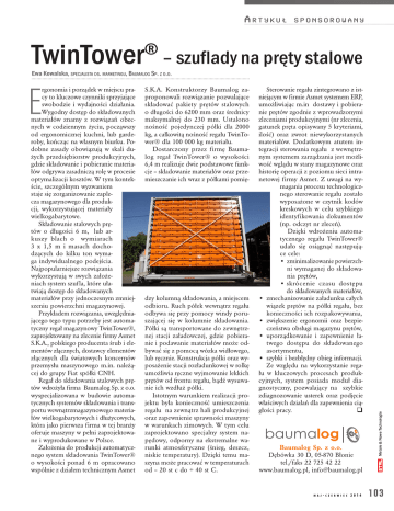 Artykuł – szuflady na pręty stalowe Ewa Kowalska, specjalista ds. marketingu, Baumalog Sp. z o.o. E rgonomia i porządek w miejscu pracy to kluczowe czynniki sprzyjające swobodzie i wydajności działania. Wygodny dostęp do składowanych materiałów znamy z rozwiązań obecnych w codziennym życiu, począwszy od ergonomicznej kuchni, lub garderoby, kończąc na własnym biurku. Podobne zasady obowiązują w skali dużych przedsiębiorstw produkcyjnych, gdzie składowanie i pobieranie materiałów odgrywa zasadniczą rolę w procesie optymalizacji kosztów. W tym kontekście, szczególnym wyzwaniem staje się zorganizowanie zaplecza magazynowego dla produkcji, wykorzystującej materiały wielkogabarytowe. Składowanie stalowych prętów o długości 6 m, lub arkuszy blach o wymiarach 3 x 1,5 m i masach dochodzących do kilku ton wymaga indywidualnego podejścia. Najpopularniejsze rozwiązania wykorzystują w swych założeniach system szufla, które ułatwiają dostęp do składowanych materiałów przy jednoczesnym zmniejszeniu powierzchni magazynowej. Przykładem rozwiązania, uwzględniającego tego typu potrzeby jest automatyczny regał magazynowy TwinTower®, zaprojektowany na zlecenie firmy Asmet S.K.A., polskiego producenta śrub i elementów złącznych, dostawcy elementów złącznych dla światowych koncernów przemysłu maszynowego m.in. należącej do grupy Fiat spółki CNH. Regał do składowania stalowych prętów wdrożyła firma Baumalog Sp. z o.o. wyspecjalizowana w budowie automatycznych systemów składowania i transportu wewnątrzmagazynowego materiałów wielkogabarytowych i dłużycowych, która jako pierwsza firma w tej branży oferuje maszyny w pełni zaprojektowane i wyprodukowane w Polsce. Założenia do produkcji automatycznego system składowania TwinTower® o wysokości ponad 6 m opracowano wspólnie z działem technicznym Asmet S.K.A. Konstruktorzy Baumalog zaproponowali rozwiązanie pozwalające składować pakiety prętów stalowych o długości do 6200 mm oraz średnicy maksymalnej do 230 mm. Ustalono nośność pojedynczej półki dla 2000 kg, a całkowitą nośność regału TwinTower® dla 100 000 kg materiału. Dostarczony przez firmę Baumalog regał TwinTower® o wysokości 6,4 m realizuje dwie podstawowe funkcje – składowanie materiałów oraz przemieszczanie ich wraz z półkami pomię- dzy kolumną składowania, a miejscem odbioru. Ruch półek wewnątrz regału odbywa się przy pomocy windy poruszającej się w kolumnie składowania. Półki są transportowane do zewnętrznej stacji załadowczej, gdzie pobieranie i podawanie materiałów może odbywać się z pomocą wózka widłowego, lub ręcznie. Konstrukcja półki oraz wyposażenie stacji rozładunkowej w rolkę umożliwia ręczne wyjmowanie lekkich prętów od frontu regału, bądź wysuwanie ich wzdłuż półki. Istotnym warunkiem realizacji projektu była konieczność umieszczenia regału na zewnątrz hali produkcyjnej oraz zapewnienie sprawności maszyny w warunkach zimowych. W tym celu zaprojektowano specjalny system napędowy, odporny na ekstremalne warunki atmosferyczne (śnieg, deszcz, niskie temperatury). Dzięki temu maszyna może pracować w temperaturach od – 20 st c do + 40 st C. idee maszynyUR]ZLĈ]DQLD Automatyczne systemy magazynowe Sterowanie regału zintegrowano z istMonoTower i TwinTowerNY]UĚKNYaKXSK niejącym w firmie Asmet systemem ERP, OVOWOX^ÌaNĚ_ŔcMYacMRK\U_]dc umożliwiając m.in dostawy i pobieraZKVO^Z\dc\dÞNÌaSaSOV_SXXcMRK\^cnie prętów zgodnie z wprowadzonymi U_ĚÌaYN_ŔcMRacWSK\KMRSWK]SO zleceniami produkcyjnymi (nr zlecenia, gatunek pręta opisywany 5 kryteriami, ilość)MonoTower oraz zwrot®niewykorzystanych / TwinTower® materiałów. Dodatkowym atutem integracji sterowania regału z wewnętrz ĚKNYaXYijàNYUQXKZÌĚUò nym systemem zarządzania jest możli WKU]cWKVXKNĚ_QYijàZÌĚUSvW wość wglądu w stany magazynowe oraz WYN_ĚYaKL_NYaK_WYŔVSaSKTÞMK historię operacji z poziomu sieci intranetowej\YdL_NYaòS]^XSOTÞMOQY]c]^OW_ firmy Asmet. Z uwagi na wy ]^O\YaKXSOdSX^OQ\YaKXOd]c]^Omagania procesu technologicznego sterowanie regału zostało WKWS/<:SA7= wyposażone w czytnik kodów WYŔVSaYijàdKL_NYacXKdOaXÞ^\d kreskowych w celu szybkiego L_NcXU_ identyfikowania dokumentów \ÌŔXOaK\SKX^c_WSOT]MYaSOXSK (np. odczyt nr zleceń). Z_XU^ÌaNY]^òZYacMR Dzięki wdrożeniu automa Y]dMdòNXYijàZYaSO\dMRXSWKQKtycznego regału TwinTower® udało się osiągnąć następujądcXYaOT ce cele: ® • zminimalizowanie powierzch<OQKĚK_^YWK^cMdXc MonoTower ni wymaganej do składowania prętów, • s krócenie czasu dostępu do składowanych materiałów, • zmechanizowanie załadunku całych wiązek prętów na półki regału, bez konieczności ich rozpakowywania, • zwiększenie ergonomii oraz bezpieczeństwa obsługi magazynu prętów, • uporządkowanie i zapewnienie łatwego dostępu do składowanego asortymentu, • szybki i bezbłędny obieg informacji. ĚK^acdKĚKN_XOUSacĚKN_XOUY\Kd Ze względu na wykorzystanie rega]dcLUSNY]^òZNYK\^cU_ĚÌa łu w kluczowych procesach produk _XSaO\]KVXYijàSNYZK]YaKXSONY cyjnych, system posiada moduł diaaK\_XUÌaWKQKdcXYacMR gnostyczny, pozwalający na szybkie WYŔVSaYijàSX^OQ\KMTSdWK]dcXKzdiagnozowanie usterek oraz podjęcie właściwych działań dla zapewnienia ciąWSMSÞQ_^OMRXYVYQSMdXOQYY\Kd głości pracy. d]c]^OWKWSSXPY\WK^cMdXcWS q baumalog Baumalog Sp. z o.o. Baumalog Sp. z o.o. Dębówka 30 D, 05-870 Błonie .òLÌaUK."!,ĚYXSO tel./faks! tel./faks 22 725 42 22 www. baumalog.pl,[email protected] [email protected] www.baumalog.pl, m a j - c z e r w i e c 2014 Metale & Nowe Technologie TwinTower ® sponsorowany 103