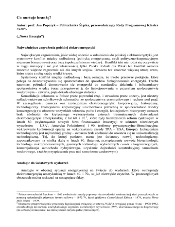 Co nurtuje branŜę? Autor: prof. Jan Popczyk – Politechnika Śląska, przewodniczący Rady Programowej Klastra 3x20% („Nowa Energia”) NajwaŜniejsze zagroŜenia polskiej elektroenergetyki Największym zagroŜeniem, jakie widzę obecnie w odniesieniu do polskiej elektroenergetyki, jest systemowy konflikt między nadbudową (polityką energetyczną, czyli polityczno-korporacyjnym sojuszem biznesowym) oraz bazą (społeczeństwem wiedzy). Konflikt taki nie rodzi się oczywiście w ciągu miesięcy i nie jest właściwością tylko Polski. Jednak dla Polski ten konflikt oznacza znacznie większe zagroŜenie niŜ dla innych krajów. Oznacza teŜ znacznie większą utratę szans, które niesie z sobą kaŜdy wielki kryzys. Systemowy konflikt między nadbudową i bazą oznacza, Ŝe trzeba przerwać podejście, które polega na dostosowywaniu się społeczeństwa do sposobów funkcjonowania energetyki. Trzeba natomiast pobudzić dostosowanie się energetyki do standardów działania i infrastruktury społeczeństwa wiedzy (oraz przygotować ją do funkcjonowania w przyszłym społeczeństwie wodorowym – czwarta, piąta dekada obecnego stulecia). Konsolidacja dokonana w Polsce przez poprzedni rząd, i utrwalana przez obecny, jest niestety naśladownictwem schyłkowych schematów ze społeczeństwa przemysłowego i ruchem pod prąd. W szczególności oznacza ona izolacjonizm elektroenergetyki: korporacyjny, historyczny, technologiczny. Izolacjonizm korporacyjny uniemoŜliwia potrzebną w społeczeństwie wiedzy konwergencję (w obszarze wszystkich sektorów paliw i energii). Izolacjonizm historyczny oznacza brak zdolności do krytycznego wykorzystania czterech traumatycznych doświadczeń elektroenergetyki amerykańskiej z lat 60. i 70.1, które były katalizatorem reform rynkowych w latach 80. (wykreowanie nowych form finansowania inwestycji w sektorze niezaleŜnych wytwórców – USA2, Ameryka Południowa) i 90. (reformy prywatyzacyjno-liberalizacyjne, wykreowanie konkurencji opartej na wykorzystaniu zasady TPA – USA, Europa). Izolacjonizm technologiczny jest najbardziej groźny – oznacza brak zdolności do otwarcia się na uniwersalizację technologiczną. Tej, do której punktem startu jest światowy rozwój technologiczny, zapoczątkowany na wielką skalę w latach 90. (Internet, przyspieszenie rozwoju biotechnologii, technologii mikroprocesorowych, gazowych technologii wytwórczych combi i kogeneracyjnych, komercjalizacja samochodu hybrydowego, uzyskanie dojrzałości konstrukcyjnej samochodu wodorowego, a takŜe przyspieszenie prac nad samolotem wodorowym). Analogie do światowych wydarzeń Analogie w obecnej sytuacji energetycznej na świecie do wydarzeń, które wstrząsnęły elektroenergetyką amerykańską w latach 60. i 70., są juŜ niezwykle czytelne. W poszczególnych obszarach moŜna wskazać na następujące fakty: 1 Północno-wschodni blackout – 1965 (wdroŜenie zasady poprawy niezawodności strukturalnej sieci przesyłowych za pomocą redundancji), pierwszy kryzys naftowy – 1973/74, krach giełdowy Consolidated Edison – 1974, awaria Three Mile Island – 1979. 2 Skuteczne przeprowadzenie procedury legislacyjnej związanej z ustawą PURPA, trwającej ponad 4 lata – 1978-1982, otwarło drogę do rozwoju amerykańskiego segmentu niezaleŜnych wytwórców (IPP), ukierunkowanego na kogenerację (na ochronę środowiska i na zmniejszenie zuŜycia paliw pierwotnych). • paliwa płynne: ceny giełdowe ropy – 140 USD/baryłkę i brak zdolności wydobywczych (inaczej niŜ w czasie pierwszego kryzysu naftowego w latach 1973/1974, kiedy zdolności zaistniały, a zatem zagroŜenie było mniejsze), • gazownictwo: zapowiadane (przez Rosję) ceny gazu ziemnego w kontraktach bilateralnych – 500 USD/1000 m3, i równieŜ brak zdolności wydobywczych, • środowisko: zapowiadane przez Komisję Europejską całkowite wyeliminowanie po 2012 r. darmowych uprawnień do emisji CO2 i prognozowane ceny na unijnym rynku tych uprawnień wynoszące minimum 40 euro/tonę (przy komplikacjach związanych z odmienną od unijnej polityką USA w zakresie zarządzania zmianami klimatycznymi i brakiem w ogóle zgody Chin i Indii na internalizację kosztów zewnętrznych środowiska). • rolnictwo: całkowicie zmanipulowana medializacja wzrostu cen Ŝywności w kontekście produkcji biopaliw (płynnych), blokowanie likwidacji Wspólnej Polityki Rolnej UE, blokowanie rozwoju rolnictwa energetycznego i technologii GMO. Wszystkie wymienione zagroŜenia globalne przenoszą się bardzo dotkliwie na Polskę, bo są wzmacniane w poszczególnych sektorach przez takie uwarunkowania jak: • górnictwo: dotkliwy brak inwestycji (i odczuwalny juŜ bardzo silnie brak węgla), • gazownictwo: Komunikat Ministra Skarbu Państwa o moŜliwości dokapitalizowania PGNiG-u (zapowiedź dalszego, po konsolidacji elektroenergetyki, odchodzenia od rynku paliw i energii na rzecz polityczno-korporacyjnego biznesu), • elektroenergetyka: brak uprawnień do emisji CO2, brak stabilnego środowiska regulacyjnego ukierunkowanego na inwestycje, • ciepłownictwo: brak uprawnień do emisji CO2, trudne do wyobraŜenia skutki (po 2016 r.) nowej dyrektywy IPCC (problem emisji SO2, NOx), • energetyka odnawialna: brak otwarcia operatorów na energetykę wiatrową (mający uzasadnienie w braku internalizacji, w rachunku inwestorów, jej kosztów zewnętrznych w postaci kosztów rezerwowania i regulacji), brak zdecydowanego otwarcia państwa na rolnictwo energetyczne. Przedstawiony szeroki kontekst historyczno-cywilizacyjny i polskie szczegółowe uwarunkowania nie pozostawiają wątpliwości: przez najbliŜszą dekadę polska elektroenergetyka będzie się przeprowadzać ze społeczeństwa przemysłowego do społeczeństwa wiedzy. Wielkie napięcia są na tej drodze nieuniknione. Chodzi jednak o to, aby zminimalizować straty związane z transformacją, a wykorzystanie szans zmaksymalizować („aksamitna rewolucja