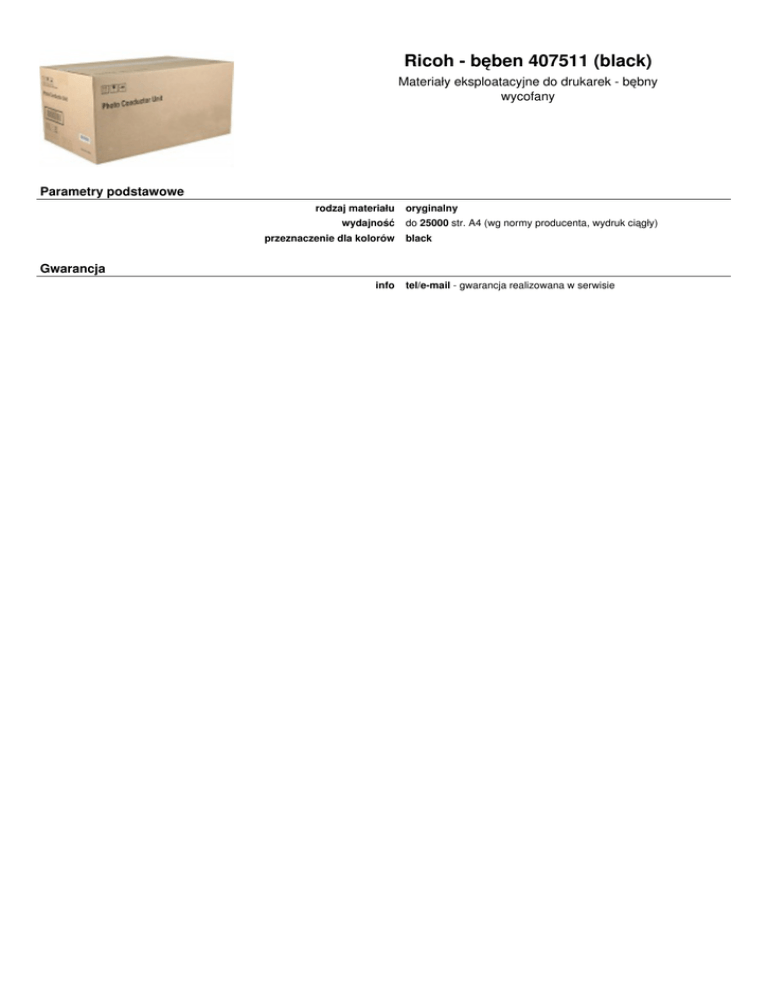 Ricoh - bęben 407511 (black) Materiały eksploatacyjne do drukarek - bębny wycofany Parametry podstawowe rodzaj materiału wydajność przeznaczenie dla kolorów oryginalny do 25000 str. A4 (wg normy producenta, wydruk ciągły) black Gwarancja info Powered by TCPDF (www.tcpdf.org) tel/e-mail - gwarancja realizowana w serwisie