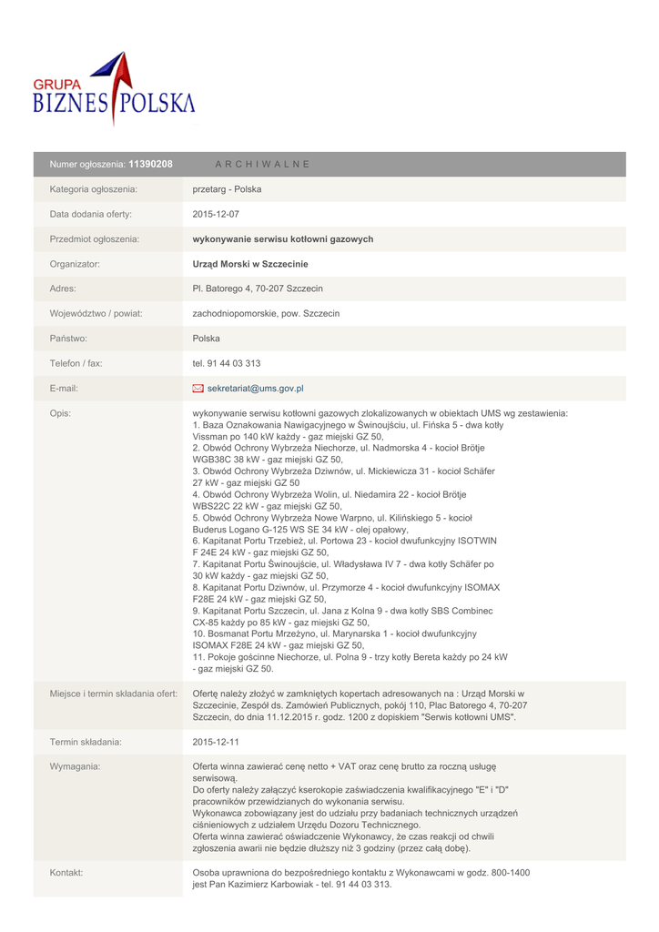 Numer ogłoszenia: 11390208 A RCHI WA L N E Kategoria ogłoszenia: przetarg - Polska Data dodania oferty: 2015-12-07 Przedmiot ogłoszenia: wykonywanie serwisu kotłowni gazowych Organizator: Urząd Morski w Szczecinie Adres: Pl. Batorego 4, 70-207 Szczecin Województwo / powiat: zachodniopomorskie, pow. Szczecin Państwo: Polska Telefon / fax: tel. 91 44 03 313 E-mail: [email protected] Opis: wykonywanie serwisu kotłowni gazowych zlokalizowanych w obiektach UMS wg zestawienia: 1. Baza Oznakowania Nawigacyjnego w Świnoujściu, ul. Fińska 5 - dwa kotły Vissman po 140 kW każdy - gaz miejski GZ 50, 2. Obwód Ochrony Wybrzeża Niechorze, ul. Nadmorska 4 - kocioł Brötje WGB38C 38 kW - gaz miejski GZ 50, 3. Obwód Ochrony Wybrzeża Dziwnów, ul. Mickiewicza 31 - kocioł Schäfer 27 kW - gaz miejski GZ 50 4. Obwód Ochrony Wybrzeża Wolin, ul. Niedamira 22 - kocioł Brötje WBS22C 22 kW - gaz miejski GZ 50, 5. Obwód Ochrony Wybrzeża Nowe Warpno, ul. Kilińskiego 5 - kocioł Buderus Logano G-125 WS SE 34 kW - olej opałowy, 6. Kapitanat Portu Trzebież, ul. Portowa 23 - kocioł dwufunkcyjny ISOTWIN F 24E 24 kW - gaz miejski GZ 50, 7. Kapitanat Portu Świnoujście, ul. Władysława IV 7 - dwa kotły Schäfer po 30 kW każdy - gaz miejski GZ 50, 8. Kapitanat Portu Dziwnów, ul. Przymorze 4 - kocioł dwufunkcyjny ISOMAX F28E 24 kW - gaz miejski GZ 50, 9. Kapitanat Portu Szczecin, ul. Jana z Kolna 9 - dwa kotły SBS Combinec CX-85 każdy po 85 kW - gaz miejski GZ 50, 10. Bosmanat Portu Mrzeżyno, ul. Marynarska 1 - kocioł dwufunkcyjny ISOMAX F28E 24 kW - gaz miejski GZ 50, 11. Pokoje gościnne Niechorze, ul. Polna 9 - trzy kotły Bereta każdy po 24 kW - gaz miejski GZ 50. Miejsce i termin składania ofert: Ofertę należy złożyć w zamkniętych kopertach adresowanych na : Urząd Morski w Szczecinie, Zespół ds. Zamówień Publicznych, pokój 110, Plac Batorego 4, 70-207 Szczecin, do dnia 11.12.2015 r. godz. 1200 z dopiskiem "Serwis kotłowni UMS". Termin składania: 2015-12-11 Wymagania: Oferta winna zawierać cenę netto + VAT oraz cenę brutto za roczną usługę serwisową. Do oferty należy załączyć kserokopie zaświadczenia kwalifikacyjnego "E" i "D" pracowników przewidzianych do wykonania serwisu. Wykonawca zobowiązany jest do udziału przy badaniach technicznych urządzeń ciśnieniowych z udziałem Urzędu Dozoru Technicznego. Oferta winna zawierać oświadczenie Wykonawcy, że czas reakcji od chwili zgłoszenia awarii nie będzie dłuższy niż 3 godziny (przez całą dobę). Kontakt: Osoba uprawniona do bezpośredniego kontaktu z Wykonawcami w godz. 800-1400 jest Pan Kazimierz Karbowiak - tel. 91 44 03 313. Numer dokumentu: P-II-379/ZZP-2/222/15 Źródło: Internet i własne Załączniki: ZIP załącznik