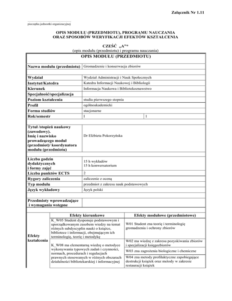 Załącznik Nr 1 - Katedra Informacji Naukowej i Bibliologii
