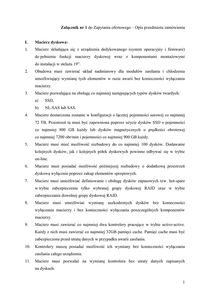 Załącznik nr 1 do Zapytania ofertowego – Opis przedmiotu zamówienia I. Macierz dyskowa: 1. Macierz składająca się z urządzenia dedykowanego (system operacyjny i firmware) do pełnienia funkcji macierzy dyskowej wraz z komponentami montażowymi do instalacji w stelażu 19”. 2. Obudowa musi zawierać układ nadmiarowy dla modułów zasilania i chłodzenia umożliwiający wymianę tych elementów w razie awarii bez konieczności wyłączania macierzy. 3. 4. Macierz pozwalająca na obsługę co najmniej następujących typów dysków twardych: a) SSD, b) NL-SAS lub SAS. Macierz dostarczona zostanie w konfiguracji o łącznej pojemności surowej co najmniej 72 TB. Przestrzeń ta musi być zapewniona poprzez użycie dysków SSD o pojemności co najmniej 800 GB każdy lub dysków magnetycznych o prędkości obrotowej co najmniej 7200 obr/min i pojemności co najmniej 900 GB każdy. 5. Macierz musi mieć możliwość rozbudowy do co najmniej 100 dysków. Dodawanie kolejnych dysków, jak i kolejnych półek dyskowych powinno odbywać się w trybie on-line. 6. Macierz musi posiadać możliwość późniejszej rozbudowy o dodatkową przestrzeń dyskową wyłącznie poprzez zakup elementów sprzętowych. 7. Macierz musi umożliwiać definiowanie i obsługę dysków zapasowych tzw. hot-spare w trybie zabezpieczenia tylko wybranej grupy dyskowej RAID oraz w trybie zabezpieczania dowolnej grupy dyskowej RAID. 8. Macierz musi umożliwiać wymianę uszkodzonych dysków bez konieczności wyłączania macierzy i bez konieczności wyłączania poszczególnych komponentów macierzy. 9. Macierz musi zawierać co najmniej dwa kontrolery pracujące w trybie active-active. Każdy z nich musi zawierać co najmniej 32GB pamięci cache. Pamięć cache musi być zabezpieczona przed utratą danych w przypadku awarii zasilania. 10. Kontrolery muszą posiadać możliwość ich wymiany bez konieczności wyłączania zasilania całego urządzenia. 11. Macierz musi pozwalać na wymianę kontrolera bez utraty danych zapisanych na dyskach. 1 12. Macierz powinna umożliwiać równoczesną obsługę wielu poziomów RAID. 13. Macierz musi udostępniać wolumeny zdefiniowane na macierzy protokołem Fibre Channel. Jeśli użycie funkcjonalności wymaga posiadania licencji, licencje te zostaną dostarczone wraz z macierzą. 14. Oferowana macierz musi posiadać dla każdego z kontrolerów co najmniej 2 interfejsy FC wraz z wkładkami SFP+, o prędkości co najmniej 8Gb/s każdy, do przyłączenia macierzy do infrastruktury SAN. 15. Urządzenie musi oferować system RAID zapewniający taki poziom zabezpieczania danych, aby był możliwy do nich dostęp w sytuacji awarii minimum dwóch dysków w grupie RAID. 16. Brak pojedynczych punktów awarii – wymagana jest redundancja wszystkich modułów macierzy. 17. Macierz musi zawierać dedykowane oprogramowanie do zarządzania funkcjami urządzenia oraz do jego konfiguracji. 18. Musi być dostępne pełne zarządzanie przy pomocy CLI z dostępem co najmniej poprzez ssh. 19. Komunikacja z wbudowanym oprogramowaniem zarządzającym macierzą musi być możliwa również w trybie graficznym np. poprzez przeglądarkę WWW. 20. Wbudowane oprogramowanie macierzy musi obsługiwać połączenia z modułem zarządzania macierzy poprzez szyfrowanie komunikacji protokołami: SSL dla komunikacji poprzez przeglądarkę WWW i protokołem SSH dla komunikacji poprzez CLI. 21. Macierz musi obsługiwać mechanizmy failover i nadmiarowości ścieżek logicznych FC pomiędzy macierzą i podłączonymi hostami. Jeśli użycie funkcjonalności wymaga posiadania licencji, licencje te zostaną dostarczone wraz z macierzą. 22. Wymaga się dostarczenia funkcjonalności: replikacji synchronicznej i asynchronicznej, snapshot, clones, thin provisioning, cachowanie na dyskach SSD. Jeśli użycie funkcjonalności wymaga posiadania licencji, licencje te zostaną dostarczone wraz z macierzą. 23. System musi posiadać możliwość automatycznego informowania przez macierz i przesyłania przez pocztę elektroniczną raportów o zdarzeniach krytycznych i awariach macierzy. 2 24. System musi umożliwiać dynamiczną zmianę rozmiaru wolumenów logicznych bez przerywania pracy macierzy i bez przerywania dostępu do danych znajdujących się na danym wolumenie. 25. Dodawanie nowych funkcjonalności, podnoszenie wersji firmware-u i oprogramowania kontrolerów macierzy musi odbywać się on-line, bezprzerwowo, z ciągłym dostępem do danych. 26. Macierz musi posiadać wsparcie co najmniej dla systemów operacyjnych: MS Windows Server 2008/2012, VMWare 5.1 i wyższe. 27. Dostarczone urządzenie musi być produktem fabrycznie nowym dostarczonym przez autoryzowany kanał sprzedaży. II. Usługi: W ramach instalacji i konfiguracji wykonawca: 1. Zainstaluje macierz w szafie RACK. 2. Dokona analizy potrzeb Zamawiającego dotyczących jej konfiguracji. 3. Skonfiguruje macierz zgodnie z wymaganiami Zamawiającego. 4. Połączy macierz z przełącznikami FC posiadanymi przez Zamawiającego. 5. Przeprowadzi nieodpłatny instruktaż stanowiskowy dla co najmniej dwóch pracowników Zamawiającego obejmujący administrację i konfigurację macierzy oraz podłączanie nowych hostów. 6. Dostarczy dokumentację wykonanych prac. 7. Dostarczy dokumentację administratora macierzy. III. Warunki gwarancji: 1. Macierz musi być objęta gwarancją na sprzęt jak i oprogramowanie przez okres co najmniej 1 roku. Gwarancja musi być świadczona w trybie 5x9 z czasem reakcji 4 godziny. Czas reakcji liczony jest od momentu zgłoszenia przez Zamawiającego awarii/usterki. 2. Zgłaszanie awarii dokonywane będzie pisemnie, telefonicznie, faksem lub pocztą elektroniczną w godzinach pracy Zamawiającego. 3. Wykonawca będzie świadczył usługę gwarancji w oparciu o gwarancje producenta. 4. Wykonawca przystąpi do naprawy w miejscu instalacji sprzętu w siedzibie Zamawiającego. 3 5. Jeśli naprawa w siedzibie Zamawiającego nie jest możl