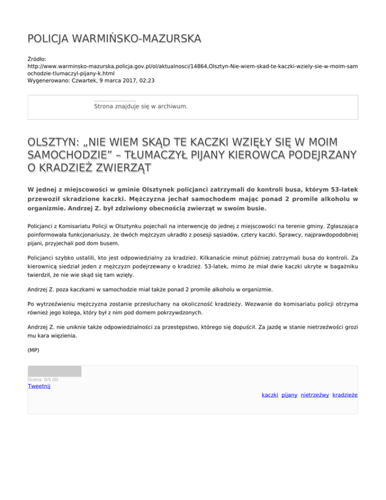 POLICJA WARMIŃSKO-MAZURSKA Źródło: http://www.warminsko-mazurska.policja.gov.pl/ol/aktualnosci/14864,Olsztyn-Nie-wiem-skad-te-kaczki-wziely-sie-w-moim-sam ochodzie-tlumaczyl-pijany-k.html Wygenerowano: Czwartek, 9 marca 2017, 02:23 Strona znajduje się w archiwum. OLSZTYN: „NIE WIEM SKĄD TE KACZKI WZIĘŁY SIĘ W MOIM SAMOCHODZIE” – TŁUMACZYŁ PIJANY KIEROWCA PODEJRZANY O KRADZIEŻ ZWIERZĄT W jednej z miejscowości w gminie Olsztynek policjanci zatrzymali do kontroli busa, którym 53-latek przewoził skradzione kaczki. Mężczyzna jechał samochodem mając ponad 2 promile alkoholu w organizmie. Andrzej Z. był zdziwiony obecnością zwierząt w swoim busie. Policjanci z Komisariatu Policji w Olsztynku pojechali na interwencję do jednej z miejscowości na terenie gminy. Zgłaszająca poinformowała funkcjonariuszy, że dwóch mężczyzn ukradło z posesji sąsiadów, cztery kaczki. Sprawcy, najprawdopodobniej pijani, przyjechali pod dom busem. Policjanci szybko ustalili, kto jest odpowiedzialny za kradzież. Kilkanaście minut później zatrzymali busa do kontroli. Za kierownicą siedział jeden z mężczyzn podejrzewany o kradzież. 53-latek, mimo że miał dwie kaczki ukryte w bagażniku twierdził, że nie wie skąd się tam wzięły. Andrzej Z. poza kaczkami w samochodzie miał także ponad 2 promile alkoholu w organizmie. Po wytrzeźwieniu mężczyzna zostanie przesłuchany na okoliczność kradzieży. Wezwanie do komisariatu policji otrzyma również jego kolega, który był z nim pod domem pokrzywdzonych. Andrzej Z. nie uniknie także odpowiedzialności za przestępstwo, którego się dopuścił. Za jazdę w stanie nietrzeźwości grozi mu kara więzienia. (MP) Ocena: 0/5 (0) Tweetnij kaczki, pijany, nietrzeźwy, kradzieże