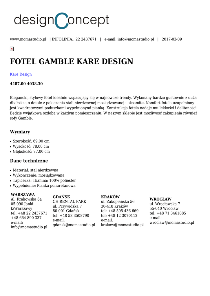 www.momastudio.pl | INFOLINIA.: 22 2437671 | e-mail: [email protected] | 2017-03-09 FOTEL GAMBLE KARE DESIGN Kare Design 4487.00 4038.30 Elegancki, stylowy fotel idealnie wspasujący się w najnowcze trendy. Wykonany bardzo gustownie z duża dbałością o detale z połączenia stali nierdzewnej mosiądzowanej i aksamitu. Komfort fotela uzupełniony jest kwadratowymi poduszkami wypełnionymi pianką. Konstrukcja fotela nadaje mu lekkości i delitaności. Będzie wyjątkową ozdobą w każdym pomieszczeniu. W naszym sklepie jest możliwosć zakupienia również sofy Gamble. Wymiary ● ● ● Szerokość: 69.00 cm Wysokość: 78.00 cm Głębokość: 77.00 cm Dane techniczne ● ● ● ● Materiał: stal nierdzewna Wykończenie: mosiądzowana Tapicerka: Tkanina: 100% poliester Wypełnienie: Pianka poliuretanowa WARSZAWA Al. Krakowska 6a 05-090 Janki k/Warszawy tel: +48 22 2437671 +48 664 890 337 e-mail: [email protected] GDAŃSK CH RENTAL PARK ul. Przywidzka 7 80-001 Gdańsk tel: +48 58 3508790 e-mail: [email protected] KRAKÓW ul. Zakopiańska 56 30-418 Kraków tel: +48 505 436 669 tel: +48 12 3070112 e-mail: [email protected] WROCŁAW ul. Wrocławska 7 55-040 Wrocław tel: +48 71 3461885 e-mail: [email protected]