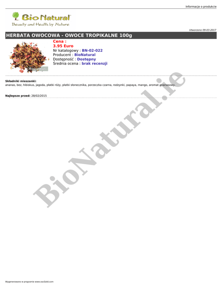 Informacje o produkcie Utworzono 09-03-2017 HERBATA OWOCOWA - OWOCE TROPIKALNE 100g Cena : 3.95 Euro .ie Nr katalogowy : BN-02-022 Producent : BioNatural Dostępność : Dostępny Średnia ocena : brak recenzji Składniki mieszanki: ananas, bez, hibiskus, jagoda, płatki róży, płatki słonecznika, porzeczka czarna, rodzynki, papaya, mango, aromat ananasowy. B io N at ur al Najlepsze przed: 28/02/2015 Wygenerowano w programie www.oscGold.com
