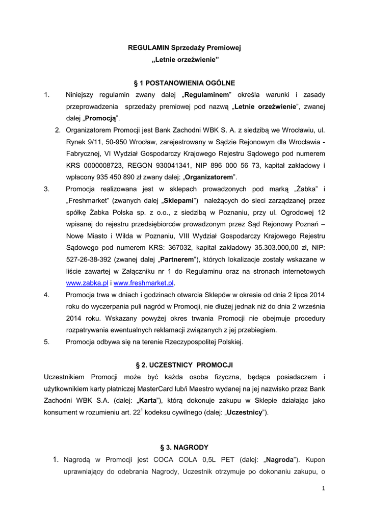 REGULAMIN Sprzedaży Premiowej „Letnie orzeźwienie” § 1 POSTANOWIENIA OGÓLNE 1. Niniejszy regulamin zwany dalej „Regulaminem” określa warunki i zasady przeprowadzenia sprzedaży premiowej pod nazwą „Letnie orzeźwienie”, zwanej dalej „Promocją”. 2. Organizatorem Promocji jest Bank Zachodni WBK S. A. z siedzibą we Wrocławiu, ul. Rynek 9/11, 50-950 Wrocław, zarejestrowany w Sądzie Rejonowym dla Wrocławia Fabrycznej, VI Wydział Gospodarczy Krajowego Rejestru Sądowego pod numerem KRS 0000008723, REGON 930041341, NIP 896 000 56 73, kapitał zakładowy i wpłacony 935 450 890 zł zwany dalej: „Organizatorem”. 3. Promocja realizowana jest w sklepach prowadzonych pod marką „Żabka” i „Freshmarket” (zwanych dalej „Sklepami”) należących do sieci zarządzanej przez spółkę Żabka Polska sp. z o.o., z siedzibą w Poznaniu, przy ul. Ogrodowej 12 wpisanej do rejestru przedsiębiorców prowadzonym przez Sąd Rejonowy Poznań – Nowe Miasto i Wilda w Poznaniu, VIII Wydział Gospodarczy Krajowego Rejestru Sądowego pod numerem KRS: 367032, kapitał zakładowy 35.303.000,00 zł, NIP: 527-26-38-392 (zwanej dalej „Partnerem”), których lokalizacje zostały wskazane w liście zawartej w Załączniku nr 1 do Regulaminu oraz na stronach internetowych www.zabka.pl i www.freshmarket.pl. 4. Promocja trwa w dniach i godzinach otwarcia Sklepów w okresie od dnia 2 lipca 2014 roku do wyczerpania puli nagród w Promocji, nie dłużej jednak niż do dnia 2 września 2014 roku. Wskazany powyżej okres trwania Promocji nie obejmuje procedury rozpatrywania ewentualnych reklamacji związanych z jej przebiegiem. 5. Promocja odbywa się na terenie Rzeczypospolitej Polskiej. § 2. UCZESTNICY PROMOCJI Uczestnikiem Promocji może być każda osoba fizyczna, będąca posiadaczem i użytkownikiem karty płatniczej MasterCard lub/i Maestro wydanej na jej nazwisko przez Bank Zachodni WBK S.A. (dalej: „Karta”), którą dokonuje zakupu w Sklepie działając jako konsument w rozumieniu art. 221 kodeksu cywilnego (dalej: „Uczestnicy”). § 3. NAGRODY 1. Nagrodą w Promocji jest COCA COLA 0,5L PET (dalej: „Nagroda”). Kupon uprawniający do odebrania Nagrody, Uczestnik otrzymuje po dokonaniu zakupu, o 1 którym mowa w § 4 ust. 1 Regulaminu. Wartość jednej Nagrody 3,49 złotych brutto. Z uwagi, iż wartość nagrody nie przekracza kwoty 760,00 zł, otrzymanie jej nie powoduje powstania obowiązku podatkowego, zgodnie z art. 21 ust. 1 pkt. 68 ustawy z dnia 26 lipca 1991 r. o podatku dochodowym od osób fizycznych (t.j. Dz. U. 2012 r. poz. 361 ze zm.). 2. W Promocji zostanie przyznanych łącznie 24.068 (słownie: dwadzieścia cztery tysiące sześćdziesiąt osiem) Nagród, przy czym konkretne pule Nagród w poszczególnych Sklepach mogą się różnić. 3. Organizator zastrzega sobie prawo do zwiększenia Puli Nagród. 4. Nagrody są wydawane w Promocji według kolejności spełniania przez Uczestników warunków wskazanych w § 4 ust. 1 Regulaminu w danym Sklepie, do wyczerpania się puli Nagród w tym Sklepie lub zakończenia okresu trwania Promocji. 5. Nagroda może być odebrana po otrzymaniu przez Uczestnika kuponu, o którym mowa w ust. 1. 6. Za każdy zakup spełniający warunki Promocji opisane w § 4 ust. 1 Regulaminu przysługuje jedna Nagroda. 7. Nagroda nie podlega wymianie ani na inną Nagrodę ani na ekwiwalent pieniężny. § 4. PRZEBIEG PROMOCJI 1. Warunkiem wydania Nagrody w Promocji jest: a) dokonanie w czasie trwania Promocji zakupu towarów z oferty danego Sklepu za łączną cenę wynoszącą co najmniej 25,00 (dwadzieścia pięć) złotych brutto b) dokonanie za ten zakup płatności za pomocą Karty przy czym transakcja musi zostać zaakceptowana przez jej wydawcę – Bank Zachodni WBK Spółkę Akcyjną. 2. Nagroda zostanie wydana Uczestnikowi przy kasie przez pracownika Sklepu, po dokonaniu zapłaty spełniającej warunki Regulaminu i przekazaniu Kasjerowi kuponu, o którym mowa w § 3 ust. 1. 3. Uczestnik może wziąć udział w Promocji wielokrotnie, pod warunkiem każdorazowego spełnienia warunków opisanych w Regulaminie. 4. W przypadku dokonania jednorazowo zakupu towarów z oferty danego Sklepu za łączną cenę stanowiącą wielokrotność 25,00 (dwadzieścia pięć) złotych brutto, Uczestnikowi zostanie wydana jedna Nagroda. 5. Promocją nie są objęte płatności Kartą za usługi „Drobne rachunki w „Żabce”, usługi „Lotto” dostępne w ramach oferty Sklepów, oraz usługi nadawania i odbioru przesyłek kurierskich. 2 § 5. POSTĘPOWANIE REKLAMACYJNE 1. Wszelkie reklamacje dotyczące Promocji mogą być składane ustnie w siedzibie Banku, dowolnej jednostce organizacyjnej Banku zajmującej się obsługą klienta, pisemnie na adres Banku lub jego dowolnej jednostki organizacyjnej zajmującej się obsługą klienta, telefonicznie lub w formie elektronicznej. Odpowiednie adresy, w tym poczty elektronicznej, oraz numery telefonów dostępne są w jednostkach organizacyjnych Banku zajmujących się obsługa klienta oraz wskazane na stronie internetowej Banku www.bzwbk.pl. 2. Reklamacje powinny zawierać imię i nazwisko oraz dokładny adres Klienta, jak również opis i wskazanie przyczyny reklamacji, a także kopię paragonu fiskalnego lub kopię potwierdzenia dokonania transakcji w Sklepie przy wykorzystaniu Karty. 3. Odpowiedź na reklamację, w zależności od charakteru sprawy, zostanie udzielona przez Bank pisemnie, telefonicznie, ustnie lub w formie elektronicznej, bez zbędnej zwłoki, jednak nie później niż w terminie 30 dni od daty otrzymania reklamacji. W uzasadnionych przypadkach termin udzielenia odpowiedzi może zostać wydłużony maksymalnie do 90 dni, po uprzednim wyjaśnieniu Uczestnikowi przyczyn opóźnienia i wskazania okoliczności wymagających dodatkowego ustalenia. § 6. POSTANOWIENIA KOŃCOWE 1. Administratorem danych osobowych zgłaszających reklamacje jest Bank Zachodni WBK S. A. z siedzibą we 