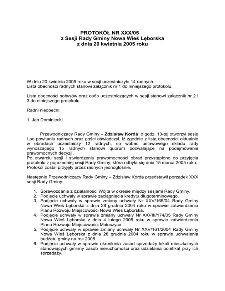 PROTOKÓŁ NR XXX/05 z Sesji Rady Gminy Nowa Wieś Lęborska z dnia 20 kwietnia 2005 roku W dniu 20 kwietnia 2005 roku w sesji uczestniczyło 14 radnych. Lista obecności radnych stanowi załącznik nr 1 do niniejszego protokołu. Lista obecności sołtysów oraz osób uczestniczących w sesji stanowi załącznik nr 2 i 3 do niniejszego protokołu. Radni nieobecni: 1. Jan Dominiecki Przewodniczący Rady Gminy – Zdzisław Korda o godz. 13-tej otworzył sesję i po powitaniu radnych oraz gości oświadczył, iż zgodnie z listą obecności aktualnie w obradach uczestniczy 12 radnych, co wobec ustawowego składu rady wynoszącego 15 radnych stanowi quorum pozwalające na podejmowanie prawomocnych decyzji. Po otwarciu sesji i stwierdzeniu prawomocności obrad przystąpiono do przyjęcia protokołu z poprzedniej sesji Rady Gminy, która odbyła się dnia 15 marca 2005 roku. Protokół został przyjęty przez radnych jednogłośnie. Następnie Przewodniczący Rady Gminy – Zdzisław Korda przedstawił porządek XXX sesji Rady Gminy: 1. Sprawozdanie z działalności Wójta w okresie między sesjami Rady Gminy. 2. Podjęcie uchwały w sprawie zaciągnięcia kredytu długoterminowego. 3. Podjęcie uchwały w sprawie zmiany uchwały Nr XXV/165/04 Rady Gminy Nowa Wieś Lęborska z dnia 28 grudnia 2004 roku w sprawie zatwierdzenia Planu Rozwoju Miejscowości Nowa Wieś Lęborska. 4. Podjęcie uchwały w sprawie zmiany uchwały Nr XXVIII/174/05 Rady Gminy Nowa Wieś Lęborska z dnia 4 lutego 2005 roku w sprawie zatwierdzenia Planu Rozwoju Miejscowości Małoszyce. 5. Podjęcie uchwały w sprawie zmiany uchwały Nr XXV/161/2004 Rady Gminy Nowa Wieś Lęborska z dnia 28 grudnia 2004 roku w sprawie uchwalenia budżetu gminy na rok 2005. 6. Podjęcie uchwały w sprawie określenia zasad sprzedaży lokali mieszkalnych stanowiących gminny zasób nieruchomości oraz udzielania bonifikat przy ich sprzedaży. 7. Podjęcie uchwały w sprawie sprzedaży w drodze przetargu ustnego nieograniczonego nieruchomości nie zabudowanej oznaczonej numerem 410 o powierzchni 0,92 ha, położonej w obrębie ewidencyjnym Łebień. 8. Podjęcie uchwały w sprawie wyrażenia zgody na dokonanie darowizny nieruchomości stanowiącej własność Gminy Nowa Wieś Lęborska na rzecz Parafii Rzymsko – Katolickiej pw. Niepokalanego Poczęcia Najświętszej Maryi Panny w Nowej Wsi Lęborskiej. 9. Podjęcie uchwały w sprawie uchylenia uchwały Nr XXII/141/2004 Rady Gminy Nowa Wieś Lęborska z dnia 29 września 2004 roku w sprawie zmiany Uchwały Nr XV/99/2004 Rady Gminy Nowa Wieś Lęborska w sprawie sprzedaży w drodze przetargu ustnego nieograniczonego nieruchomości nie zabudowanej oznaczonej numerem 475/113 o pow. 0,8806 ha, położonej w obrębie ewidencyjnym Nowa Wieś Lęborska z jednoczesnym ustanowieniem służebności przejazdu i przechodu na rzecz działek sąsiednich oznaczonych numerami : 475/33, 475/38, 475/36 zapisanych w Księdze Wieczystej Nr 17219 oraz działki nr 475/110 zapisanej w Księdze Wieczystej nr 22254 do czasu wydzielenia drogi z działki nr 475/113. 10. Podjęcie uchwały w sprawie nieodpłatnego przejęcia z zasobu Agencji Nieruchomości Rolnych nieruchomości nie zabudowanej oznaczonej numerem 84/5 o powierzchni 0,28 ha, położonej w obrębie ewidencyjnym Redkowice. 11. Podjęcie uchwały w sprawie przystąpienia do sporządzenia zmiany studium uwarunkowań i kierunków zagospodarowania przestrzennego gminy Nowa Wieś Lęborska dla planowanej zabudowy mieszkalno-usługowej i rekreacyjnej na terenie położonym w obrębie geodezyjnym Nowa Wieś Lęborska. 12. Podjęcie uchwały w sprawie sporządzenia miejscowego planu zagospodarowania przestrzennego dla terenu zabudowy mieszkalnousługowej i rekreacyjnej położonego w obrębie geodezyjnym Nowa Wieś Lęborska gmina Nowa Wieś Lęborska. 13. Podjęcie uchwały w sprawie zmiany uchwały Nr XXIX/183/05 Rady Gminy Nowa Wieś Lęborska z dnia 15 marca 2005 roku w sprawie regulaminu udzielania pomocy materialnej o charakterze socjalnym. 14. Wnioski i zapytania. 15. Sprawy bieżące. 16. Zakończenie obrad. Po przedstawieniu porządku obrad przewodniczący Rady Gminy – Zdzisław Korda zwrócił się do radnych, czy mają pytania i uwagi do przedstawionego porządku obrad. Rada Gminy porządek obrad przyjęła jednogłośnie, po czy przystąpiono do jego realizacji. Ad.1 Sprawozdanie z działalności Wójta w okresie między Sesjami Rady Gminy radni otrzymali wraz z zaproszeniem, celem zapoznania się i wniesienia ewentualnych uwag. Sprawozdanie to stanowi załącznik nr 4 do niniejszego protokołu. Ponieważ nie było pytań do sprawozdania, przystąpiono do realizacji następnego punktu porządku obrad. Ad. 2 Przewodniczący rady gminy – Zdzisław Korda przedstawił radnym projekt uchwały w sprawie zaciągnięcia kredytu długoterminowego. Wyjaśnień w tej sprawie udzieliła Skarbnik Gminy – Dorota Wańkowicz. Poinformowała, że ustala się kwotę kredytu długoterminowego na 2.900.000 zł. Jest to kwota którą zapisaliśmy w ustawie budżetowej. Spłata kredytu następować będzie przez okres 5-ciu lat, w ratach kwartalnych, z dochodów własnych gminy zaplanowanych w budżecie gminy na dany rok, licząc od 2006 roku. Kredyt ten zostanie przeznaczony na sfinansowanie wydatków inwestycyjnych. Pani Skarbnik ma nadzieję, że w takiej wysokości nie wykorzystamy kredytu, jednakże uchwała jest formą zabezpieczenia wysokości zapisanej w uchwale. Radna Bożena Gasperowicz zapytała, czy są to wydatki które w planie inwestycyjnym zapisane są na ten rok. Pani Skarbnik odpowiedziała, że dotyczy to wydatków inwestycyjnych, ale nie tylko ujętych w WPI. Ponieważ w WPI ujęte są tylko inwestycje wieloletnie. Wójt dodał, że jeżeli skorzystamy z tych pieniędzy to na budowę wodociągów i dróg w Mostach. Rada gminy po zapoznaniu się z projektem uchwały, wyjaśnieniami Skarbnika Gminy oraz pozytywną opinią komisji rozwoju gospodar