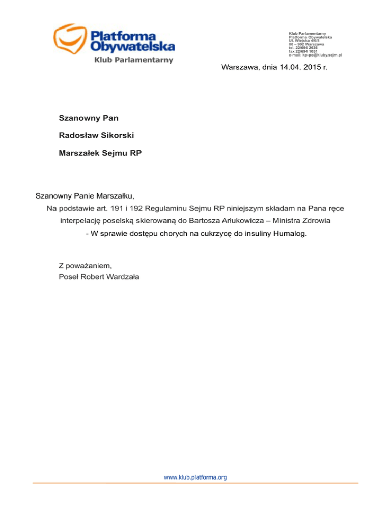 ! Klub Parlamentarny Klub Parlamentarny Platforma Obywatelska Ul. Wiejska 4/6/8 00 – 902 Warszawa tel. 22/694 2636 fax 22/694 1051 e-mail: [email protected] Warszawa, dnia 14.04. 2015 r. Szanowny Pan Radosław Sikorski Marszałek Sejmu RP Szanowny Panie Marszałku, Na podstawie art. 191 i 192 Regulaminu Sejmu RP niniejszym składam na Pana ręce interpelację poselską skierowaną do Bartosza Arłukowicza – Ministra Zdrowia - W sprawie dostępu chorych na cukrzycę do insuliny Humalog. Z poważaniem, Poseł Robert Wardzała www.klub.platforma.org Klub Parlamentarny Platforma Obywatelska Ul. Wiejska 4/6/8 00 – 902 Warszawa tel. 22/694 2636 fax 22/694 1051 e-mail: [email protected] ! Klub Parlamentarny Poseł Robert Wardzała Warszawa, dnia 14.04.2015r. Klub Parlamentarny Platforma Obywatelska Szanowny Pan Bartosz Arłukowicz Minister Zdrowia Interpelacja W sprawie dostępu chorych na cukrzycę do insuliny Humalog. Szanowny Panie Ministrze. W związku z doniesieniami medialnymi o braku dostępności leku na cukrzycę insuliny Humalog, zwracam się do Pana Ministra z prośbą o interwencję i pilne wyjaśnienie sprawy. Zdaniem publikatorów, występują olbrzymie trudności z zakupem tego ratującego życie chorym medykamentu. "W aptekach notorycznie brakuje insuliny Humalog" - alarmuje Gazeta Krakowska w tekście z dnia 13 kwietnia br. Media podają ponadto informację, zgodnie z którą, potrzebny w kraju lek sprzedawany jest z zyskiem za granicę, a wielu chorych bezskutecznie próbuje nabyć medykamenty w rodzimych aptekach. Dodajmy, że są one niezbędne do ratowania życia - bez insuliny chorzy nie przeżyliby nawet jednej doby. W związku z powyższym, proszę o pilną reakcję Ministerstwa w tej sprawie i udzielenie odpowiedzi na poniższe pytania: 1. Co należy zrobić, aby zmienić sytuację i lek, o którym mowa, był dostępny dla wszystkich potrzebujących? 2. Czy po nowelizacji prawa farmaceutycznego, zgodnie z którym hurtownie farmaceutyczne będą musiały zgłaszać do Naczelnej Izby Aptekarskiej zamiar wywozu leków za granicę, problem rzeczywiście zniknie? www.klub.platforma.org