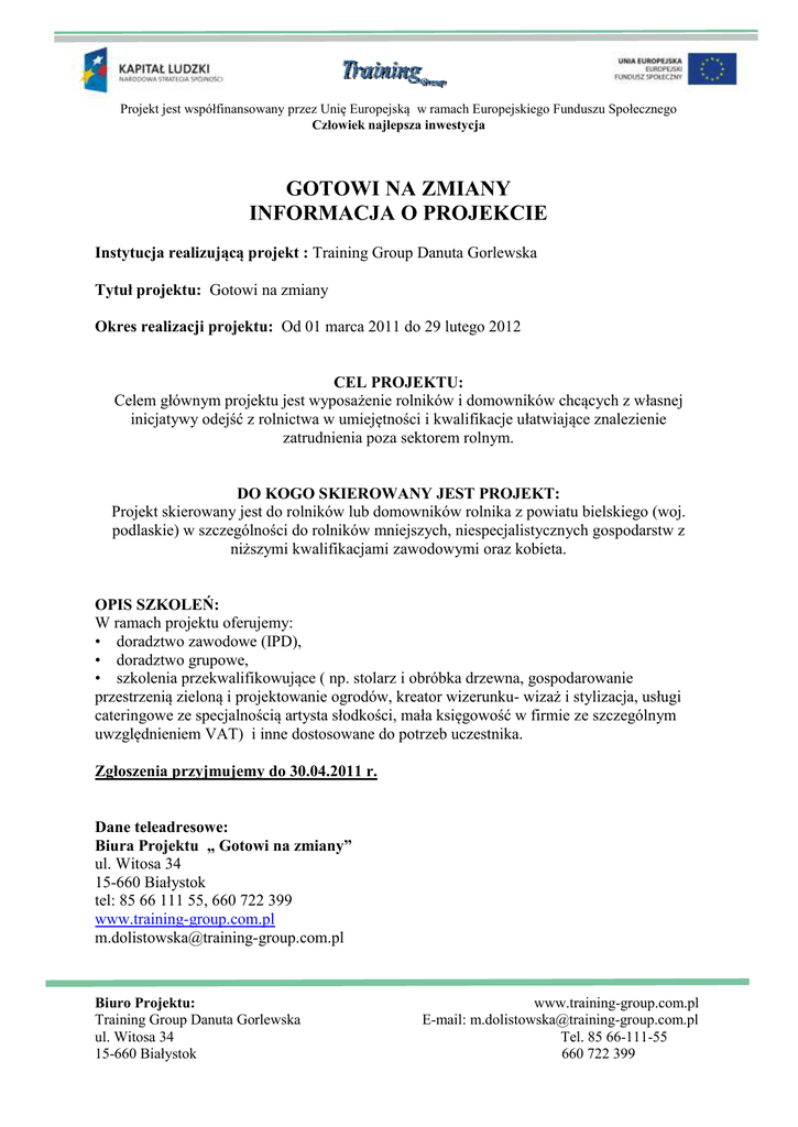 Projekt jest współfinansowany przez Unię Europejską w ramach Europejskiego Funduszu Społecznego Człowiek najlepsza inwestycja GOTOWI NA ZMIANY INFORMACJA O PROJEKCIE Instytucja realizującą projekt : Training Group Danuta Gorlewska Tytuł projektu: Gotowi na zmiany Okres realizacji projektu: Od 01 marca 2011 do 29 lutego 2012 CEL PROJEKTU: Celem głównym projektu jest wyposażenie rolników i domowników chcących z własnej inicjatywy odejść z rolnictwa w umiejętności i kwalifikacje ułatwiające znalezienie zatrudnienia poza sektorem rolnym. DO KOGO SKIEROWANY JEST PROJEKT: Projekt skierowany jest do rolników lub domowników rolnika z powiatu bielskiego (woj. podlaskie) w szczególności do rolników mniejszych, niespecjalistycznych gospodarstw z niższymi kwalifikacjami zawodowymi oraz kobieta. OPIS SZKOLEŃ: W ramach projektu oferujemy: • doradztwo zawodowe (IPD), • doradztwo grupowe, • szkolenia przekwalifikowujące ( np. stolarz i obróbka drzewna, gospodarowanie przestrzenią zieloną i projektowanie ogrodów, kreator wizerunku- wizaż i stylizacja, usługi cateringowe ze specjalnością artysta słodkości, mała księgowość w firmie ze szczególnym uwzględnieniem VAT) i inne dostosowane do potrzeb uczestnika. Zgłoszenia przyjmujemy do 30.04.2011 r. Dane teleadresowe: Biura Projektu „ Gotowi na zmiany” ul. Witosa 34 15-660 Białystok tel: 85 66 111 55, 660 722 399 www.training-group.com.pl [email protected] Biuro Projektu: Training Group Danuta Gorlewska ul. Witosa 34 15-660 Białystok www.training-group.com.pl E-mail: [email protected] Tel. 85 66-111-55 660 722 399