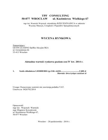 TPF CONSULTING 50-077 WROCŁAW ul. Kazimierza Wielkiego 67 mgr inż. Warnicki Wojciech niezależny RZECZOZNAWCA w zakresie Wyceny Maszyn, Urządzeń i Pojazdów Specjalistycznych WYCENA RYNKOWA Zamawiający: GETIN LEASING Spółka Akcyjna SKA ul. Gwiaździsta 66 53-413 Wrocław Aktualna wartość rynkowa poziom cen IV kw. 2014 r. 1. Szafa chłodnicza LIEBHERR typ GKv-6410..................................2 600 zł Słownie: dwa tysiące sześćset zł Uwaga: Oszacowane wartości nie zawierają podatku VAT. Umowa nr 0426792/2014 Opracowali: mgr inż. Wojciech Warnicki mgr Zbigniew Kowalewski ul. Kazimierza Wielkiego 67, 50-077 Wrocław Wrocław – 20 października - 2014 r. 3.0. PRZEDMIOT WYCENY. 3.1. Szafa chłodnicza LIEBHERR typ GKv-6410 Brak dokumentacji, deklaracji zgodności 3.1.1. Charakterystyka techniczna - Producent - Typ - Numer serii - Rok produkcji - Zasilanie - Czynnik / ilość - Pojemność - Sprężarka Embraco - Masa - Wymiary zewnętrzne - długość - wysokość - szerokość - LIEBHERR - GKv-6410 - 82.456.884.7 - brak - 230 V - R600a/ 70 g - 663 l - EMT45CDP - 98 kg - 740 mm - 740 mm - 2 050 mm 3.1.2. Przeznaczenie i opis. Szafa chłodnicza LIEBHERR typ GKv-6410 służyła do przechowywania produktów spożywczych w niskiej temperaturze. Za producentem: materiał obudowy: stal. Kolor obudowy: biały. Materiał drzwi: stal. Materiał wnętrza: tworzywo sztuczne w kolorze białym. Rodzaj sterowania: sterowanie elektroniczne. Wskaźnik temperatury: zewnętrzny cyfrowy. Awaria - sygnał ostrzegania: optyczny i dźwiękowy. Regulowane półki: 6. Materiał półek: ruszty ocynkowane. Maksymalne obciążenie półek: 60 kg. Dostosowana do normy gastronomicznej GN 2/1. Ergonomiczny uchwyt drążkowy. Szafa chłodnicza LIEBHERR typ GKv-6410 złożona w magazynie. Sprawna elektrycznie – sprężarka chłodnicza uruchamia sie, oświetlenie sprawne. Brak możliwości sprawdzenia urządzenia w działaniu i potwierdzenia sprawności chłodzenia, niewielkie ślady eksploatacji, drobne uszkodzenia mechaniczne i zabrudzenia, wymaga przeglądu serwisowego.