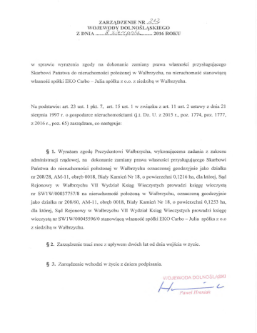 JAA ZARZĄDZENIE N R W OJE W ODY D O LN O ŚLĄ SK IEG O Z D N IA L âJA .ÙZ./?.(?AL . 2016 ROKU w sprawie wyrażenia zgody na dokonanie zam iany praw a własności przysługującego Skarbowi Państw a do nieruchom ości położonej w W ałbrzychu, na nieruchom ość stanowiącą w łasność spółki EKO Carbo - Julia spółka z o.o. z siedzibą w W ałbrzychu. N a podstawie: art. 23 ust. 1 pkt. 7, art. 15 ust. 1 w zw iązku z art. 11 ust. 2 ustawy z dnia 21 sierpnia 1997 r. o gospodarce nieruchom ościam i (j.t. Dz. U. z 2015 r., poz. 1774, poz. 1777, z 2016 r., poz. 65) zarządzam, co następuje: § 1. W yrażam zgodę Prezydentowi W ałbrzycha, wykonującem u zadania z zakresu adm inistracji rządowej, na dokonanie zam iany praw a w łasności przysługującego Skarbowi Państwa do nieruchom ości położonej w W ałbrzychu oznaczonej geodezyjnie jako działka nr 208/28, A M -11, obręb 0018, Biały K am ień N r 18, o pow ierzchni 0,1216 ha, dla której, Sąd Rejonowy w W ałbrzychu VII W ydział Ksiąg W ieczystych prowadzi księgę wieczystą nr SW 1W /00037757/8 na nieruchom ość położoną w W ałbrzychu, oznaczoną geodezyjnie jako działka nr 208/60, AM -11, obręb 0018, Biały K am ień N r 18, o powierzchni 0,1253 ha, dla której, Sąd Rejonowy w W ałbrzychu VII W ydział Ksiąg W ieczystych prow adzi księgę wieczystą nr SW 1W /00045596/0 stanowiącą własność spółki EKO Carbo - Julia spółka z o.o z siedzibą w W ałbrzychu. § 2. Zarządzenie traci moc z upływem dwóch łat od dnia w ejścia w życie. § 3. Zarządzenie w chodzi w życie z dniem podpisania. WOJEWODA DOLNOŚLĄSKI Paweł Hreniak
