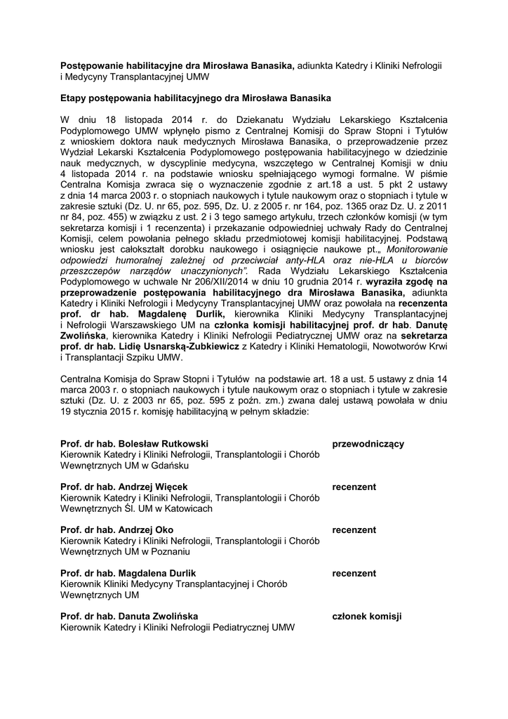 Postępowanie habilitacyjne dra Mirosława Banasika, adiunkta Katedry i Kliniki Nefrologii i Medycyny Transplantacyjnej UMW Etapy postępowania habilitacyjnego dra Mirosława Banasika W dniu 18 listopada 2014 r. do Dziekanatu Wydziału Lekarskiego Kształcenia Podyplomowego UMW wpłynęło pismo z Centralnej Komisji do Spraw Stopni i Tytułów z wnioskiem doktora nauk medycznych Mirosława Banasika, o przeprowadzenie przez Wydział Lekarski Kształcenia Podyplomowego postępowania habilitacyjnego w dziedzinie nauk medycznych, w dyscyplinie medycyna, wszczętego w Centralnej Komisji w dniu 4 listopada 2014 r. na podstawie wniosku spełniającego wymogi formalne. W piśmie Centralna Komisja zwraca się o wyznaczenie zgodnie z art.18 a ust. 5 pkt 2 ustawy z dnia 14 marca 2003 r. o stopniach naukowych i tytule naukowym oraz o stopniach i tytule w zakresie sztuki (Dz. U. nr 65, poz. 595, Dz. U. z 2005 r. nr 164, poz. 1365 oraz Dz. U. z 2011 nr 84, poz. 455) w związku z ust. 2 i 3 tego samego artykułu, trzech członków komisji (w tym sekretarza komisji i 1 recenzenta) i przekazanie odpowiedniej uchwały Rady do Centralnej Komisji, celem powołania pełnego składu przedmiotowej komisji habilitacyjnej. Podstawą wniosku jest całokształt dorobku naukowego i osiągnięcie naukowe pt.„ Monitorowanie odpowiedzi humoralnej zależnej od przeciwciał anty-HLA oraz nie-HLA u biorców przeszczepów narządów unaczynionych”. Rada Wydziału Lekarskiego Kształcenia Podyplomowego w uchwale Nr 206/XII/2014 w dniu 10 grudnia 2014 r. wyraziła zgodę na przeprowadzenie postępowania habilitacyjnego dra Mirosława Banasika, adiunkta Katedry i Kliniki Nefrologii i Medycyny Transplantacyjnej UMW oraz powołała na recenzenta prof. dr hab. Magdalenę Durlik, kierownika Kliniki Medycyny Transplantacyjnej i Nefrologii Warszawskiego UM na członka komisji habilitacyjnej prof. dr hab. Danutę Zwolińska, kierownika Katedry i Kliniki Nefrologii Pediatrycznej UMW oraz na sekretarza prof. dr hab. Lidię Usnarską-Zubkiewicz z Katedry i Kliniki Hematologii, Nowotworów Krwi i Transplantacji Szpiku UMW. Centralna Komisja do Spraw Stopni i Tytułów na podstawie art. 18 a ust. 5 ustawy z dnia 14 marca 2003 r. o stopniach naukowych i tytule naukowym oraz o stopniach i tytule w zakresie sztuki (Dz. U. z 2003 nr 65, poz. 595 z poźn. zm.) zwana dalej ustawą powołała w dniu 19 stycznia 2015 r. komisję habilitacyjną w pełnym składzie: Prof. dr hab. Bolesław Rutkowski Kierownik Katedry i Kliniki Nefrologii, Transplantologii i Chorób Wewnętrznych UM w Gdańsku przewodniczący Prof. dr hab. Andrzej Więcek Kierownik Katedry i Kliniki Nefrologii, Transplantologii i Chorób Wewnętrznych Śl. UM w Katowicach recenzent Prof. dr hab. Andrzej Oko Kierownik Katedry i Kliniki Nefrologii, Transplantologii i Chorób Wewnętrznych UM w Poznaniu recenzent Prof. dr hab. Magdalena Durlik Kierownik Kliniki Medycyny Transplantacyjnej i Chorób Wewnętrznych UM recenzent Prof. dr hab. Danuta Zwolińska Kierownik Katedry i Kliniki Nefrologii Pediatrycznej UMW członek komisji Prof. dr hab. Leszek Domański Katedra i Klinika Nefrologii, Transplantologii i Chorób Wewnętrznych PUM w Szczecinie członek komisji Prof. dr hab. Lidia Usnarska-Zubkiewicz sekretarz Katedra i Klinika Hematologii, Nowotworów Krwi i Transplantacji Szpiku UMW Zgodnie z Ustawą o Stopniach Naukowych i Tytule Naukowym z dnia 14 marca 2003 r. o stopniach naukowych i tytule naukowym oraz o stopniach i tytule w zakresie sztuki (Dz. U. z 2003 r. Nr 65, poz. 595 z póź. zm.) harmonogram przebiegu przewodu habilitacyjnego dra Mirosława Banasika jest następujący: Sporządzenie recenzji dorobku naukowego oraz osiągnięć naukowych będących podstawą wniosku o nadanie stopnia naukowego doktora habilitowanego : do 6 tygodni Sporządzenie przez komisję habilitacyjną wniosku do RW w sprawie nadania stopnia doktora habilitowanego: do 21 dni Podjęcie przez RW uchwały w sprawie nadania lub odmowy stopnia naukowego doktora habilitowanego Uchwała staje się prawomocna z chwilą jej podjęcia. do 1 miesiąca
