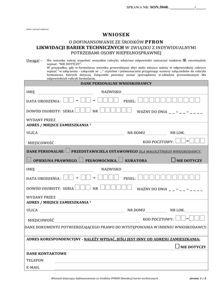 SPRAWA NR: SON.5040. ____________/_____ (data i pieczęć wpływu) WNIOSEK O DOFINANSOWANIE ZE ŚRODKÓW PFRON LIKWIDACJI BARIER TECHNICZNYCH W ZWIĄZKU Z INDYWIDUALNYMI POTRZEBAMI OSOBY NIEPEŁNOSPRAWNEJ Uwaga! – We wniosku należy wypełnić wszystkie rubryki, właściwe odpowiedzi zaznaczyć znakiem , ewentualnie wpisać: "NIE DOTYCZY". W przypadku, gdy w formularzu wniosku przewidziano zbyt mało miejsca należy w odpowiedniej rubryce wpisać "w załączeniu - załącznik nr ...." czytelnie i jednoznacznie przypisując numery załączników do rubryki formularza, których dotyczą. Załączniki powinny zostać sporządzone w układzie przewidzianym dla odpowiednich rubryk formularza. DANE PERSONALNE WNIOSKODAWCY IMIĘ NAZWISKO - - PESEL: DOWÓD OSOBISTY: SERIA NR WAŻNY DO DNIA _ _ – _ _ – _ _ _ _ DATA URODZENIA : WYDANY PRZEZ ADRES / MIEJSCE ZAMIESZKANIA 1 ULICA NR DOMU NR LOK. KOD POCZTOWY: MIEJSCOWOŚĆ - PRZEDSTAWICIELA USTAWOWEGO DLA MAŁOLETNIEGO WNIOSKODAWCY, OPIEKUNA PRAWNEGO, PEŁNOMOCNIKA, KURATORA NIE DOTYCZY DANE PERSONALNE: IMIĘ NAZWISKO - - PESEL: DOWÓD OSOBISTY: SERIA NR WAŻNY DO DNIA _ _ – _ _ – _ _ _ _ DATA URODZENIA : WYDANY PRZEZ ADRES / MIEJSCE ZAMIESZKANIA 1 ULICA NR DOMU MIEJSCOWOŚĆ NR LOK. KOD POCZTOWY: - DANE DOKUMENTU POTWIERDZAJĄCEGO PRAWO DO WYSTĘPOWANIA W IMIENIU WNIOSKODAWCY: ADRES KORESPONDENCYJNY - NALEŻY WPISAĆ, JEŚLI JEST INNY OD ADRESU ZAMIESZKANIA: NIE DOTYCZY DANE KONTAKTOWE TELEFON E-MAIL Wniosek dotyczący dofinansowania ze środków PFRON likwidacji barier technicznych strona: 1 z 5 STAN PRAWNY DOTYCZĄCY NIEPEŁNOSPRAWNOŚCI ZNACZNY CAŁKOWITA NIEZDOLNOŚĆ DO PRACY I DO SAMODZIELNEJ I GRUPA EGZYSTENCJI LUB CAŁKOWITA NIEZDOLNOŚĆ DO SAMODZIELNEJ EGZYSTENCJI UMIARKOWANY CAŁKOWITA NIEZDOLNOŚĆ DO PRACY II GRUPA LEKKI CZĘŚCIOWA NIEZDOLNOŚĆ DO PRACY III GRUPA ORZECZENIE O NIEPEŁNOSPRAWNOŚCI ( DZIECI DO 16 ROKU ŻYCIA ) ORZECZENIE WAŻNE: BEZTERMINOWO, OKRESOWO DO DNIA: _ _ – _ _ – _ _ _ _ RODZAJ NIEPEŁNOSPRAWNOŚCI 01-U UPOŚLEDZENIE UMYSŁOWE 03-L 02-P ZABURZENIA GŁOSU, MOWY I CHOROBY SŁUCHU CHOROBY PSYCHICZNE O5-R 06-E NARZĄD RUCHU EPILEPSJA 04-O NARZĄD WZROKU 07-S 08-T CHOROBY UKŁADU ODDECHOWEGO I KRĄŻENIA CHOROBY UKŁADU POKARMOWEGO 09-M 10-N CHOROBY UKŁADU MOCZOWO - PŁCIOWEGO CHOROBY NEUROLOGICZNE 11-I INNE 12-C CAŁOŚCIOWE ZABURZENIA ROZWOJOWE INNE PRZYCZYNY NIEPEŁNOSPRAWNOŚCI, JAKIE ? NIE TAK: SAMODZIELNIE, PRZY POMOCY OSÓB DRUGICH, OSOBA LEŻĄCA WNIOSKODAWCA PORUSZA SIĘ PRZY POMOCY WÓZKA INWALIDZKIEGO: WNIOSKODAWCA PORUSZA SIĘ PRZY POMOCY: OSÓB DRUGICH, BALKONIKA, LASKI, KUL, INNE, JAKIE ? WNIOSKODAWCA POSIADA DYSFUNKCJĘ: SŁUCHU, MOWY, SŁUCHU I MOWY WNIOSKODAWCA JEST OSOBĄ: NIEDOWIDZĄCĄ, NIEWIDOMĄ, GŁUCHONIEWIDOMĄ NIEPEŁNOSPRAWNOŚĆ WNIOSKODAWCY JEST SPRZĘŻONA U WNIOSKODAWCY WYSTĘPUJE WIĘCEJ NIŻ JEDNA PRZYCZYNA WYDANIA ORZECZENIA O STOPNIU NIEPEŁNOSPRAWNOŚCI. NIEPEŁNOSPRAWNOŚĆ SPRZĘŻONA MUSI BYĆ POTWIERDZONA W POSIADANYM ORZECZENIU O NIEPEŁNOSPRAWNOŚCI. NIE TAK: 2 PRZYCZYNY, 3 PRZYCZYNY WNIOSKODAWCA ZAMIESZKUJE: SAMOTNIE, Z RODZINĄ, Z OSOBAMI NIESPOKREWNIONYMI GOSPODARSTWO DOMOWE WNIOSKODAWCY: SAMODZIELNE (OSOBA SAMOTNA); WSPÓLNE W GOSPODARSTWIE DOMOWYM WNIOSKODAWCY SĄ TAKŻE INNE OSOBY NIEPEŁNOSPRAWNE, POSIADAJĄCE ODPOWIEDNIE ORZECZENIE DOT. NIEPEŁNOSPRAWNOŚCI NIE TAK, ILOŚĆ OSÓB strona: 2 z 5 (NALEŻY DOŁĄCZYĆ KOPIE TYCH ORZECZEŃ) SPRAWA NR: SON.5040. ____________/_____ SYTUACJA ZAWODOWA WNIOSKODAWCY ZATRUDNIONY/A PROWADZĄCY DZIAŁALNOŚĆ GOSPODARCZĄ ZAREJESTROWANY/A W PUP – JAKO: BEZROBOTNY/A, POSZUKUJĄCY/A PRACY NIEZATRUDNIONY/A RENCISTA / EMERYT NIE ZAINTERESOWANY PODJĘCIEM PRACY OSOBA W WIEKU 18 - 24, UCZĄCA SIĘ LUB STUDIUJĄCA DZIECI I MŁODZIEŻ DO LAT 18 INNE (JAKIE?) INFORMACJA O KORZYSTANIU ZE ŚRODKÓW PFRON - ZA OKRES OSTATNICH 5 LAT CZY WNIOSKODAWCA LUB CZŁONEK JEGO GOSPODARSTWA DOMOWEGO KORZYSTAŁ ZE ŚRODKÓW PFRON W CIĄGU OSTATNICH 5 LAT (LICZĄC OD DNIA ZŁOŻENIA WNIOSKU), W TYM POPRZEZ PCPR LUB MOPS? CEL (NAZWA ZADANIA USTAWOWEGO ORAZ /LUB NAZWA PROGRAMU, W RAMACH KTÓREGO PRZYZNANA ZOSTAŁA POMOC) NR ZAWARCIA UMOWY (O ILE DOTYCZY) TAK NIE STAN ROZLICZENIA DATA - W TRAKCIE REALIZACJI PRZYZNANIA - W TRAKCIE ROZLICZENIA, DOFINANS. - ROZLICZONA, KWOTA ROZLICZONA - NIEROZLICZONA RAZEM: CZY WNIOSKODAWCA w CIĄGU TRZECH LAT PRZED ZŁOŻENIEM WNIOSKU BYŁ STRONĄ UMOWY ZAWARTEJ Z PFRON I ROZWIĄZANEJ Z PRZYCZYN LEŻĄCYCH TAK NIE PO JEGO STRONIE ? JEŚLI TAK TO NALEŻY PODAĆ NR I DATĘ ZAWARTEJ UMOWY A TAKŻE PRZYCZYNĘ JEJ ROZWIĄZANIA: TAK NIE CZY WNIOSKODAWCA POSIADA WYMAGALNE ZOBOWIĄZANIA WOBEC MOPS ?: TAK NIE CZY WNIOSKODAWCA POSIADA WYMAGALNE ZOBOWIĄZANIA WOBEC PFRON ?: JEŻELI ZAZNACZONO TAK, PROSZĘ ZOBOWIĄZANIA: PODAĆ RODZAJ I WYSOKOŚĆ (W ZŁ) WYMAGALNEGO UWAGA! ZA „WYMAGALNE ZOBOWIĄZANIE” NALEŻY ROZUMIEĆ ZOBOWIĄZANIE, KTÓREGO TERMIN ZAPŁATY UPŁYNĄŁ CZY WNIOSKODAWCA OTRZYMAŁ WCZEŚNIEJ (W POPRZEDNICH LATACH) NA PODSTAWIE INNYCH WNIOSKÓW, DOFINANSOWANIE W RAMACH LIKWIDACJI BARIER TECHNICZNYCH ? NIE TAK, w ROKU NIE TAK, w ROKU ORGAN UDZIELAJĄCY POMOCY ORGAN UDZIELAJĄCY POMOCY NALEŻY WYMIENIĆ DOFINANSOWANY SPRZĘT: Wniosek dotyczący dofinansowania ze środków PFRON likwidacji barier technicznych strona: 3 z 5 WNIOSKODAWCA, KTÓRY UBIEGA SIĘ O PONOWNE UDZIELENIE POMOCY ZE ŚRODKÓW PFRON NA TEN SAM CEL JEST ZOBOWIĄZANY WYKAZAĆ ISTOTNE PRZESŁANKI WSKAZUJĄCE NA POTRZEBĘ POWTÓRNEGO/KOLEJNEGO DOFINANSOWANIA ZE ŚRODKÓW PFRON: INFORMACJE UZUPEŁNIAJĄCE POSIADANY SPRZĘT (NALEŻY PODAĆ RODZAJ, PRZYBLIŻONY WIEK, DATĘ ZAKUPU): INFORMACJE DOTYCZĄCE PRZEDMIOTU DOFINANSOWANIA PRZEDMIOT I CEL DOFINANSOWANIA: (wpisać rodzaj sprzętu lub urządzenia i cel jakiemu będzie ono służyć) MIEJSCE REALIZACJI ZADANIA: INFORMACJA O OGÓLNEJ WARTOŚCI NAKŁADÓW DOTYCHCZAS PONIESIONYCH PRZEZ WNIOSKODAWCĘ NA REALIZACJĘ ZADANIA DO KOŃCA MIESIĄCA POPRZEDZAJĄCEGO MIESIĄC, W KTÓRYM SKŁADANY JEST W