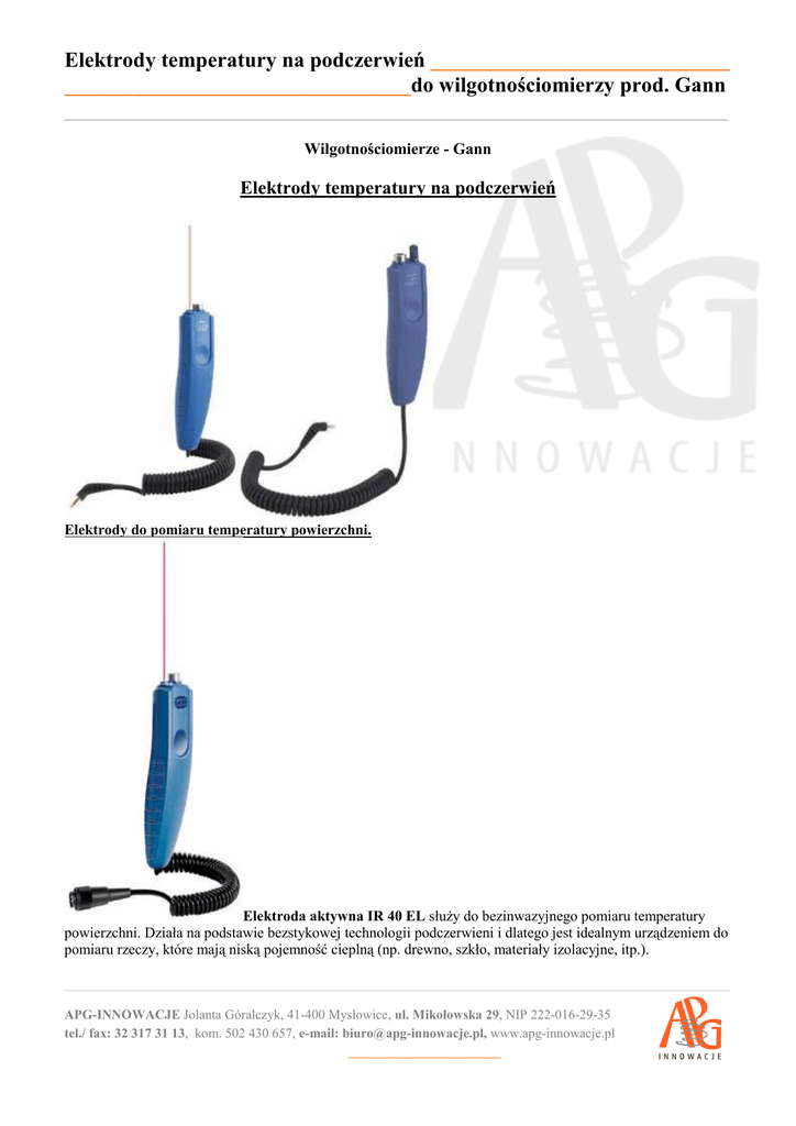 Elektrody temperatury na podczerwień ________________________________ _____________________________________do wilgotnościomierzy prod. Gann ______________________________________________________________ Wilgotnościomierze - Gann Elektrody temperatury na podczerwień Elektrody do pomiaru temperatury powierzchni. Elektroda aktywna IR 40 EL służy do bezinwazyjnego pomiaru temperatury powierzchni. Działa na podstawie bezstykowej technologii podczerwieni i dlatego jest idealnym urządzeniem do pomiaru rzeczy, które mają niską pojemność cieplną (np. drewno, szkło, materiały izolacyjne, itp.). ___________________________________________________________________________________ APG-INNOWACJE Jolanta Góralczyk, 41-400 Mysłowice, ul. Mikołowska 29, NIP 222-016-29-35 tel./ fax: 32 317 31 13, kom. 502 430 657, e-mail: [email protected], www.apg-innowacje.pl ___________________ Elektrody temperatury na podczerwień ________________________________ _____________________________________do wilgotnościomierzy prod. Gann ______________________________________________________________ Elektroda IR 40 EL stosowana jest razem z miernikami Hydromette typu: M 4050, RTU 600, UNI-1 UNI 2 i HB 30. Jest idealnym narzędziem do wykrywania mostków cieplnych, określenia temperatury punktu rosy, pomiarów elementów gorących i ruchomych oraz urządzeń grzewczych. Miejsce pomiaru wskazywane jest przez plamkę, ktora pojawia się w momencie pomiaru dzięki zintegrowanemu wskaźnikowi lasera. ZAKRES POMIARU: od -20 ° - 199,9 ° C; (z Hydromette M 4050: od 0 ° - +199 ° C), ROZDZIELCZOŚĆ: 0,1 ° C STOPIEŃ EMISJI: 0,95 (stały) WSÞÓŁCZYNNIK ODLEGŁOŚCI: 6:1. Średnica miejsca pomiaru powinna być zwiększana lub zmniejszana w zależności od odległości do miejsca pomiaru w stosunku 6:1. Oznacza to, że w przypadku pomiaru miejsca o średnicy ok. 45 mm, pomiar powinien być dokonywany z odległości 250 mm od obiektu. Uwaga: Tuż przed czujnikiem miejsce pomiaru ma wielkość 5 mm Do pomiarów na powierzchniach metalowych lub odblaskowych poleca się stosowanie matowo-czarnych naklejek IR 30 / E 95; jesli naklejki nie będą stosowane, może to spowodować fałszywe wyniki pomiarów. -------------------------------------------------------------------------------------------------------------- Elektroda aktywna IR 40 BL służy do bezinwazyjnego pomiaru temperatury powierzchni. Działa na podstawie bezstykowej technologii podczerwieni i dlatego jest idealnym urządzeniem do pomiaru rzeczy, które mają niską pojemność cieplną (np. drewno, szkło, materiały izolacyjne, itp.). ___________________________________________________________________________________ APG-INNOWACJE Jolanta Góralczyk, 41-400 Mysłowice, ul. Mikołowska 29, NIP 222-016-29-35 tel./ fax: 32 317 31 13, kom. 502 430 657, e-mail: [email protected], www.apg-innowacje.pl ___________________ Elektrody temperatury na podczerwień ________________________________ _____________________________________do wilgotnościomierzy prod. Gann ______________________________________________________________ Elektroda IR 40 EL stosowana jest razem z miernikami Hydromette typu: BL HT 70 and BL E. Jest idealnym narzędziem do wykrywania mostków cieplnych, określenia temperatury punktu rosy, pomiary elementów gorących i ruchomych oraz urządzeń grzewczych. Miejsce pomiaru wskazywane jest przez plamkę, ktora pojawia się w momencie pomiaru dzięki zintegrowanemu wskaźnikowi lasera. ZAKRES POMIARU: od -40° - +380° C; ROZDZIELCZOŚĆ: 0,1 ° C STOPIEŃ EMISJI: 0,95 (stały) WSÞÓŁCZYNNIK ODLEGŁOŚCI: 6:1. Średnica miejsca pomiaru powinna być zwiększana lub zmniejszana w zależności od odległości do miejsca pomiaru w stosunku 6:1. Oznacza to, że w przypadku pomiaru miejsca o średnicy ok. 45 mm, pomiar powinien być dokonywany z odległości 250 mm od obiektu. Uwaga: Tuż przed czujnikiem miejsce pomiaru ma wielkość 5 mm Do pomiarów na powierzchniach metalowych lub odblaskowych poleca się stosowanie matowo-czarnych naklejek IR 30 / E 95; jesli naklejki nie będą stosowane, może to spowodować fałszywe wyniki pomiarów. ----------------------------------------------------------------------------------------------------------------- Elektroda na podczerwień TF-IR BL posiada połączone czujniki i może być wykorzystana do równoczesnego przeprowadzenia pomiarów klimatycznych (temperatury i wilgotności powietrza) i pomiarów temperatury powierzchni. Stanowi ona kombinację różnych technik pomiarowych, co sprawie, że może być stosowana do szybkiej i niezawodnej oceny temperatury punktu rosy lub do określenia warunków granicznych na powierzchniach takich jak ściany, podłogi, sufity, jak również do framug okiennych lub drzwiowych. Elektroda TF-IR BL stosowana jest razem z miernikami Hydromette typu: BL UNI-10. W przypadku korzystania z urządzenia można w odpowiednim czasie zapobiegać powstawaniu pleśni (wzrostu grzybów) oraz uniknąć wystapienie wilgoci spowodowanej przez kondensację. ___________________________________________________________________________________ APG-INNOWACJE Jolanta Góralczyk, 41-400 Mysłowice, ul. Mikołowska 29, NIP 222-016-29-35 tel./ fax: 32 317 31 13, kom. 502 430 657, e-mail: [email protected], www.apg-innowacje.pl ___________________ Elektrody temperatury na podczerwień ________________________________ _____________________________________do wilgotnościomierzy prod. Gann ______________________________________________________________ Miejsce pomiarowe może być dokładnie zidentyfikowane za pomocą wbudowanego wskaźnika laserowego. Emisyjność regulowana jest w zakresie od 20 do 100% Automatyczne obliczanie temperatury punktu rosy, wilgotności równowagi drewna (EMC) oraz bezpośredni odczyt wilgotności bezwzględnej powietrza w g / m³ Alarm dźwiękowy uaktywnia się, gdy zostaje wykryta krytyczna temperatura powierzchni. Do pomiarów na powierzchniach metalowych lub 