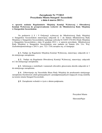 Zarządzenie Nr 77/2013 Prezydenta Miasta Stargard Szczeciński z dnia 6 marca 2013 r. w sprawie nadania Regulaminów Miejskiej Komisji Wyborczej i Obwodowej Komisji Wyborczej do przeprowadzenia wyborów do Młodzieżowej Rady Miejskiej w Stargardzie Szczecińskim Na podstawie § 8 i 9 Ordynacji wyborczej do Młodzieżowej Rady Miejskiej w Stargardzie Szczecińskim stanowiącej załącznik nr 1 do Statutu Młodzieżowej Rady Miejskiej w Stargardzie Szczecińskim, nadanego uchwałą Nr XXIV/276/2012 Rady Miejskiej w Stargardzie Szczecińskim z dnia 18 grudnia 2012 r. w sprawie powołania Młodzieżowej Rady Miejskiej w Stargardzie Szczecińskim oraz nadania jej Statutu (Dz. Urz. Woj. Zachodniopomorskiego z 2013 r. poz. 722 i 724) zarządza się, co następuje: § 1. Nadaje się Regulamin Miejskiej Komisji Wyborczej, stanowiący załącznik nr 1 do niniejszego zarządzenia. § 2. Nadaje się Regulamin Obwodowej Komisji Wyborczej, stanowiący załącznik nr 2 do niniejszego zarządzenia. § 3. Informację o siedzibach i numerach obwodów głosowania określa załącznik nr 3 do niniejszego zarządzenia. § 4. Zobowiązuje się Naczelnika Biura Rady Miejskiej do przekazania niniejszego zarządzenia Dyrektorom szkół gimnazjalnych i ponadgimnazjalnych mających swoją siedzibę na terenie miasta Stargard Szczeciński. § 5. Zarządzenie wchodzi w życie z dniem podpisania. Prezydent Miasta SławomirPajor UZASADNIENIE: Na podstawie § 8 i 9 Ordynacji wyborczej do Młodzieżowej Rady Miejskiej w Stargardzie Szczecińskim stanowiącej załącznik nr 1 do Statutu Młodzieżowej Rady Miejskiej w Stargardzie Szczecińskim, nadanego uchwałą Nr XXIV/276/2012 Rady Miejskiej w Stargardzie Szczecińskim z dnia 18 grudnia 2012 r. w sprawie powołania Młodzieżowej Rady Miejskiej w Stargardzie Szczecińskim oraz nadania jej Statutu należy określić Regulamin Miejskiej Komisji Wyborczej i Obwodowej Komisji Wyborczej do przeprowadzenia wyborów do Młodzieżowej Rady Miejskiej w Stargardzie Szczecińskim jak i ustalić siedziby Obwodowych Komisji Wyborczych wraz z numerami obwodów głosowania. Załącznik nr 1 do Zarządzenia Nr 77/2013 Prezydenta Miasta Stargard Szczeciński z dnia 6 marca 2013 r. Regulamin Miejskiej Komisji Wyborczej powołanej do przeprowadzenia wyborów Młodzieżowej Rady Miejskiej w Stargardzie Szczecińskim § 1. Miejska Komisja Wyborcza, zwana dalej „Komisją”, wykonuje zgodnie z właściwością zadania i czynności określone w Ordynacji Wyborczej do Młodzieżowej Rady Miejskiej i niniejszym Regulaminie. § 2.1. Po otrzymaniu protokołów z głosowania w obwodach, Komisja sporządza Protokół z wyborów i podaje do publicznej wiadomości skład Młodzieżowej Rady Miejskiej. 2. Dyrektorom szkół, którzy przystąpili do wyborów Komisja przekazuje Protokół z wyborów wraz z zestawieniem wyników głosowania w obwodach oraz Komunikat zawierający skład Młodzieżowej Rady Miejskiej. 3. Komisja wydaje radnym zaświadczenia o wyborze. § 3.1. Komisja rozstrzyga w sprawach należących do jej właściwości na posiedzeniach w obecności co najmniej połowy swego składu, w tym Przewodniczącego lub Sekretarza. 2. Uchwały Komisji zapadają większością głosów, w głosowaniu jawnym. W razie równej liczby głosów rozstrzyga głos przewodniczącego posiedzenia. § 4.1. Komisja zbiera się na pierwszym posiedzeniu w terminie określonym w Kalendarzu czynności wyborczych. Do chwili wyboru Przewodniczącego, pierwszemu posiedzeniu Komisji przewodniczy najstarszy wiekiem jej członek. 2. Na pierwszym posiedzeniu Komisja: 1) wybiera oddzielnie Przewodniczącego i Sekretarza, 2) omawia zadania i tryb pracy Komisji oraz obowiązki i uprawnienia osób wchodzących w jej skład, a w razie potrzeby określa wytyczne celem sprawnego przeprowadzenia wyborów, 3) dokonuje podziału czynności pomiędzy osoby wchodzące w jej skład, 4) ustala plan działań związanych z przyjmowaniem zgłoszeń list kandydatów na radnych. 3. Wybory Przewodniczącego i Sekretarza odbywają się w głosowaniu jawnym, w obecności co najmniej połowy składu Komisji. W razie równej liczby głosów ponawia się głosowanie. 1) 2) 3) 4) § 5.1. Pracami Komisji kieruje jej Przewodniczący, który w szczególności: czuwa nad wykonaniem zadań Komisji, reprezentuje Komisję na zewnątrz, zwołuje posiedzenia Komisji i im przewodniczy, podpisuje uchwały podjęte na posiedzeniach, w których uczestniczył, oraz podpisuje dokumenty i pisma związane z działalnością Komisji. 2. W razie nieobecności Przewodniczącego jego funkcje wypełnia Sekretarz. § 6.1. Członkowie Komisji obowiązani są aktywnie uczestniczyć w posiedzeniach i innych pracach Komisji. 2. W razie niemożliwości wzięcia udziału w pracach Komisji jej członek powinien, w miarę możliwości jeszcze przed posiedzeniem, poinformować o tym Przewodniczącego lub Sekretarza. § 7.1. Z posiedzenia Komisji sporządza się protokół, w którym podaje się: czas trwania obrad, porządek posiedzenia, imiona i nazwiska uczestników, zwięzłą treść wystąpień oraz podjęte rozstrzygnięcia. 2. Do protokołu dołącza się podjęte uchwały oraz inne dokumenty. 3. Protokół podpisuje przewodniczący posiedzenia. § 8.1. Komisja jest obowiązana bez zbędnej zwłoki badać wniesione do niej skargi na działalność obwodowych komisji wyborczych. 2. Wszelkie skargi, o których mowa w ust. 1, Komisja rozstrzyga do czasu podania do publicznej wiadomości na stronie internetowej miasta składu Młodzieżowej Rady Miejskiej. § 9. Komisja współdziała z Naczelnikiem Biura Rady Miejskiej oraz Dyrektorem Biura Prezydenta Miasta w ustalaniu zasad i sposobu wykonywania zadań wyborczych. § 10. Prezydent Miasta wydaje członkom Komisji dokumenty, potwierdzające członkostwo i pełnione w Komisji funkcje, którymi legitymują się przy wykonywaniu zadań Komisji. § 11.1. W przypadku konieczności dokonania zmiany w składzie Komisji jej
