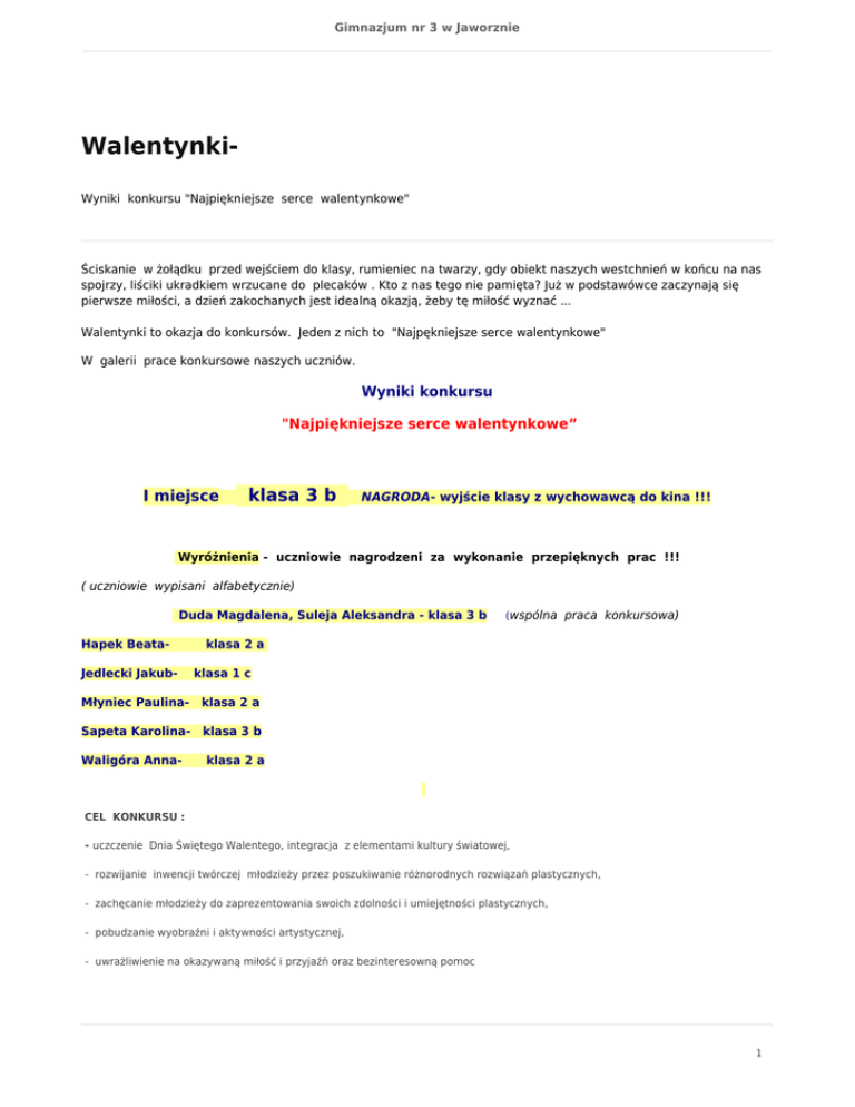 Gimnazjum nr 3 w Jaworznie WalentynkiWyniki konkursu "Najpiękniejsze serce walentynkowe" Ściskanie w żołądku przed wejściem do klasy, rumieniec na twarzy, gdy obiekt naszych westchnień w końcu na nas spojrzy, liściki ukradkiem wrzucane do plecaków . Kto z nas tego nie pamięta? Już w podstawówce zaczynają się pierwsze miłości, a dzień zakochanych jest idealną okazją, żeby tę miłość wyznać ... Walentynki to okazja do konkursów. Jeden z nich to "Najpękniejsze serce walentynkowe" W galerii prace konkursowe naszych uczniów. Wyniki konkursu "Najpiękniejsze serce walentynkowe” I miejsce klasa 3 b NAGRODA- wyjście klasy z wychowawcą do kina !!! Wyróżnienia - uczniowie nagrodzeni za wykonanie przepięknych prac !!! ( uczniowie wypisani alfabetycznie) Duda Magdalena, Suleja Aleksandra - klasa 3 b Hapek BeataJedlecki Jakub- (wspólna praca konkursowa) klasa 2 a klasa 1 c Młyniec Paulina- klasa 2 a Sapeta Karolina- klasa 3 b Waligóra Anna- klasa 2 a CEL KONKURSU : - uczczenie Dnia Świętego Walentego, integracja z elementami kultury światowej, - rozwijanie inwencji twórczej młodzieży przez poszukiwanie różnorodnych rozwiązań plastycznych, - zachęcanie młodzieży do zaprezentowania swoich zdolności i umiejętności plastycznych, - pobudzanie wyobraźni i aktywności artystycznej, - uwrażliwienie na okazywaną miłość i przyjaźń oraz bezinteresowną pomoc 1 Gimnazjum nr 3 w Jaworznie FORMA KONKURSU: - konkurs ma charakter indywidualny lub grupowy (np. klasa) - przedmiotem konkursu jest wykonanie prac przestrzennych,(np. serce poducha, girlanda, serce -origami ) - uczestnik ma prawo wykonać maksymalnie 3 prace,zaopatrzone w metryczkę, na której należy umieścić: imię i nazwisko autora pracy KOMISJA OCENIAJĄCA Komisja oceniać będzie prace biorąc pod uwagę następujące elementy: - oryginalność pomysłu i wykonania (1 – 5 pkt) - estetykę wykonania (1 – 5 pkt) - wrażenia ogólne (1 – 5 pkt) 2