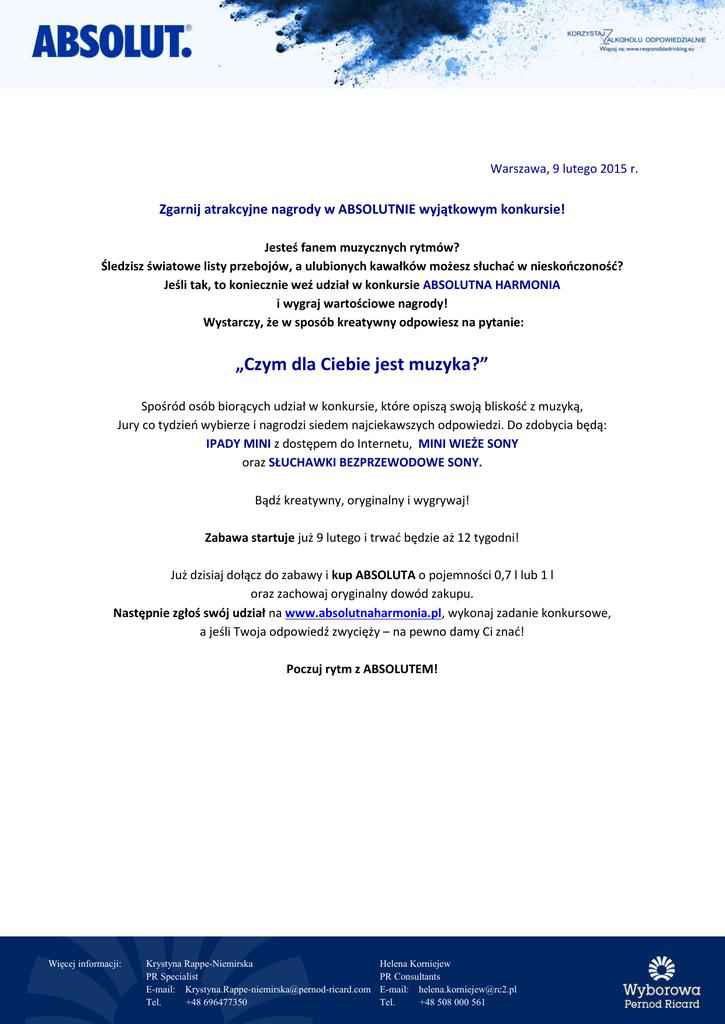 Warszawa, 9 lutego 2015 r. Zgarnij atrakcyjne nagrody w ABSOLUTNIE wyjątkowym konkursie! Jesteś fanem muzycznych rytmów? Śledzisz światowe listy przebojów, a ulubionych kawałków możesz słuchać w nieskończoność? Jeśli tak, to koniecznie weź udział w konkursie ABSOLUTNA HARMONIA i wygraj wartościowe nagrody! Wystarczy, że w sposób kreatywny odpowiesz na pytanie: „Czym dla Ciebie jest muzyka?” Spośród osób biorących udział w konkursie, które opiszą swoją bliskość z muzyką, Jury co tydzień wybierze i nagrodzi siedem najciekawszych odpowiedzi. Do zdobycia będą: IPADY MINI z dostępem do Internetu, MINI WIEŻE SONY oraz SŁUCHAWKI BEZPRZEWODOWE SONY. Bądź kreatywny, oryginalny i wygrywaj! Zabawa startuje już 9 lutego i trwać będzie aż 12 tygodni! Już dzisiaj dołącz do zabawy i kup ABSOLUTA o pojemności 0,7 l lub 1 l oraz zachowaj oryginalny dowód zakupu. Następnie zgłoś swój udział na www.absolutnaharmonia.pl, wykonaj zadanie konkursowe, a jeśli Twoja odpowiedź zwycięży – na pewno damy Ci znać! Poczuj rytm z ABSOLUTEM! Więcej informacji: Krystyna Rappe-Niemirska PR Specialist E-mail: [email protected] Tel. +48 696477350 Helena Korniejew PR Consultants E-mail: [email protected] Tel. +48 508 000 561