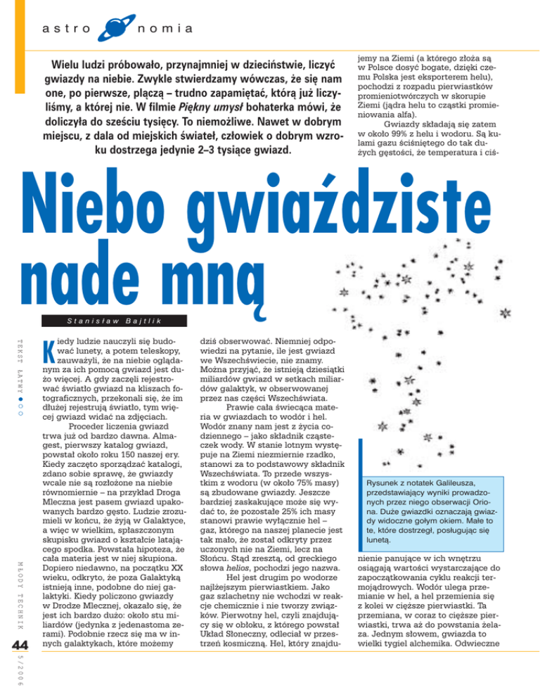astro nomia Wielu ludzi próbowało, przynajmniej w dzieciństwie, liczyć gwiazdy na niebie. Zwykle stwierdzamy wówczas, że się nam one, po pierwsze, plączą – trudno zapamiętać, którą już liczyliśmy, a której nie. W filmie Piękny umysł bohaterka mówi, że doliczyła do sześciu tysięcy. To niemożliwe. Nawet w dobrym miejscu, z dala od miejskich świateł, człowiek o dobrym wzroku dostrzega jedynie 2–3 tysiące gwiazd. jemy na Ziemi (a którego z³o¿a s¹ w Polsce dosyæ bogate, dziêki czemu Polska jest eksporterem helu), pochodzi z rozpadu pierwiastków promieniotwórczych w skorupie Ziemi (j¹dra helu to cz¹stki promieniowania alfa). Gwiazdy sk³adaj¹ siê zatem w oko³o 99% z helu i wodoru. S¹ kulami gazu œciœniêtego do tak du¿ych gêstoœci, ¿e temperatura i ciœ- Niebo gwiaździste nade mną Stanisław Bajtlik TEKST ŁATWY ! ! ! M ŁODY TECHNIK 44 K iedy ludzie nauczyli siê budowaæ lunety, a potem teleskopy, zauwa¿yli, ¿e na niebie ogl¹danym za ich pomoc¹ gwiazd jest du¿o wiêcej. A gdy zaczêli rejestrowaæ œwiat³o gwiazd na kliszach fotograficznych, przekonali siê, ¿e im d³u¿ej rejestruj¹ œwiat³o, tym wiêcej gwiazd widaæ na zdjêciach. Proceder liczenia gwiazd trwa ju¿ od bardzo dawna. Almagest, pierwszy katalog gwiazd, powsta³ oko³o roku 150 naszej ery. Kiedy zaczêto sporz¹dzaæ katalogi, zdano sobie sprawê, ¿e gwiazdy wcale nie s¹ roz³o¿one na niebie równomiernie – na przyk³ad Droga Mleczna jest pasem gwiazd upakowanych bardzo gêsto. Ludzie zrozumieli w koñcu, ¿e ¿yj¹ w Galaktyce, a wiêc w wielkim, sp³aszczonym skupisku gwiazd o kszta³cie lataj¹cego spodka. Powsta³a hipoteza, ¿e ca³a materia jest w niej skupiona. Dopiero niedawno, na pocz¹tku XX wieku, odkryto, ¿e poza Galaktyk¹ istniej¹ inne, podobne do niej galaktyki. Kiedy policzono gwiazdy w Drodze Mlecznej, okaza³o siê, ¿e jest ich bardzo du¿o: oko³o stu miliardów (jedynka z jedenastoma zerami). Podobnie rzecz siê ma w innych galaktykach, które mo¿emy dziœ obserwowaæ. Niemniej odpowiedzi na pytanie, ile jest gwiazd we Wszechœwiecie, nie znamy. Mo¿na przyj¹æ, ¿e istniej¹ dziesi¹tki miliardów gwiazd w setkach miliardów galaktyk, w obserwowanej przez nas czêœci Wszechœwiata. Prawie ca³a œwiec¹ca materia w gwiazdach to wodór i hel. Wodór znany nam jest z ¿ycia codziennego – jako sk³adnik cz¹steczek wody. W stanie lotnym wystêpuje na Ziemi niezmiernie rzadko, stanowi za to podstawowy sk³adnik Wszechœwiata. To przede wszystkim z wodoru (w oko³o 75% masy) s¹ zbudowane gwiazdy. Jeszcze bardziej zaskakuj¹ce mo¿e siê wydaæ to, ¿e pozosta³e 25% ich masy stanowi prawie wy³¹cznie hel – gaz, którego na naszej planecie jest tak ma³o, ¿e zosta³ odkryty przez uczonych nie na Ziemi, lecz na S³oñcu. St¹d zreszt¹, od greckiego s³owa helios, pochodzi jego nazwa. Hel jest drugim po wodorze najl¿ejszym pierwiastkiem. Jako gaz szlachetny nie wchodzi w reakcje chemicznie i nie tworzy zwi¹zków. Pierwotny hel, czyli znajduj¹cy siê w ob³oku, z którego powsta³ Uk³ad S³oneczny, odlecia³ w przestrzeñ kosmiczn¹. Hel, który znajdu- Rysunek z notatek Galileusza, przedstawiający wyniki prowadzonych przez niego obserwacji Oriona. Duże gwiazdki oznaczają gwiazdy widoczne gołym okiem. Małe to te, które dostrzegł, posługując się lunetą. nienie panuj¹ce w ich wnêtrzu osi¹gaj¹ wartoœci wystarczaj¹ce do zapocz¹tkowania cyklu reakcji termoj¹drowych. Wodór ulega przemianie w hel, a hel przemienia siê z kolei w ciê¿sze pierwiastki. Ta przemiana, w coraz to ciê¿sze pierwiastki, trwa a¿ do powstania ¿elaza. Jednym s³owem, gwiazda to wielki tygiel alchemika. Odwieczne 5/2006 Gwiazdy neutronowe o masie większej od Słońca wirują kilkaset razy na sekundę. Nieprawdopodobne, a przecież prawdziwe. Ten sam gwiazdozbiór Oriona obserwowany współcześnie, przy użyciu średniej klasy teleskopu. Na zdjęciu widoczne są dziesiątki tysięcy gwiazd. marzenie ludzkoœci o kamieniu filozoficznym, umo¿liwiaj¹cym przemianê jednych pierwiastków w drugie, jest spe³niane przez przyrodê we wnêtrzach gwiazd. Produktem tej przemiany nie s¹ jednak tylko ciê¿sze pierwiastki – jest nim tak¿e du¿a iloœæ energii, tej, która ze S³oñca dociera na Ziemiê i umo¿liwia nam ¿ycie. Gwiazdy o masach równych masie S³oñca ¿yj¹ w stabilnym stanie przez mniej wiêcej dziesiêæ miliardów lat. Jest to wiêc czas porównywalny z okresem istnienia Wszechœwiata. S³oñce osi¹gnê³o w tej chwili wiek œredni i liczy sobie oko³o piêciu miliardów lat. Stabilnoœæ S³oñca – to, ¿e codziennie wygl¹da tak samo, ¿e nie zmieni³o siê wiele od czasu, kiedy na Ziemi powstawa³o ¿ycie, i bêdzie wygl¹da³o podobnie jak teraz za kilka miliardów lat – bierze siê z doskona³ej równowagi pomiêdzy si³¹ grawitacji, usi³uj¹c¹ skupiæ materiê w œrodku S³oñca, a próbuj¹cymi je rozerwaæ ciœnieniem materii i ciœnieniem promieniowania, produkowanego w reakcjach termoj¹drowych we wnêtrzu gwiazdy. Ta równowaga jest naprawdê doskona³a. Gdyby z jakiegoœ powodu grawitacja zwyciê¿y³a i œcisnê³a materiê s³oneczn¹ bardziej ku œrodkowi S³oñca, tempo reakcji j¹drowych wzros³oby. Iloœæ energii produkowanej w S³oñcu zwiêkszy³aby siê i ta dodatkowa energia przywróci³aby mu równowagê, rozpychaj¹c je i ustanawiaj¹c pocz¹tkow¹ konfiguracjê. Gdyby zaœ zwyciê¿y³o promieniowanie i zwiêkszy³o promieñ S³oñca, wtedy tempo reakcji j¹drowych spad³oby. Iloœæ produkowanej w jego wnêtrzu energii „rozpychaj¹cej” zmniejszy³aby siê i grawitacja przywróci³aby S³oñcu pocz¹tkow¹ konfiguracjê. Ta idealna równowaga pomiêdzy odœrodkowym, rozpychaj¹cym dzia³aniem wydobywaj¹cej siê z wnêtrza S³oñca energii, a dzia³aniem grawitacji skupiaj¹cej wszystko ku œrodkowi za³amie siê dopiero wtedy, kiedy we wnêtrzu gwiazdy wyczerpie siê paliwo j¹drowe. W