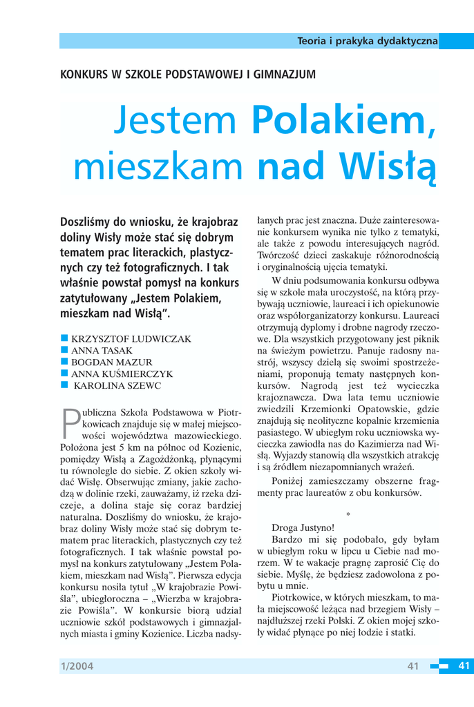 Teoria i prakyka dydaktyczna KONKURS W SZKOLE PODSTAWOWEJ I GIMNAZJUM Jestem Polakiem, mieszkam nad Wis∏à DoszliÊmy do wniosku, ˝e krajobraz doliny Wis∏y mo˝e staç si´ dobrym tematem prac literackich, plastycznych czy te˝ fotograficznych. I tak w∏aÊnie powsta∏ pomys∏ na konkurs zatytu∏owany „Jestem Polakiem, mieszkam nad Wis∏à”. # KRZYSZTOF LUDWICZAK # ANNA TASAK # BOGDAN MAZUR # ANNA KUÂMIERCZYK # KAROLINA SZEWC P ubliczna Szko∏a Podstawowa w Piotrkowicach znajduje si´ w ma∏ej miejscowoÊci województwa mazowieckiego. Po∏o˝ona jest 5 km na pó∏noc od Kozienic, pomi´dzy Wis∏à a Zago˝d˝onkà, p∏ynàcymi tu równolegle do siebie. Z okien szko∏y widaç Wis∏´. Obserwujàc zmiany, jakie zachodzà w dolinie rzeki, zauwa˝amy, i˝ rzeka dziczeje, a dolina staje si´ coraz bardziej naturalna. DoszliÊmy do wniosku, ˝e krajobraz doliny Wis∏y mo˝e staç si´ dobrym tematem prac literackich, plastycznych czy te˝ fotograficznych. I tak w∏aÊnie powsta∏ pomys∏ na konkurs zatytu∏owany „Jestem Polakiem, mieszkam nad Wis∏à”. Pierwsza edycja konkursu nosi∏a tytu∏ „W krajobrazie PowiÊla”, ubieg∏oroczna – „Wierzba w krajobrazie PowiÊla”. W konkursie biorà udzia∏ uczniowie szkó∏ podstawowych i gimnazjalnych miasta i gminy Kozienice. Liczba nadsy- 1/2004 ∏anych prac jest znaczna. Du˝e zainteresowanie konkursem wynika nie tylko z tematyki, ale tak˝e z powodu interesujàcych nagród. TwórczoÊç dzieci zaskakuje ró˝norodnoÊcià i oryginalnoÊcià uj´cia tematyki. W dniu podsumowania konkursu odbywa si´ w szkole ma∏a uroczystoÊç, na którà przybywajà uczniowie, laureaci i ich opiekunowie oraz wspó∏organizatorzy konkursu. Laureaci otrzymujà dyplomy i drobne nagrody rzeczowe. Dla wszystkich przygotowany jest piknik na Êwie˝ym powietrzu. Panuje radosny nastrój, wszyscy dzielà si´ swoimi spostrze˝eniami, proponujà tematy nast´pnych konkursów. Nagrodà jest te˝ wycieczka krajoznawcza. Dwa lata temu uczniowie zwiedzili Krzemionki Opatowskie, gdzie znajdujà si´ neolityczne kopalnie krzemienia pasiastego. W ubieg∏ym roku uczniowska wycieczka zawiod∏a nas do Kazimierza nad Wis∏à. Wyjazdy stanowià dla wszystkich atrakcj´ i sà êród∏em niezapomnianych wra˝eƒ. Poni˝ej zamieszczamy obszerne fragmenty prac laureatów z obu konkursów. * Droga Justyno! Bardzo mi si´ podoba∏o, gdy by∏am w ubieg∏ym roku w lipcu u Ciebie nad morzem. W te wakacje pragn´ zaprosiç Ci´ do siebie. MyÊl´, ˝e b´dziesz zadowolona z pobytu u mnie. Piotrkowice, w których mieszkam, to ma∏a miejscowoÊç le˝àca nad brzegiem Wis∏y – najd∏u˝szej rzeki Polski. Z okien mojej szko∏y widaç p∏ynàce po niej ∏odzie i statki. 41 41 Teoria i praktyka dydaktyczna Rys. Paulina Sroczyƒska Latem przyje˝d˝a do nas wiele osób, by podziwiaç pi´kny nadwiÊlaƒski krajobraz i opalaç si´ na rozgrzanym piasku. Wszystko Ci poka˝´, gdy tylko przyjedziesz do mnie. Miejsce, w którym mieszkam, jest bardzo urokliwe. Po obydwu stronach Wis∏y roÊnie du˝o drzew, na których ptaki budujà swe gniazda. WÊród drzew wyró˝nia si´ topola bia∏a (bia∏odrzew), o jasnej korze i czarna, o prawie trójkàtnych liÊciach. Drzewa te osiàgajà do 30 metrów wysokoÊci. Rosnà tu te˝ wierzby bia∏e, które majà pod∏u˝nie sp´kanà kor´. Spotyka si´ brzoz´ brodawkowatà o wysmuk∏ym pniu i charakterystycznej bia∏ej korze. Osika to wysokie drzewo, które przy lekkim podmuchu wiatru odwraca swe liÊcie, pokazujàc bia∏à stron´. Stàd powsta∏o powiedzenie, ˝e „dr˝y jak osika”. Nad Wis∏à rosnà ró˝ne gatunki traw, skrzyp polny, babka zwyczajna, mniszek lekarski, zwany mleczem, podbia∏, mi´ta i miko∏ajek. Z wody wystajà pa∏ki wodne i grzybienie, które majà wspania∏e kwiaty. 42 42 Wiklina, której roÊnie u nas du˝o, dostarcza surowca na wyroby wikliniarskie. Nad taflà wody latajà rybitwy, ptaki cz´sto mylone z mewami, a w rzece p∏ywajà ∏ab´dzie – ich wyglàd na pewno Ci´ zachwyci. Jedynym utrapieniem jest przebywanie wieczorem nad rzekà, kiedy gryzà komary i kàÊliwe meszki, ale ju˝ znam sposób na ochron´ przed nimi. We wsi majà gniazda bociany bia∏e. Wyst´pujà te˝ i czarne bociany, ale ˝aden z nich nie ma gniazda w widocznym miejscu. Jesienià zobaczyç mo˝na klucze przelatujàcych ˝urawi. Mknà one po niebie jak strza∏y. Na poczàtku maja s∏ychaç kukanie kuku∏ki. Bardzo dobrze jest mieç przy sobie pienià˝ki na szcz´Êcie. Spotkaç tu te˝ mo˝na pi´knie ubarwionà krask´ oraz jastrz´bia i czajk´. Rajem dla ptactwa i drobnych zwierzàt sà wyspy na WiÊle, pokryte mnóstwem krzaków. Nad brzegiem majà siedliska bobry. Jest ich w naszej okolicy sporo, tote˝ cz´sto spotyka si´ podgryzione przez nie drzewa. Wyglàdajà one jak zatemperowane o∏ówki. Geografia w Szkole Teoria i prakyka dydaktyczna Wierzba i jej przyjaciele ˝yliby pewnie Ryb w WiÊle jest mnóstwo. Sà szczupaki, d∏ugo szcz´Êliwi, gdyby ich spokoju nie zaleszcze, sumy, rapy, p∏ocie, ukleje, to∏pygi. k∏óci∏ warkot wielkich, koszmarnych maszyn, Ka˝dego roku odbywajà si´ zawody w´dkarktóre zacz´∏y wykopywaç g∏´bokie do∏y skie. Mam nadziej´, ˝e razem z moim braw pobli˝u sadzawki. tem wybierzemy si´ na po∏ów i coÊ z∏owimy. – Co si´ dzieje? – nie mog∏a pojàç stara W rzece mo˝na spotkaç te˝ raki, co Êwiadczy, wierzba. ˝e woda na tym odcinku jest czysta. Bacznie obserwowa∏a przez kilka dni, jak W przybrze˝nych zaroÊlach ˝yjà zajàce ludzie w pocie czo∏a pracujà przy sadzawce. i sarny. Sà to wyjàtkowo zgrabne zwierz´ta. Nadal nie wiedzia∏a, dlaczego niszczà otaNa uwag´ zas∏ugujà te˝ ba˝anty wyst´pujàce czajàcà jà przyrod´. tu w zaroÊlach. Szczególnie pi´knie wyglàdajà Zwierz´ta pogrà˝y∏y si´ w smutku. Barsamce, które majà ∏adnie ubarwione piórka. dzo prze˝ywa∏y ca∏e wyda