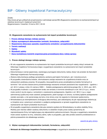 BIP - Główny Inspektorat Farmaceutyczny Źródło: http://www.gif.gov.pl/bip/tryb-przyjmowania-i-zal/rodzaje-spraw/381,Wygaszenie-zezwolenia-na-wytwarzanieimport-pr oduktow-leczniczych-i-badanych-prod.html Wygenerowano: Czwartek, 9 marca 2017, 02:24 III. Wygaszenie zezwolenia na wytwarzanie lub import produktów leczniczych 1. Proces obsługi danego rodzaju sprawy 2. Wykaz wymaganych dokumentów (wnioski, formularze, załączniki) 3. Wyjaśnienia dotyczące sposobu wypełniania wniosków i przygotowania dokumentów 4. Termin realizacji 5. Opłaty 6. Wysokość opłaty 7. Dane kontaktowe komórki organizacyjnej prowadzącej dany rodzaj sprawy 1. Proces obsługi danego rodzaju sprawy. ● W celu wygaszenia zezwolenia na wytwarzanie lub import produktów leczniczych należy złożyć wniosek do Głównego Inspektora Farmaceutycznego o wygaśnięcie zezwolenia na wytwarzanie lub import produktów leczniczych. ● Dokumentację w wersji papierowej, zawierającą wymagane dokumenty należy złożyć lub przesłać do Kancelarii Głównego Inspektoratu Farmaceutycznego. ● Złożona dokumentacja podlega sprawdzeniu zarówno pod kątem formalnym, jak i merytorycznym. ● W przypadku stwierdzenia braków, sformułowane zostaje wezwanie do uzupełnienia braków wraz ze wskazaniem podstawy prawnej. W przypadku nieuzupełnienia przez przedsiębiorcę braków formalnych w terminie 7 dni od dnia dostarczenia przedmiotowego wezwania wniosek pozostanie bez rozpatrzenia – zgodnie z art. 64 § 2 ustawy z dnia 14 czerwca 1960 r. - Kodeks postępowania administracyjnego (Dz. U. 2013, poz. 267). ● W przypadku trudności z uzupełnieniem braku we wniosku w terminie określonym w art. 64 § 2 k.p.a., strona może zwrócić się do organu z wnioskiem o zawieszenie postępowania. Zgodnie z art. 98 § 1 k.p.a. organ administracji publicznej może zawiesić postępowanie, jeżeli wystąpi o to strona, na której żądanie postępowanie zostało wszczęte, a nie sprzeciwiają się temu inne strony oraz nie zagraża to interesowi społecznemu. ● Wnioskodawca po skompletowaniu brakującej dokumentacji, jest zobowiązany do jak najszybszego złożenia jej w Urzędzie wraz z pisemnym wnioskiem o podjęcie postępowania w sprawie wygaśnięcia zezwolenia na wytwarzanie lub import produktów leczniczych. ● W przypadku wygaśnięcia zezwolenia decyzja zostanie wysłana do Wnioskodawcy na adres siedziby firmy. Możliwy jest również odbiór osobisty dokumentu w siedzibie Urzędu przez osobę uprawnioną do reprezentowania firmy lub legitymującą się odpowiednim pełnomocnictwem. Decyzja o wygaśnięciu zezwolenia może zostać wysłana na inny, wskazany adres, tylko w przypadku, gdy taka prośba zostanie przedstawiona w piśmie przewodnim do składanego wniosku. powrót do góry strony 2. Wykaz wymaganych dokumentów (wnioski, formularze, załączniki) ● Wniosek do Głównego Inspektora Farmaceutycznego o wygaśnięcie zezwolenia na wytwarzanie lub import produktów leczniczych. We wniosku należy zamieścić następujące informacje: nazwę podmiotu zgodną z wpisem w Rejestrze przedsiębiorców Krajowego Rejestru Sądowego lub Centralnej Ewidencji i Informacji o Działalności Gospodarczej, adres podmiotu, nr zezwolenia na wytwarzanie lub import produktów leczniczych stanowiącego przedmiot wygaśnięcia. ● Pismo przewodnie do składanego wniosku powinno zawierać dane osoby do kontaktu w sprawie wygaśnięcia zezwolenia: imię, nazwisko, telefon, adres e-mail. ● Do wniosku o wygaśnięcie zezwolenia na wytwarzanie lub import produktów leczniczych należy dołączyć następujące dokumenty: ❍ odpis z Krajowego Rejestru Sądowego lub wydruk z Centralnej Informacji Krajowego Rejestru Sądowego, aktualny na dzień składania wniosku, jeżeli dotyczy; ❍ informację na temat miejsca przechowywania prób archiwalnych lub referencyjnych po uzyskaniu decyzji stwierdzającej wygaśnięcie zezwolenia na wytwarzanie lub import produktów leczniczych, jeżeli przedsiębiorstwo składające wniosek takie próby przechowywało (miejsce to powinno mieć możliwość zapewnienia odpowiednich warunków przechowywania prób); ❍ informację na temat miejsca przechowywania zapisów dotyczących wytwarzania serii produktów leczniczych lub importowanych produktów leczniczych (w tym ich dystrybucji) po uzyskaniu decyzji stwierdzającej wygaśnięcie zezwolenia na wytwarzanie lub import produktów leczniczych; ❍ kopię umowy dotyczącej przechowywania dokumentacji lub prób zawartej z jednostką posiadającą zezwolenie na wytwarzanie lub import produktów leczniczych. ❍ powrót do góry strony 3. Wyjaśnienia dotyczące sposobu wypełniania wniosków i przygotowania dokumentów Wniosek i pismo przewodnie oraz wszystkie pisma nadsyłane do Głównego Inspektora Farmaceutycznego w toku rozpatrywania sprawy muszą być podpisane przez osobę/osoby upoważnione do reprezentowania podmiotu zgodnie z odpisem z rejestru przedsiębiorców Krajowego Rejestru Sądowego lub osobę działającą na podstawie upoważnienia podpisanego przez osobę wskazaną w KRS. Wzór pełnomocnictwa oraz wszelkie związane z nim czynności reguluje Komunikat nr 3 z dnia 22 września 2009 r. ( https://www.gif.gov.pl/pl/decyzje-i-komunikaty/komunikaty/archiwum/87,Komunikaty-2012-20 08.html) powrót do góry strony 4. Termin realizacji Główny Inspektor Farmaceutyczny wydaje decyzję o wygaśnięciu zezwolenia na wytwarzanie lub import produktów leczniczych bądź decyzję o odmowie wygaśnięcia zezwolenia w ciągu 30 dni, licząc od dnia złożenia wniosku. Zgodnie z art. 41 ust. 3 ustawy z dnia 6 września 2001 r. – Prawo farmaceutyczne (Dz. U. z 2008 r. Nr 45, poz. 271, z późn. zm.) w uzasadnionych przypadkach termin rozpatrzenia wniosku może ulec przedłużeniu, nie dłużej jednak niż o kolejne 60 dni, o czym Wnioskodawca zostanie poinformowany odrębnym pismem. powrót do góry strony 5. Opłaty Dowód wniesienia opłaty, z