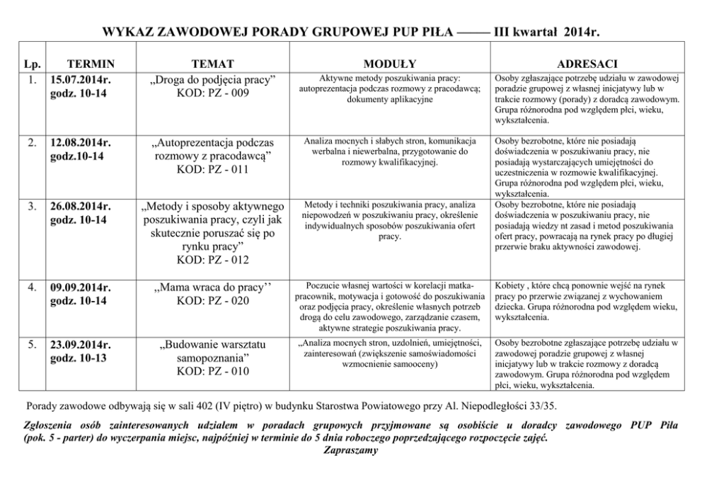 WYKAZ ZAWODOWEJ PORADY GRUPOWEJ PUP PIŁA ––––– III kwartał 2014r. Lp. TERMIN 1. 15.07.2014r. godz. 10-14 TEMAT „Droga do podjęcia pracy” KOD: PZ - 009 MODUŁY ADRESACI Aktywne metody poszukiwania pracy: autoprezentacja podczas rozmowy z pracodawcą; dokumenty aplikacyjne Osoby zgłaszające potrzebę udziału w zawodowej poradzie grupowej z własnej inicjatywy lub w trakcie rozmowy (porady) z doradcą zawodowym. Grupa różnorodna pod względem płci, wieku, wykształcenia. 2. 12.08.2014r. godz.10-14 „Autoprezentacja podczas rozmowy z pracodawcą” KOD: PZ - 011 Analiza mocnych i słabych stron, komunikacja werbalna i niewerbalna, przygotowanie do rozmowy kwalifikacyjnej. Osoby bezrobotne, które nie posiadają doświadczenia w poszukiwaniu pracy, nie posiadają wystarczających umiejętności do uczestniczenia w rozmowie kwalifikacyjnej. Grupa różnorodna pod względem płci, wieku, wykształcenia. Osoby bezrobotne, które nie posiadają doświadczenia w poszukiwaniu pracy, nie posiadają wiedzy nt zasad i metod poszukiwania ofert pracy, powracają na rynek pracy po długiej przerwie braku aktywności zawodowej. 3. 26.08.2014r. godz. 10-14 „Metody i sposoby aktywnego poszukiwania pracy, czyli jak skutecznie poruszać się po rynku pracy” KOD: PZ - 012 Metody i techniki poszukiwania pracy, analiza niepowodzeń w poszukiwaniu pracy, określenie indywidualnych sposobów poszukiwania ofert pracy. 4. 09.09.2014r. godz. 10-14 ,,Mama wraca do pracy’’ KOD: PZ - 020 Poczucie własnej wartości w korelacji matkapracownik, motywacja i gotowość do poszukiwania oraz podjęcia pracy, określenie własnych potrzeb drogą do celu zawodowego, zarządzanie czasem, aktywne strategie poszukiwania pracy. Kobiety , które chcą ponownie wejść na rynek pracy po przerwie związanej z wychowaniem dziecka. Grupa różnorodna pod względem wieku, wykształcenia. 5. 23.09.2014r. godz. 10-13 „Budowanie warsztatu samopoznania” KOD: PZ - 010 „Analiza mocnych stron, uzdolnień, umiejętności, zainteresowań (zwiększenie samoświadomości wzmocnienie samooceny) Osoby bezrobotne zgłaszające potrzebę udziału w zawodowej poradzie grupowej z własnej inicjatywy lub w trakcie rozmowy z doradcą zawodowym. Grupa różnorodna pod względem płci, wieku, wykształcenia. Porady zawodowe odbywają się w sali 402 (IV piętro) w budynku Starostwa Powiatowego przy Al. Niepodległości 33/35. Zgłoszenia osób zainteresowanych udziałem w poradach grupowych przyjmowane są osobiście u doradcy zawodowego PUP Piła (pok. 5 - parter) do wyczerpania miejsc, najpóźniej w terminie do 5 dnia roboczego poprzedzającego rozpoczęcie zajęć. Zapraszamy