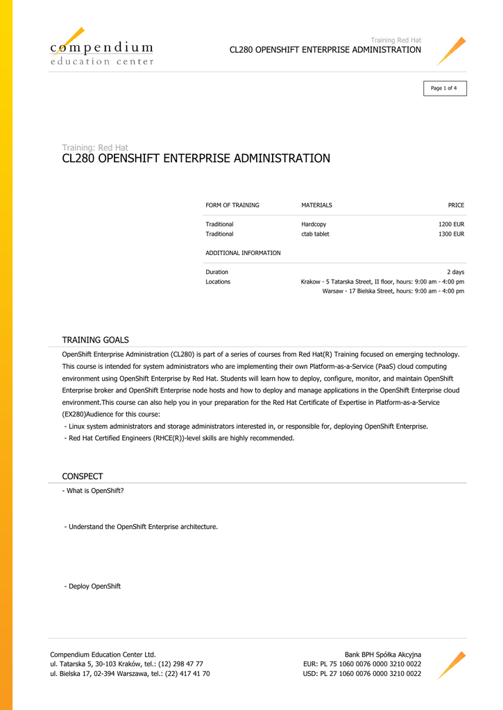 Training Red Hat CL280 OPENSHIFT ENTERPRISE ADMINISTRATION Page 1 of 4 Training: Red Hat CL280 OPENSHIFT ENTERPRISE ADMINISTRATION FORM OF TRAINING MATERIALS PRICE Traditional Hardcopy 1200 EUR Traditional ctab tablet 1300 EUR ADDITIONAL INFORMATION Duration Locations 2 days Krakow - 5 Tatarska Street, II floor, hours: 9:00 am - 4:00 pm Warsaw - 17 Bielska Street, hours: 9:00 am - 4:00 pm TRAINING GOALS OpenShift Enterprise Administration (CL280) is part of a series of courses from Red Hat(R) Training focused on emerging technology. This course is intended for system administrators who are implementing their own Platform-as-a-Service (PaaS) cloud computing environment using OpenShift Enterprise by Red Hat. Students will learn how to deploy, configure, monitor, and maintain OpenShift Enterprise broker and OpenShift Enterprise node hosts and how to deploy and manage applications in the OpenShift Enterprise cloud environment.This course can also help you in your preparation for the Red Hat Certificate of Expertise in Platform-as-a-Service (EX280)Audience for this course: - Linux system administrators and storage administrators interested in, or responsible for, deploying OpenShift Enterprise. - Red Hat Certified Engineers (RHCE(R))-level skills are highly recommended. CONSPECT - What is OpenShift? - Understand the OpenShift Enterprise architecture. - Deploy OpenShift Compendium Education Center Ltd. ul. Tatarska 5, 30-103 Kraków, tel.: (12) 298 47 77 ul. Bielska 17, 02-394 Warszawa, tel.: (22) 417 41 70 Bank BPH Spółka Akcyjna EUR: PL 75 1060 0076 0000 3210 0022 USD: PL 27 1060 0076 0000 3210 0022 Training Red Hat CL280 OPENSHIFT ENTERPRISE ADMINISTRATION Page 2 of 4 - Perform an automated deployment of OpenShift Enterprise. - Deploy an infrastructure host - Install and configure an OpenShift Enterprise broker host. - Deploy a node host - Install and configure an OpenShift Enterprise node host. - Resource management - Configure user and gear limits. - Create and configure districts. - Deploy applications - Deploy and manage applications on OpenShift Enterprise using command line tools. - Use quickstarts - Hit the ground running with pre-built applications. Compendium Education Center Ltd. ul. Tatarska 5, 30-103 Kraków, tel.: (12) 298 47 77 ul. Bielska 17, 02-394 Warszawa, tel.: (22) 417 41 70 Bank BPH Spółka Akcyjna EUR: PL 75 1060 0076 0000 3210 0022 USD: PL 27 1060 0076 0000 3210 0022 Training Red Hat CL280 OPENSHIFT ENTERPRISE ADMINISTRATION Page 3 of 4 - Obtain metrics with Watchman - Configure and manage OpenShift Enterprise metrics with Watchman. - Use administration console - Get usage stats of OpenShift Enterprise with administration console. - Create and deploy custom cartridges - Understand custom cartridges development and deployment on OpenShift Enterprise. - Map a development team - Map a development team structure using OpenShift Enterprise user schema options. REQUIREMENTS - Red Hat Certified System Administrator (RHCSA) certification or equivalent experience is required. Red Hat Certified Engineer (RHCE) certification or equivalent experience is recommended. - For candidates who have not earned their RHCSA or RHCE certifications, confirmation of the correct skills and knowledge can be obtained by passing the online skills assessment. CERTIFICATE Participants will obtain certificates signed by Red Hat. Compendium Education Center Ltd. ul. Tatarska 5, 30-103 Kraków, tel.: (12) 298 47 77 ul. Bielska 17, 02-394 Warszawa, tel.: (22) 417 41 70 Bank BPH Spółka Akcyjna EUR: PL 75 1060 0076 0000 3210 0022 USD: PL 27 1060 0076 0000 3210 0022 Training Red Hat CL280 OPENSHIFT ENTERPRISE ADMINISTRATION Page 4 of 4 TRAINER Red Hat Certified Instructor. Compendium Education Center Ltd. ul. Tatarska 5, 30-103 Kraków, tel.: (12) 298 47 77 ul. Bielska 17, 02-394 Warszawa, tel.: (22) 417 41 70 Bank BPH Spółka Akcyjna EUR: PL 75 1060 0076 0000 3210 0022 USD: PL 27 1060 0076 0000 3210 0022