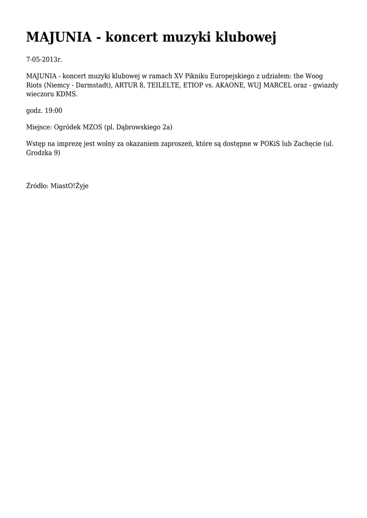 MAJUNIA - koncert muzyki klubowej 7-05-2013r. MAJUNIA - koncert muzyki klubowej w ramach XV Pikniku Europejskiego z udziałem: the Woog Riots (Niemcy - Darmstadt), ARTUR 8, TEILELTE, ETIOP vs. AKAONE, WUJ MARCEL oraz - gwiazdy wieczoru KDMS. godz. 19:00 Miejsce: Ogródek MZOS (pl. Dąbrowskiego 2a) Wstęp na imprezę jest wolny za okazaniem zaproszeń, które są dostępne w POKiS lub Zachęcie (ul. Grodzka 9) Źródło: MiastO!Żyje