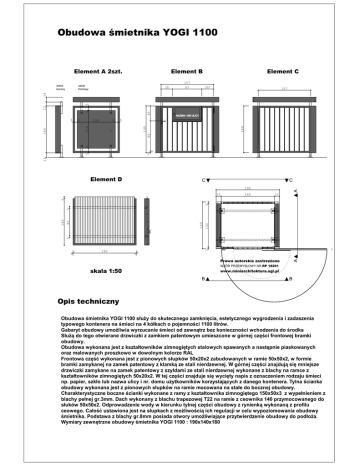 Obudowa śmietnika YOGI 1100 Element A 2szt. widok frontowy 35 157 87 Element C 355 157 8 5 14 5 8 90 140 NAZWA I NR ULICY 5 140 114 140 8 114 5 45 8 12 5 14 widok boczny Element B Element D C C A 190 160 15 140 190 A 5 5 3% 130 82 140 5 5 5 15 Prawa autorskie zastrzeżone WZÓR PRZEMYSŁOWY NR RP 18201 skala 1:50 www.miniarchitektura.sgl.pl B B Opis techniczny Obudowa śmietnika YOGI 1100 służy do skutecznego zamknięcia, estetycznego wygrodzenia i zadaszenia typowego kontenera na śmieci na 4 kółkach o pojemności 1100 litrów. Gabaryt obudowy umożliwia wyrzucanie śmieci od zewnątrz bez konieczności wchodzenia do środka Służą do tego otwierane drzwiczki z zamkiem patentowym umieszcone w górnej części frontowej bramki obudowy. Obudowa wykonana jest z kształtowników zimnogiętych stalowych spawanych a następnie piaskowanych oraz malowanych proszkowo w dowolnym kolorze RAL Frontowa część wykonana jest z pionowych słupków 50x20x2 zabudowanych w ramie 50x50x2, w formie bramki zamykanej na zamek patentowy z klamką ze stali nierdzewnej. W górnej części znajdują się mniejsze drzwiczki zamykane na zamek patentowy z szyldami ze stali nierdzewnej wykonane z blachy na ramce z kształtowników zimnogiętych 50x20x2. W tej części znajduje się wycięty napis z oznaczeniem rodzaju śmieci np. papier, szkło lub nazwa ulicy i nr. domu użytkowników korzystających z danego kontenera. Tylna ścianka obudowy wykonana jest z pionowych słupków na ramie mocowana na stałe do bocznej obudowy. Charakterystyczne boczne ścianki wykonane z ramy z kształtownika zimnogiętego 150x50x3 z wypełnieniem z blachy pełnej gr.3mm. Dach wykonany z blachu trapezowej T22 na ramie z ceownika 140 przymocowanego do słuków 50x50x2. Odprowadzenie wody w kierunku tylnej części obudowy z rynienką wykonaną z profilu ceowego. Całość ustawiona jest na słupkach z możliwością ich regulacji w celu wypoziomowania obudowy śmietnika. Podstawa z blachy gr.8mm posiada otwory umożliwiające przytwierdzenie obudowy do podłoża. Wymiary zewnętrzne obudowy śmietnika YOGI 1100 : 190x140x180