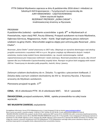 PTTK Oddział Mysłowice zaprasza w dniu 8 października 2016 dzieci i młodzież ze Szkolnych Kół Krajoznawczo – Turystycznych na wycieczkę do JURY KRAKOWSKO - CZĘSTOCHOWSKIEJ Celem wycieczki będzie REZERWAT PRZYRODY „GORA CHEŁM” i średniowiecznej strażnicy w Ryczowie. PROGRAM 8 października (sobota) – spotkanie uczestników o godz. 800 w Mysłowicach ul. Powstańców, rejon stacji PKP, Poczty Głównej. Przejazd autokarem na trasie Mysłowice, Dąbrowa Górnicza, Niegowonice, Hutki – Kanki. Stąd wędrujemy pieszo zielonym szlakiem na górę Chełm. Wierzchołek wzgórza objęty jest ochroną jako Rezerwat „Góra Chełm”. Rezerwat „Góra Chełm” został utworzony w 1957 roku. Obejmuje on wyraźnie dominujące nad okolicą jurajskie wzniesienie o wysokości 440 m n.p.m. Na górze znajduje się kilkanaście dużych i małych ostańców; można tutaj znaleźć liczne skamieniałości, np. muszle ramienionogów. Jednak najwartościowsza jest miejscowa roślinność i świat zwierzęcy. Rezerwat powołano do życia, aby chronił typowe dla Jury Krakowsko-Częstochowskiej zespoły leśne. Rosnące na górze buki osiągają wiek nawet 200 lat. Towarzyszą im dorodne jodły pospolite, świerki, klony i jawory. Zielonym szlakiem dochodzimy do m. Żelazko. Tu ognisko z pieczeniem kiełbasek. Z Żelazka dalej czarnym szlakiem dochodzimy do XIV w. Strażnicy Ryczów. Z Ryczowa wracamy do Mysłowic autokarem. Planowany przyjazd na godz. 1700 CENA; 40 zł członkowie PTTK 35 zł członkowie SKKT, 50 zł – pozostali. ŚWIADCZENIA; przejazd autokarem, NNW, opieka przewodnika na całej trasie wycieczki. WE WŁASNYM ZAKRESIE; wyżywienie Szczegółowe informacje biurze PTTK O/Mysłowice przy ul. Armii Krajowej 22 lub na stronie www.myslowice.pttk.pl Biuro czynne we wtorki i czwartki od godz. 13:00 do 17:00. Tel/faks 32 222 56 06. E-mail: [email protected] SKŁADKA ROCZNA ULGOWA dla uczących się (do 26 lat), opiekunów SKKT wynosi 20 zł, ULGOWA dla osób z orzeczoną niepełnosprawnością, bezrobotnych, emerytów wynosi 30 zł. SKŁADKA ROCZNA NORMALNA wynosi 45 zł. W przypadku nowo wstępujących obowiązuje wpisowe w wysokości 6 zł dla składki ulgowej za 20 zł, wpisowe dla składki ulgowej za 30 zł wynosi 8 zł, wpisowe dla składki normalnej 15 zł Podane ceny mogą ulec zmianie z przyczyn niezależnych od PTTK O/Mysłowice. PTTK O/Mysłowice zastrzega sobie prawo odwołania imprezy do 7 dni przed jej rozpoczęciem w przypadku braku odpowiedniej ilości uczestników imprezy.