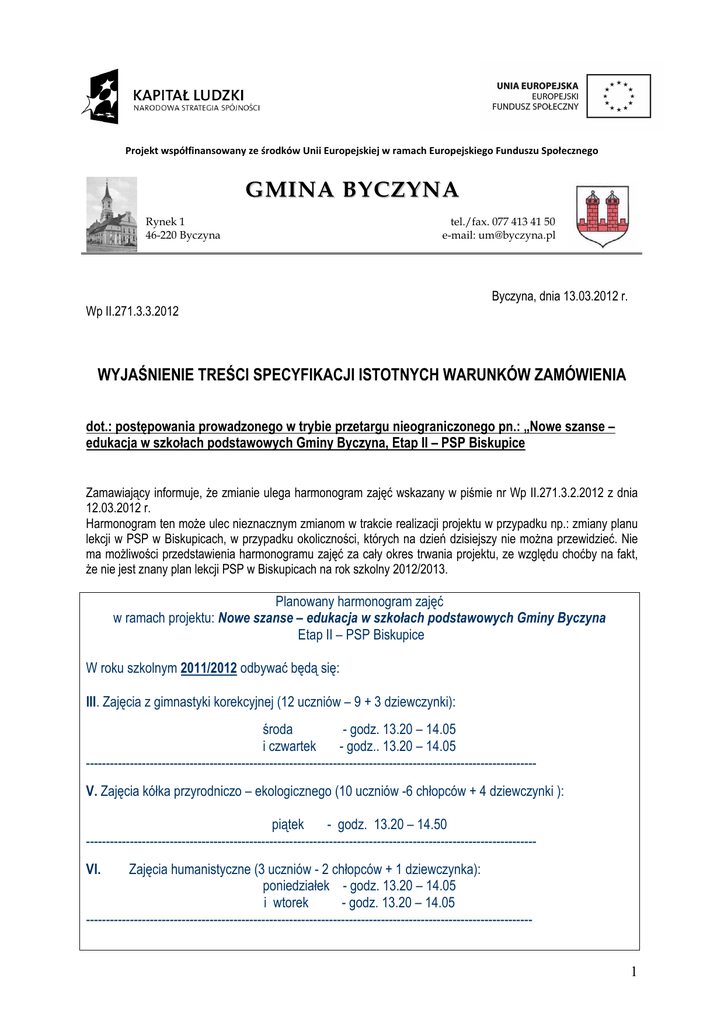 Projekt współfinansowany ze środków Unii Europejskiej w ramach Europejskiego Funduszu Społecznego GMINA BYCZYNA Rynek 1 46-220 Byczyna tel./fax. 077 413 41 50 e-mail: [email protected] Byczyna, dnia 13.03.2012 r. Wp II.271.3.3.2012 WYJAŚNIENIE TREŚCI SPECYFIKACJI ISTOTNYCH WARUNKÓW ZAMÓWIENIA dot.: postępowania prowadzonego w trybie przetargu nieograniczonego pn.: „Nowe szanse – edukacja w szkołach podstawowych Gminy Byczyna, Etap II – PSP Biskupice Zamawiający informuje, Ŝe zmianie ulega harmonogram zajęć wskazany w piśmie nr Wp II.271.3.2.2012 z dnia 12.03.2012 r. Harmonogram ten moŜe ulec nieznacznym zmianom w trakcie realizacji projektu w przypadku np.: zmiany planu lekcji w PSP w Biskupicach, w przypadku okoliczności, których na dzień dzisiejszy nie moŜna przewidzieć. Nie ma moŜliwości przedstawienia harmonogramu zajęć za cały okres trwania projektu, ze względu choćby na fakt, Ŝe nie jest znany plan lekcji PSP w Biskupicach na rok szkolny 2012/2013. Planowany harmonogram zajęć w ramach projektu: Nowe szanse – edukacja w szkołach podstawowych Gminy Byczyna Etap II – PSP Biskupice W roku szkolnym 2011/2012 odbywać będą się: III. Zajęcia z gimnastyki korekcyjnej (12 uczniów – 9 + 3 dziewczynki): środa - godz. 13.20 – 14.05 i czwartek - godz.. 13.20 – 14.05 ----------------------------------------------------------------------------------------------------------------V. Zajęcia kółka przyrodniczo – ekologicznego (10 uczniów -6 chłopców + 4 dziewczynki ): piątek - godz. 13.20 – 14.50 ----------------------------------------------------------------------------------------------------------------VI. Zajęcia humanistyczne (3 uczniów - 2 chłopców + 1 dziewczynka): poniedziałek - godz. 13.20 – 14.05 i wtorek - godz. 13.20 – 14.05 ---------------------------------------------------------------------------------------------------------------- 1 VII. Zajęcia matematyczne (3 uczniów - 2 chłopców +1 dziewczynka): piątek - godz. 13.20 – 14.50 Zamawiający informuje równieŜ, Ŝe realizacja zajęć nie wymienionych w harmonogramie, zacznie się od września 2012 r. 2